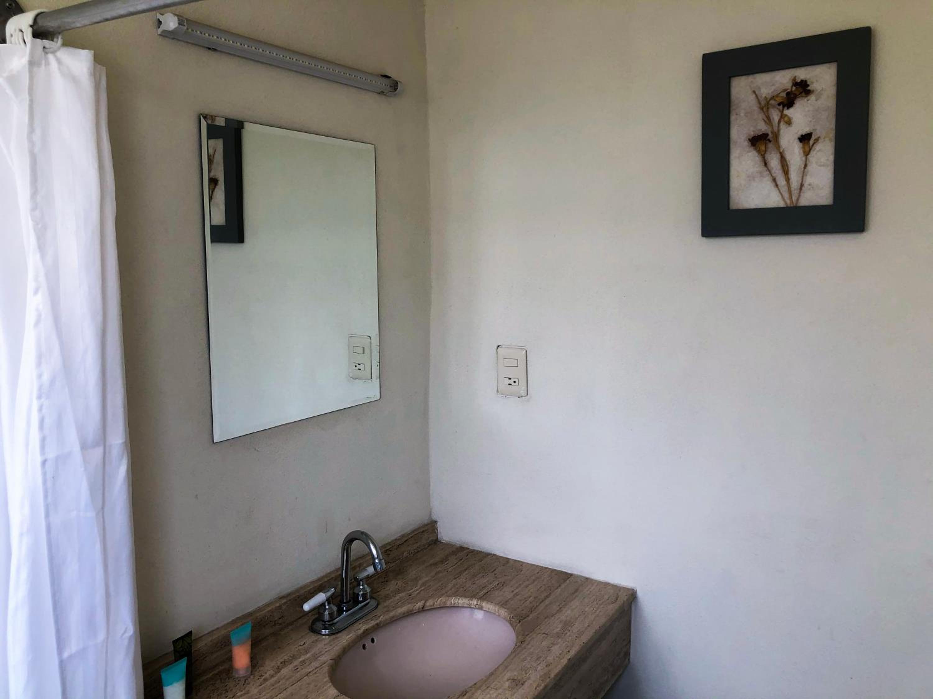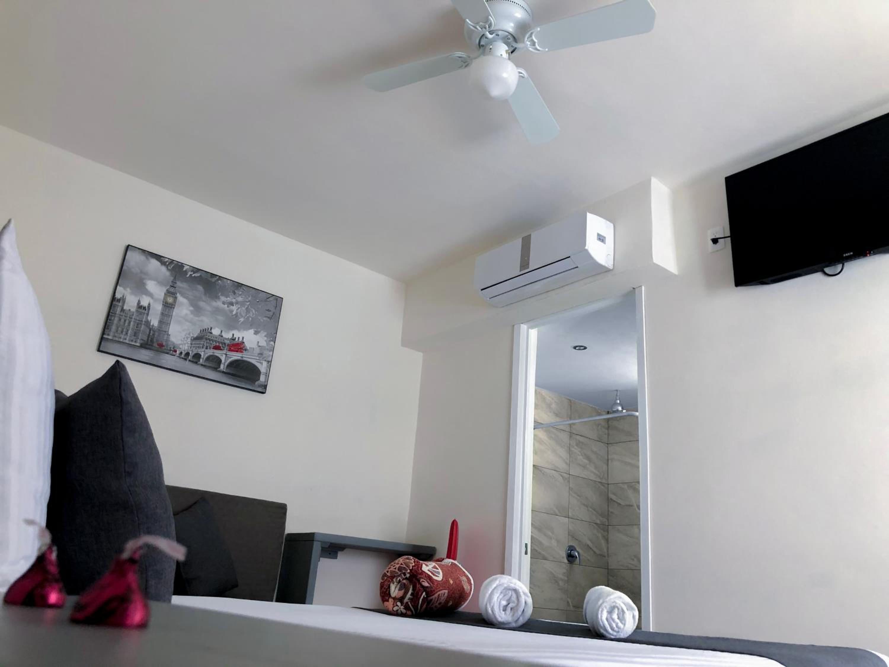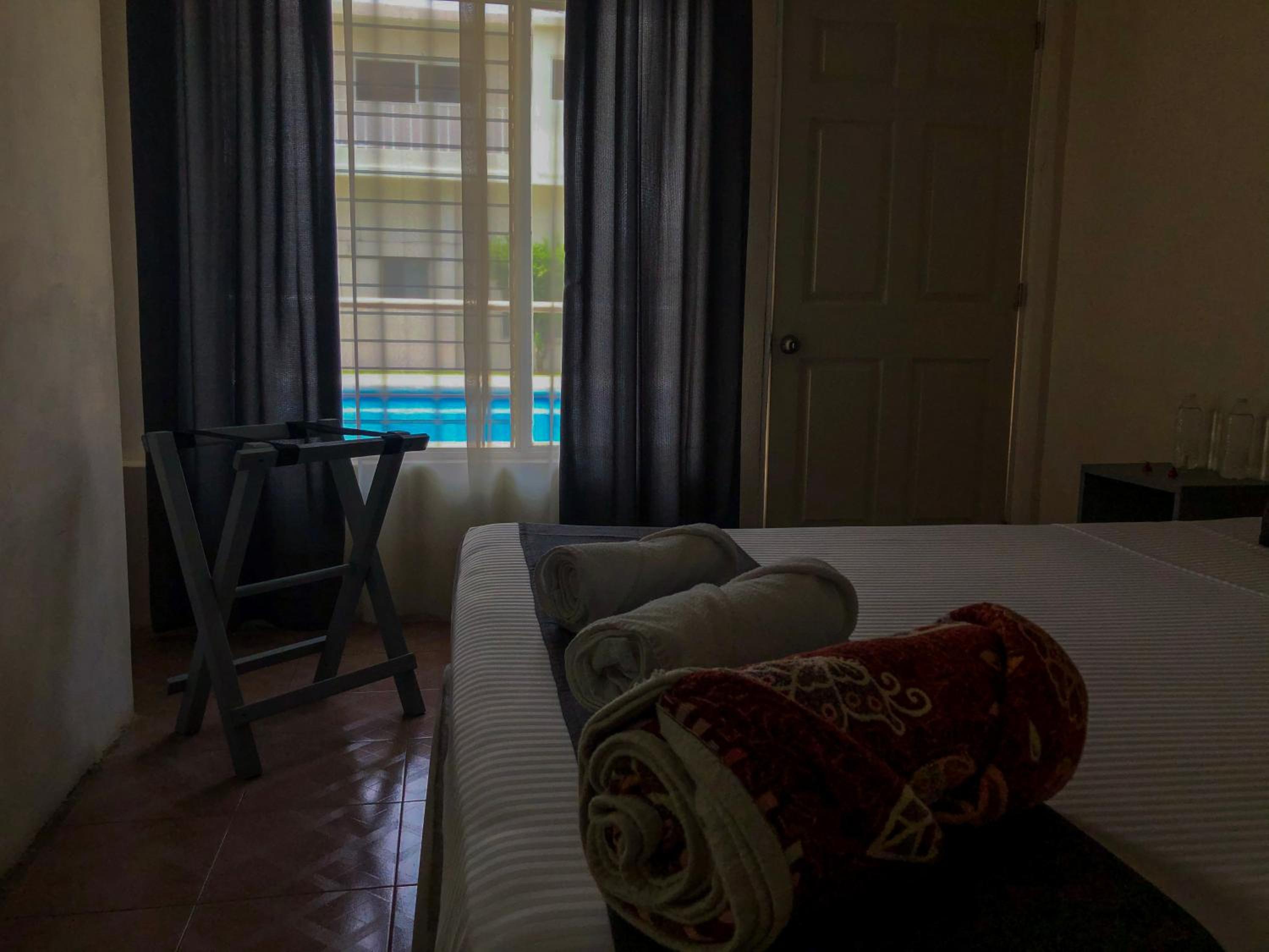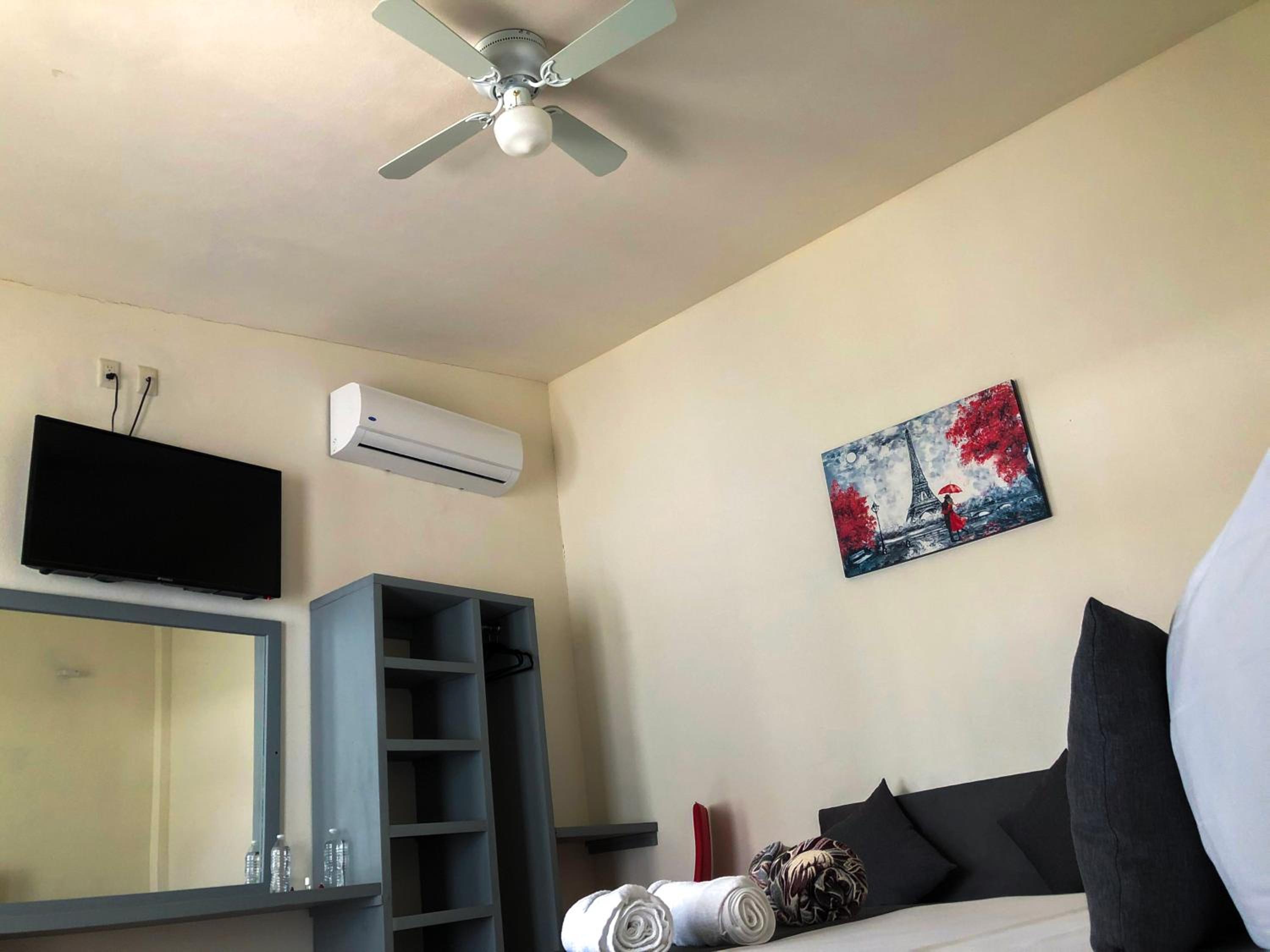 No me gusto q la tele esta muy alta y el sonido hace eco, me prometieron bajar un ventilador y nunca regresaron. El aire q tenian la manguera estaba afuera. Baño muy chico, no tenia microondas ni refrigerator. El cuarto muy chiquito. Y se paga mas q un hotel. No tienen bote de basura en el cuarto solo en el baño. La Cortina estaba enrrollada y se veia todo desde afuera. Para el precio todo muy mal.