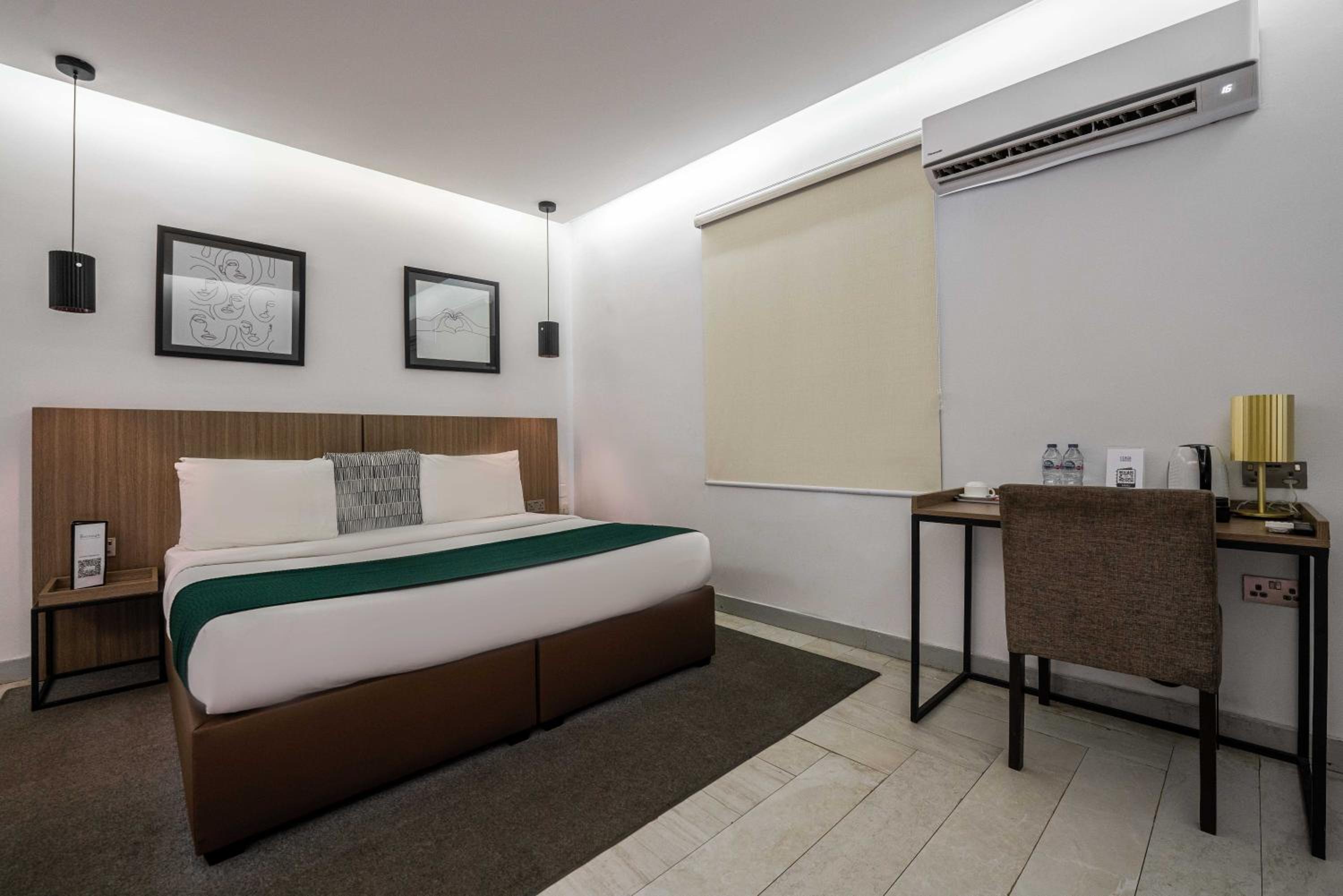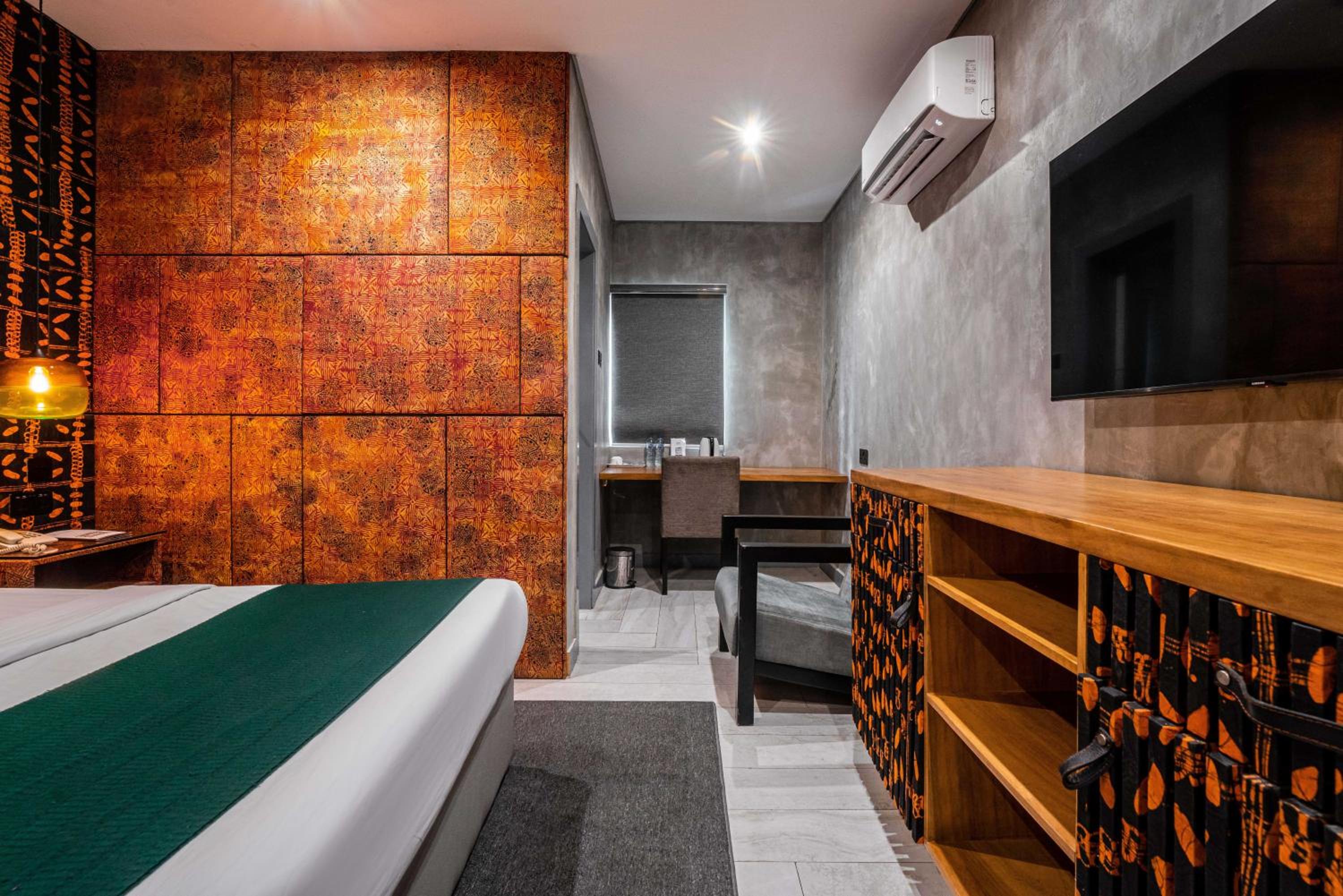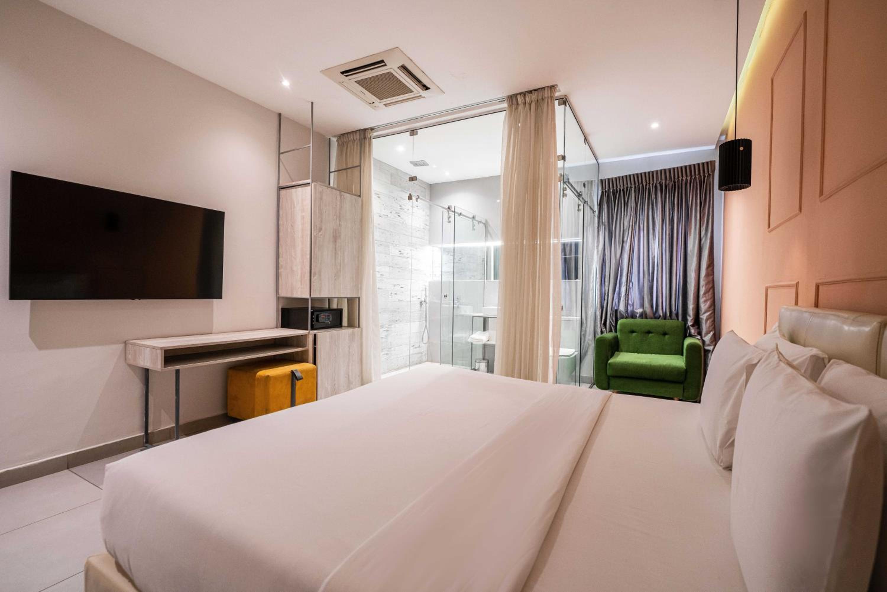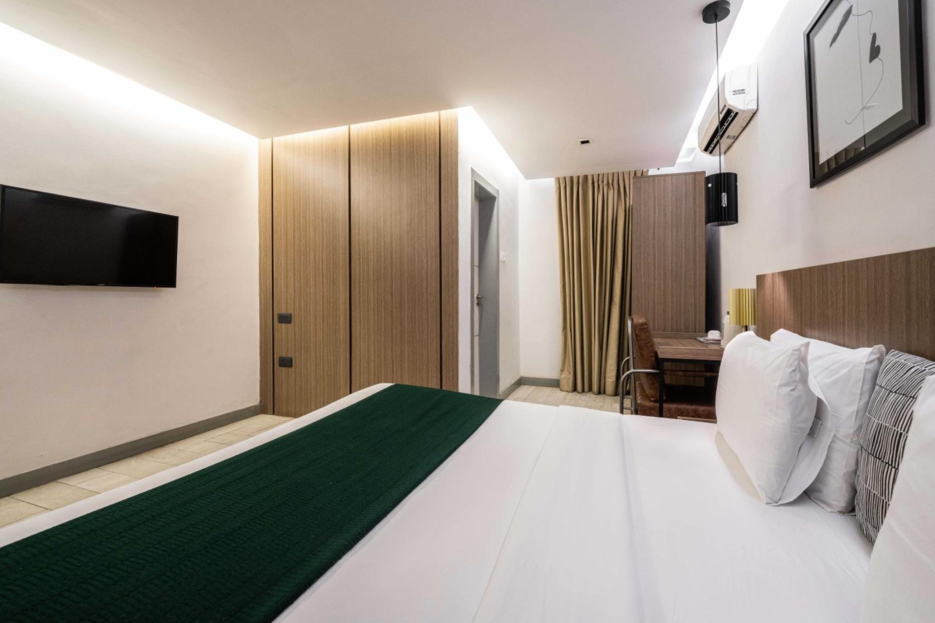 The Borough Lagos offers elegant rooms with modern amenities including air conditioning, flat-screen TVs, and free WiFi. Guests can enjoy a comfortable stay with room service and a 24-hour front desk available.