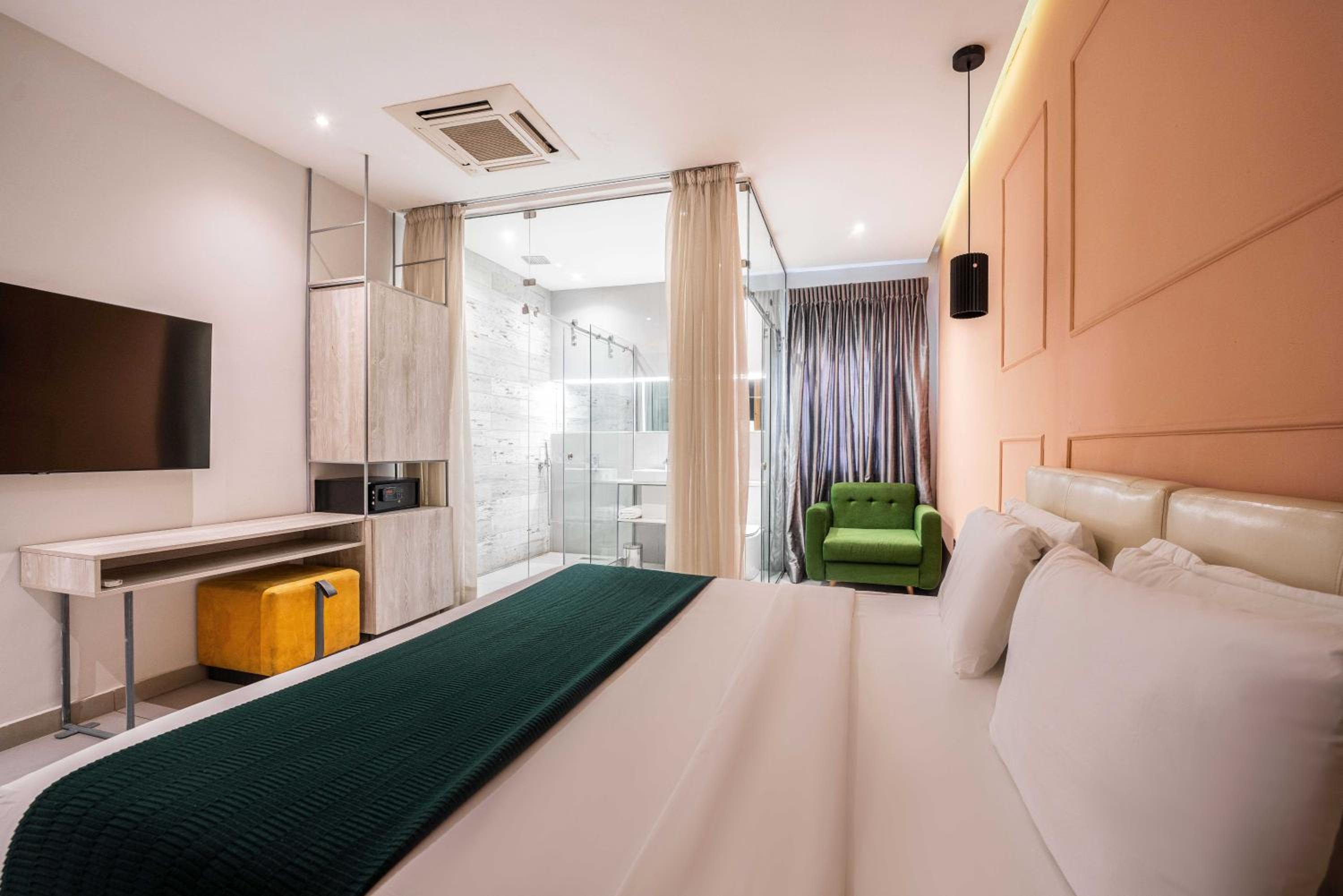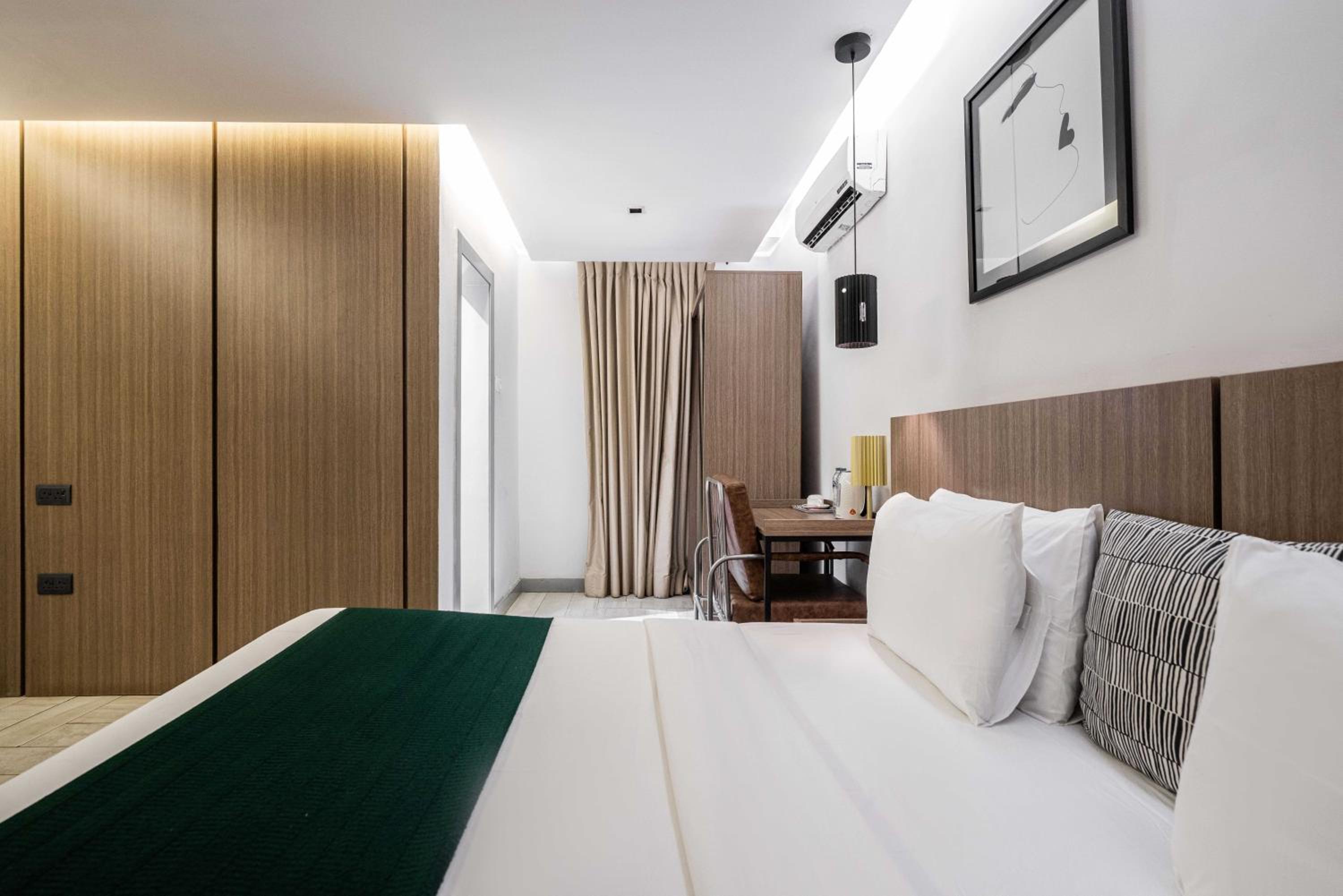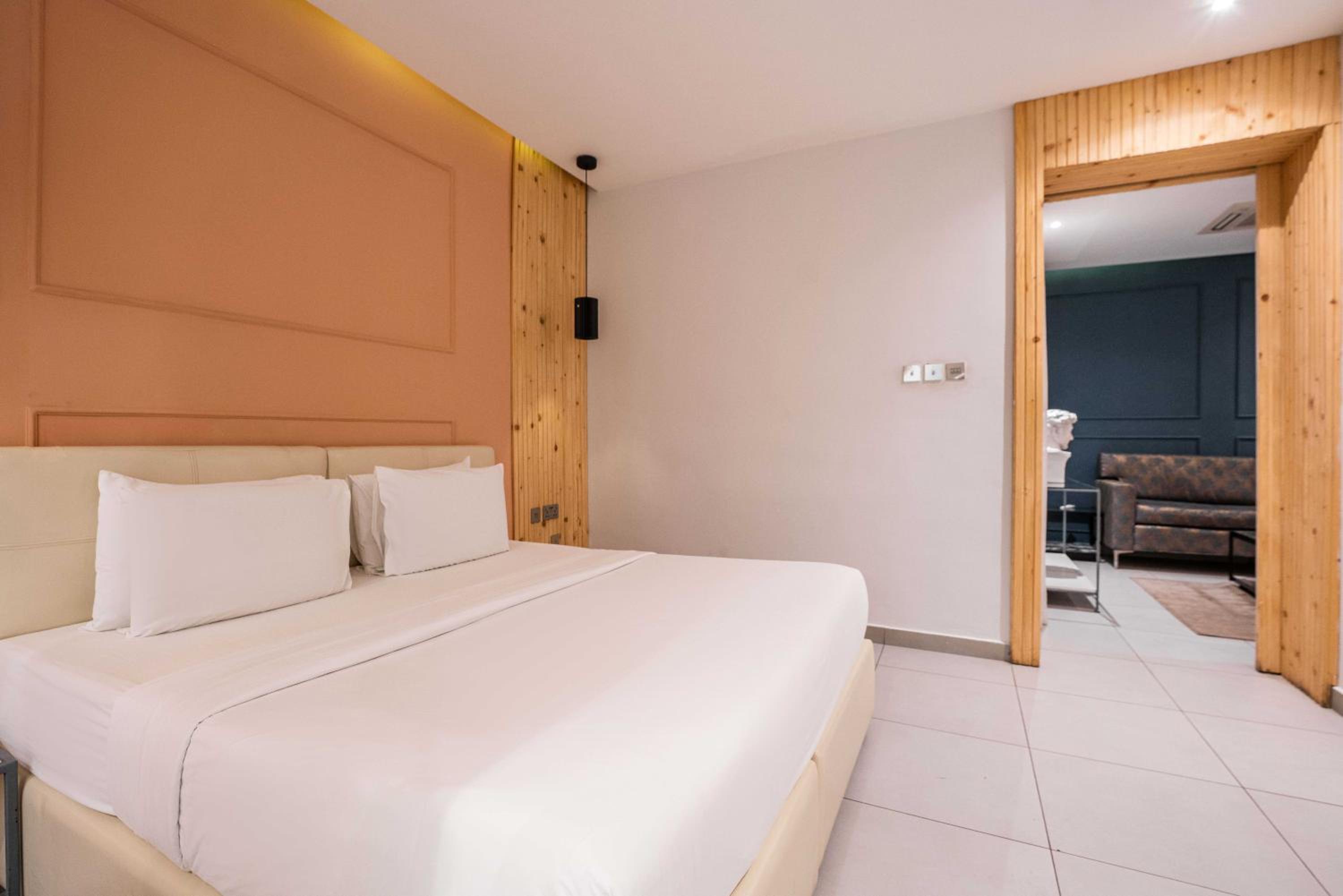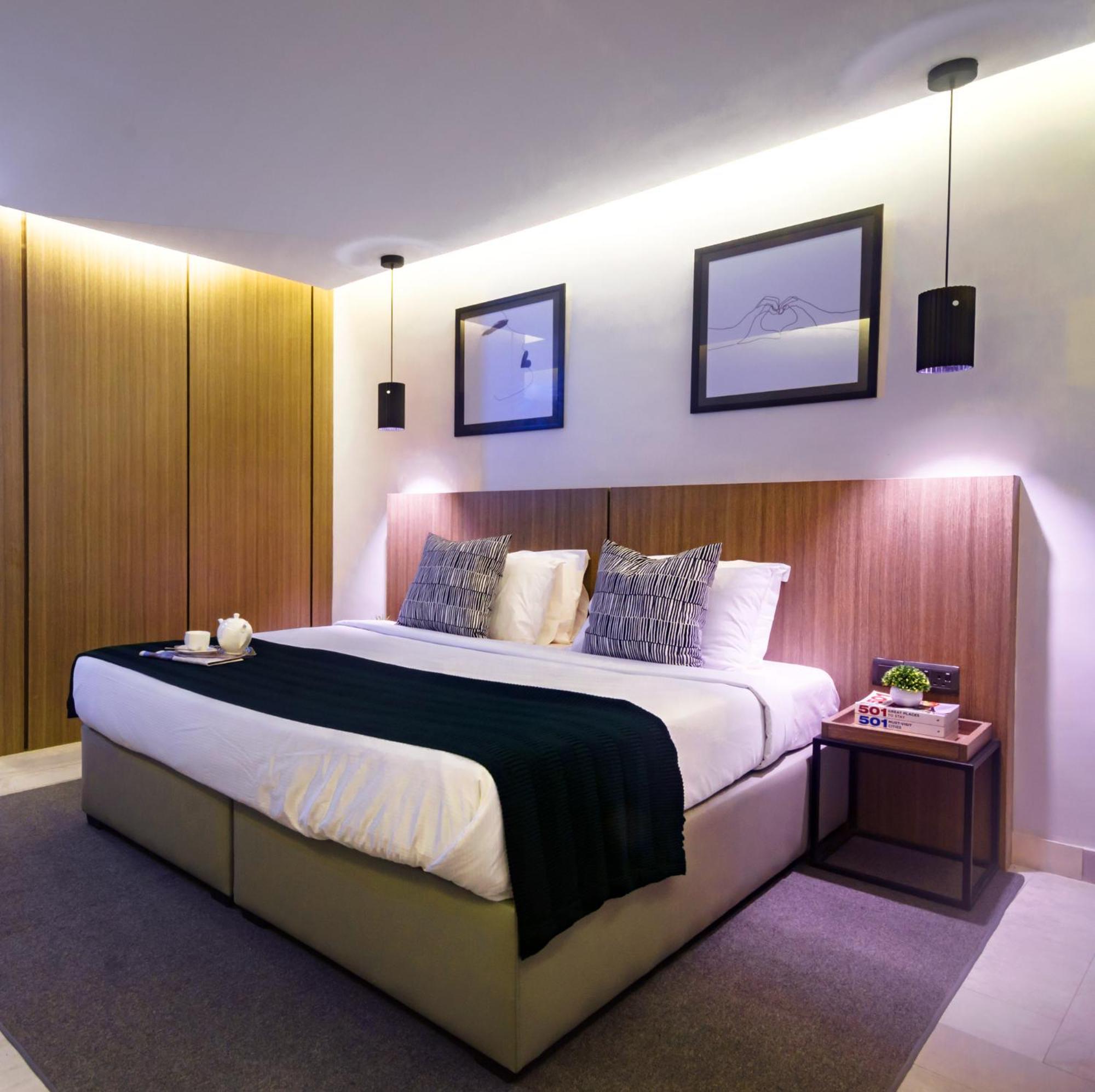 The Borough Lagos offers elegant rooms with modern amenities including air conditioning, flat-screen TVs, and free WiFi. Guests can enjoy a comfortable stay with room service and a 24-hour front desk available.