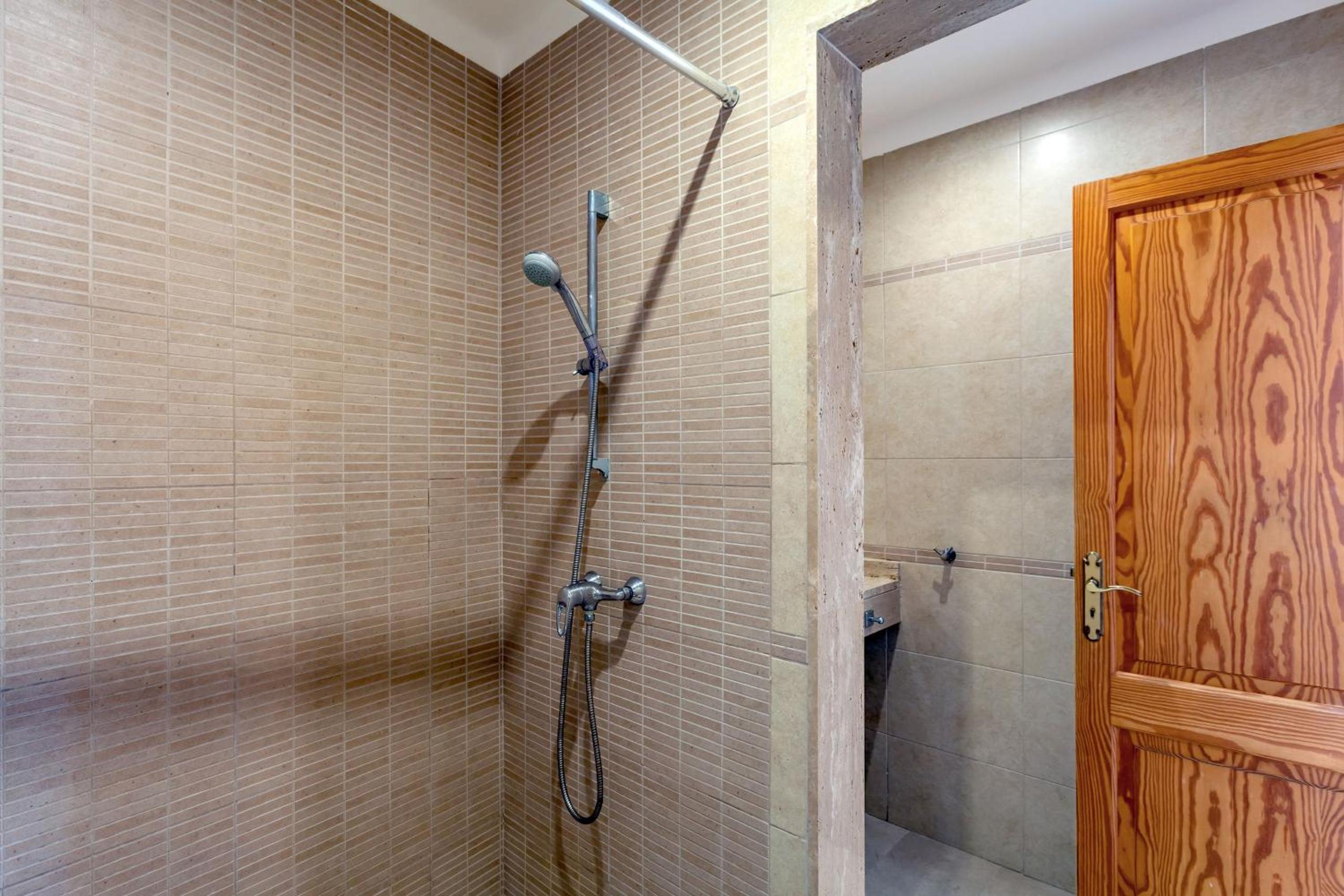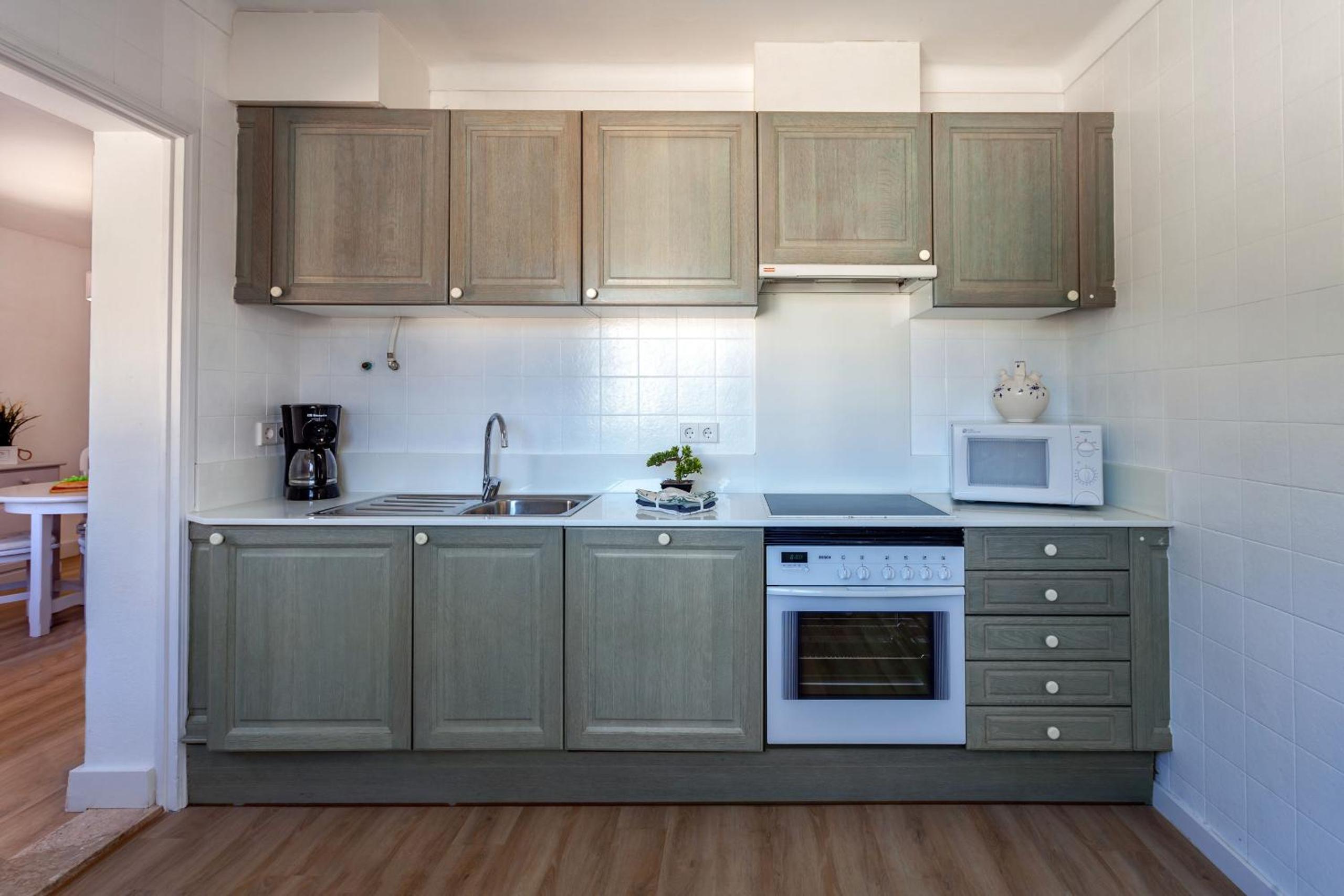 Fully Equipped: The apartment features a spacious seating area, a full kitchen with modern amenities including a microwave and an oven, and a private bathroom with a refreshing shower.