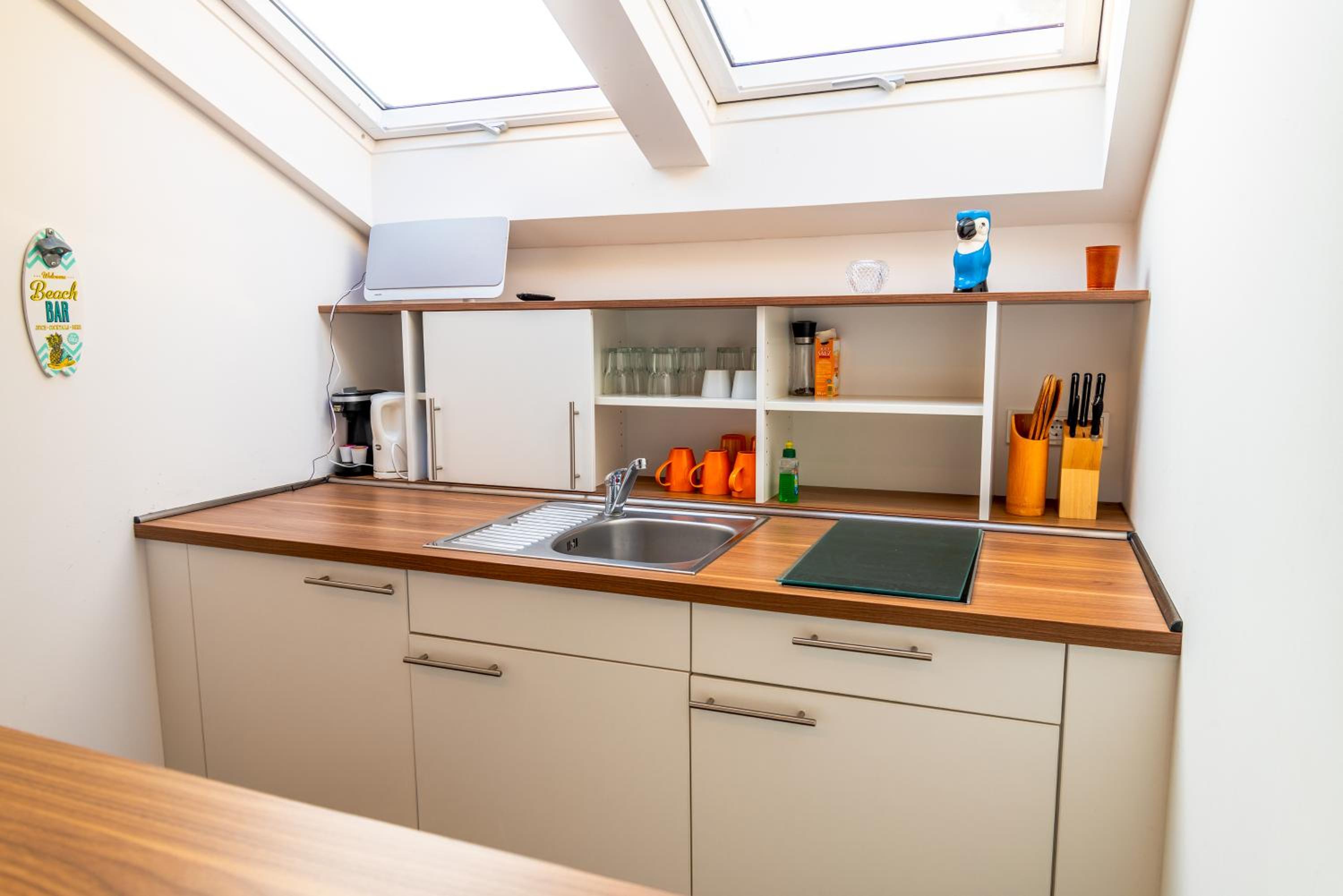 Ein Toaster wäre noch schön gewesen und vielleicht etwas mehr Geschirr (kleine Schüsseln für Müsli z.B.), aber dies nur als Verbesserungsvorschlag, nicht als Kritik!