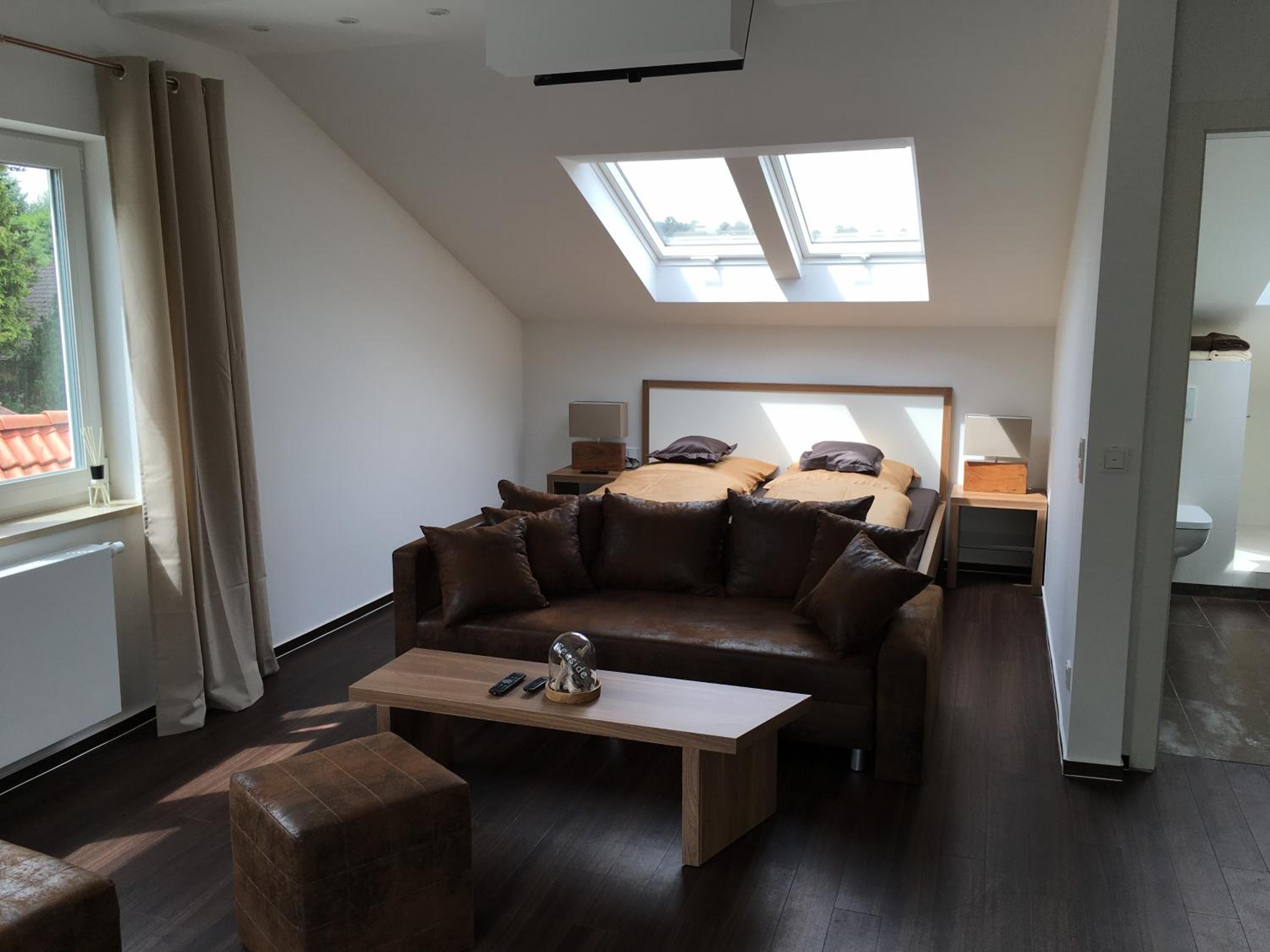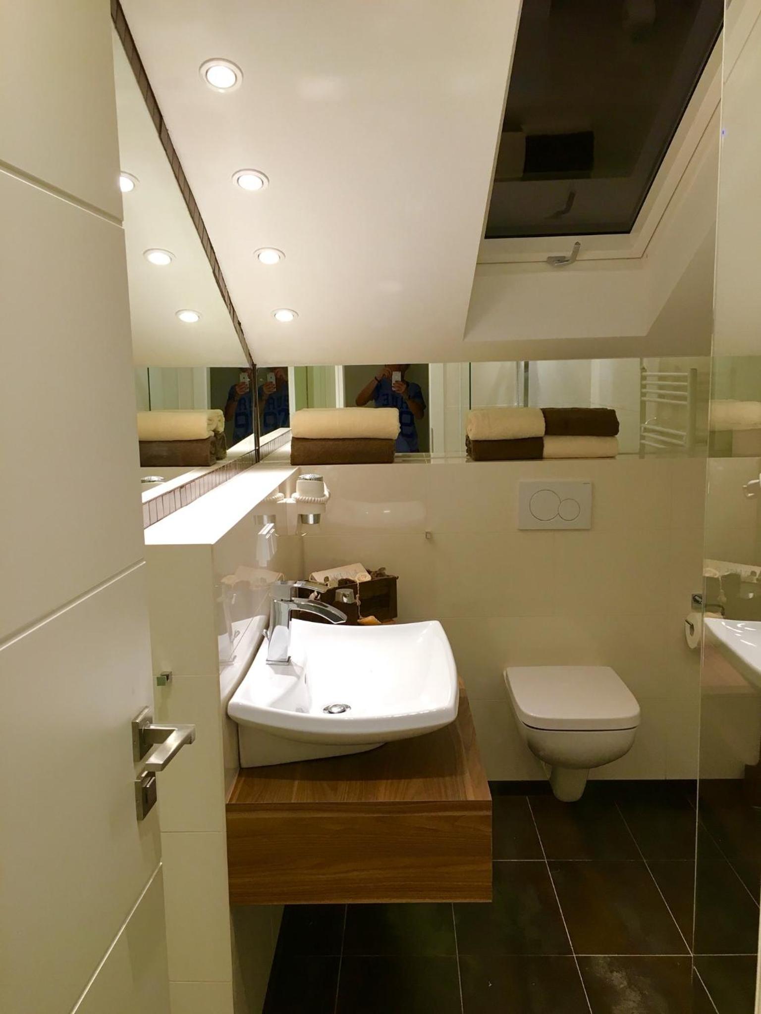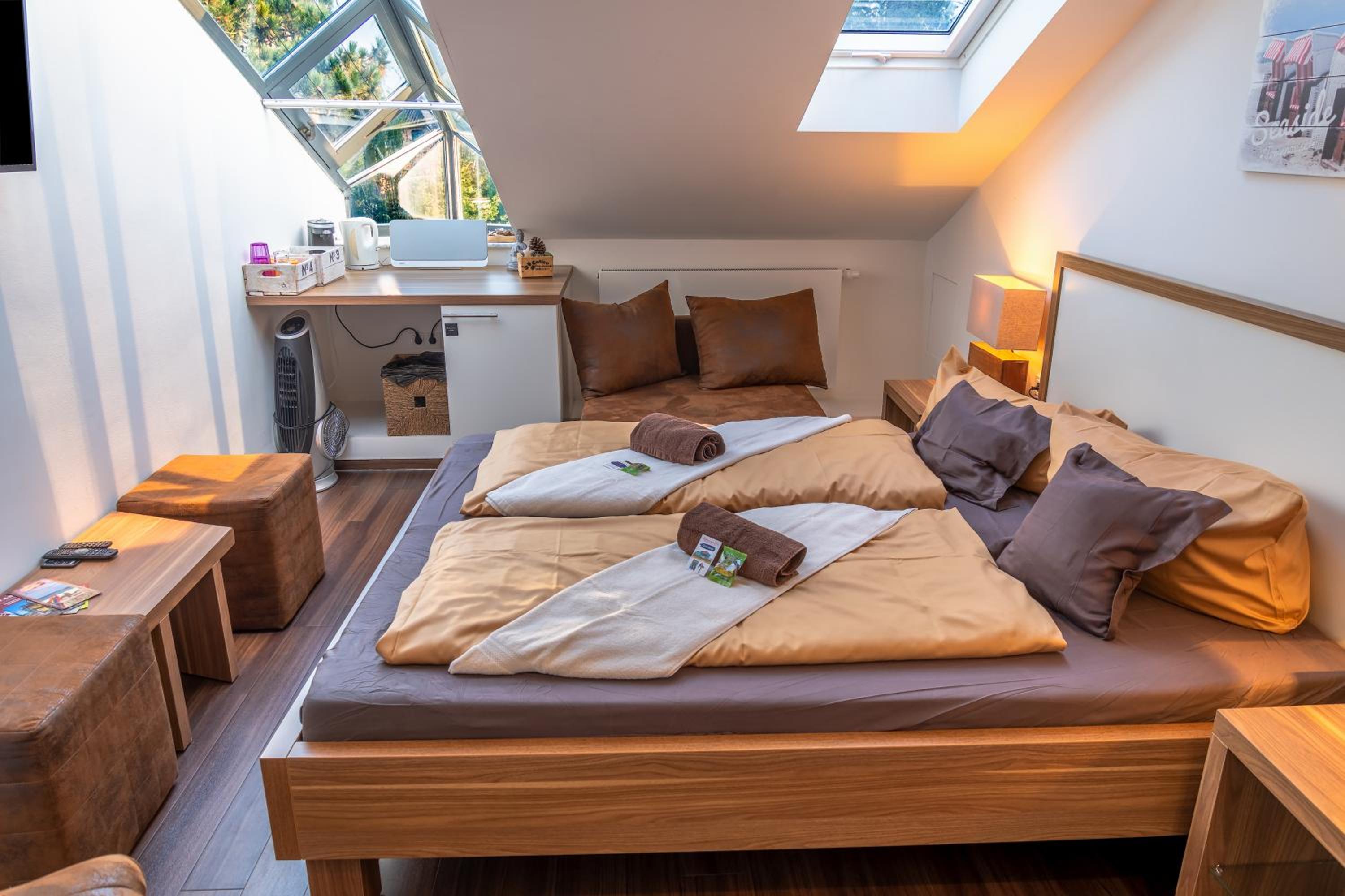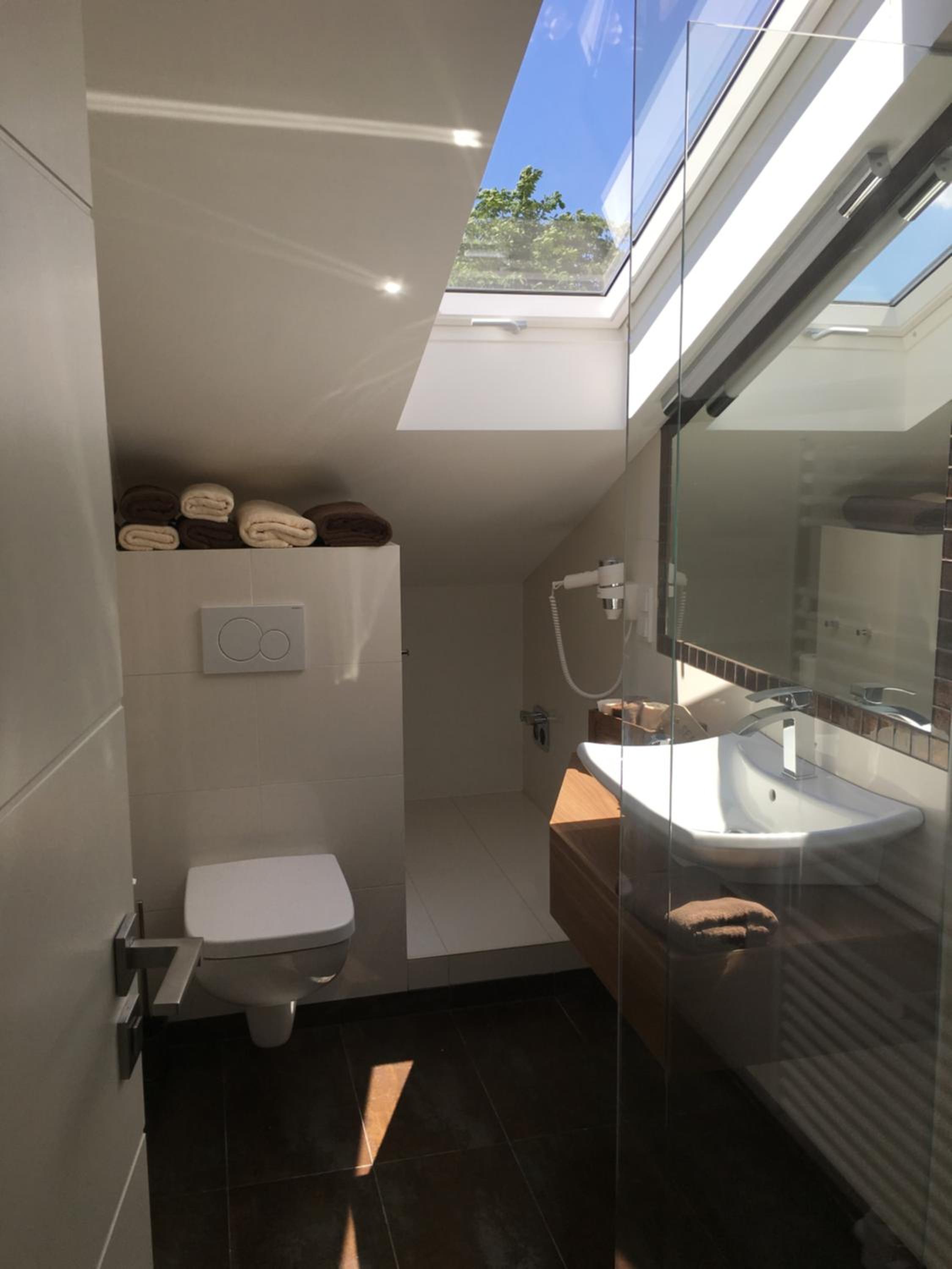 Das Bett war leider recht unbequem ohne richtige Kopfkissen, außerdem konnten die Dachflächenfenster des Zimmers und des Badezimmers nicht abgedunkelt werden.