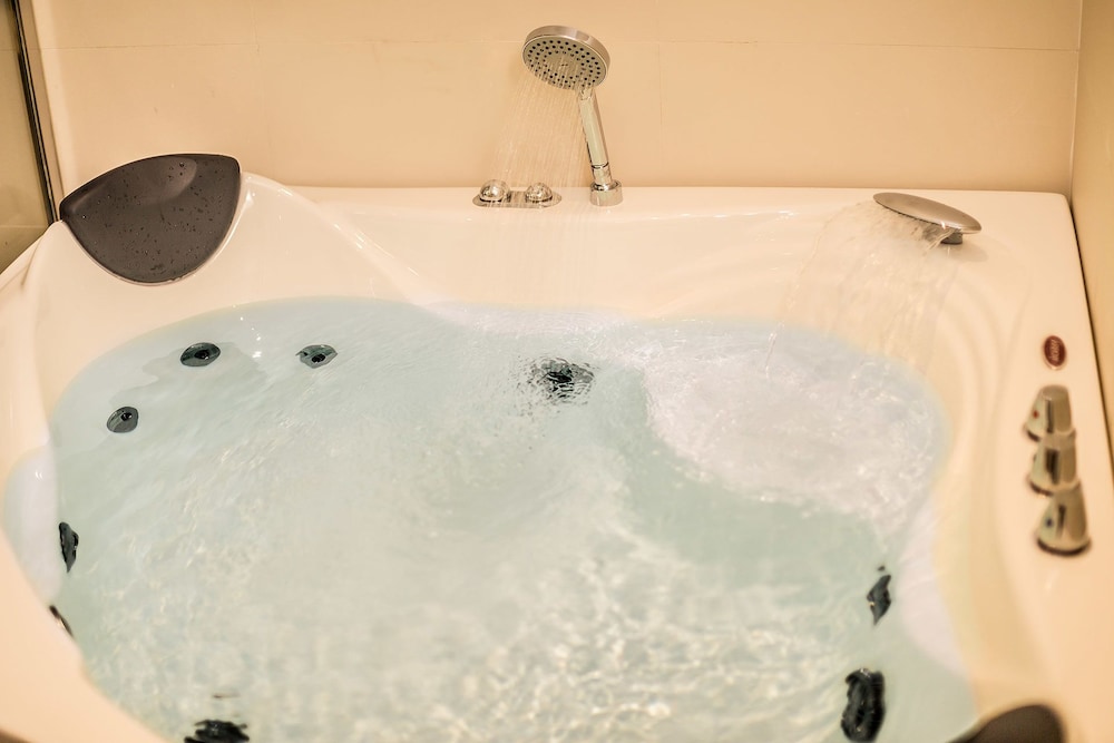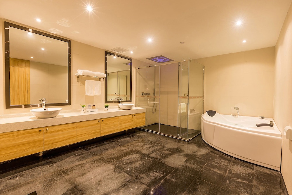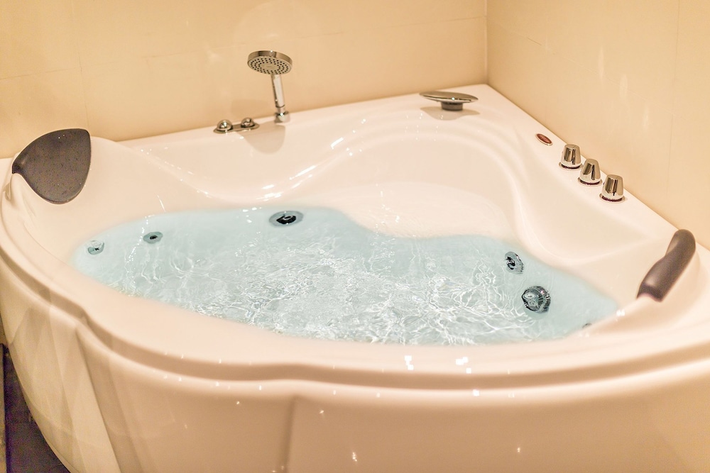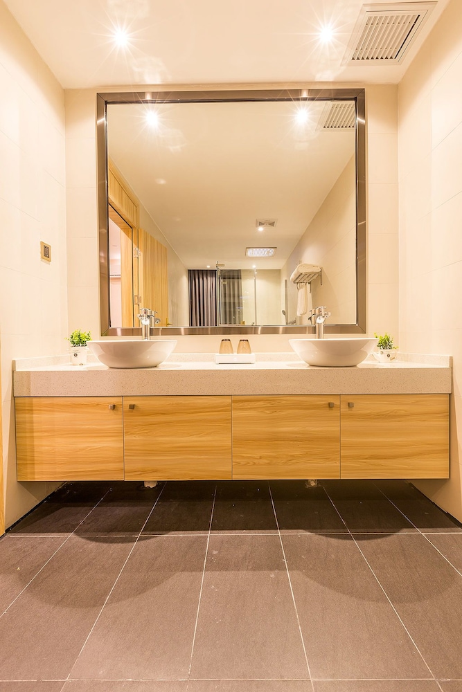 The entrance to the hotel was rather nondescript, and the lobby was small. Check in was quick, though when asked about the extra large king bed the reply was a look of extreme puzzlement, that was when we realized we have been duped by Expedia. The assigned room opened to a very pleasant looking decor, showing sign of recent refurbishment. However, closer inspection revealed poor workmanship/material, not helped by poor maintenance and inconsiderate guests, supposedly non-smoking, with cigarette butt burns in the carpet, and worn areas around. The bed was a regular king, firm with 4 pillows. There was a cushioned window seat that ran wall to wall, a small round table, no other seating. Flat screen TV and air-conditioner/heater both looked fairly new and worked well. A kettle with 4 tea bags, 2 free bottled water and some snacks that were priced. A hair dryer was provided, but no bar fridge or room safe. 2 bedroom slippers were provided. The bathroom was a good size with an enclosed shower, t