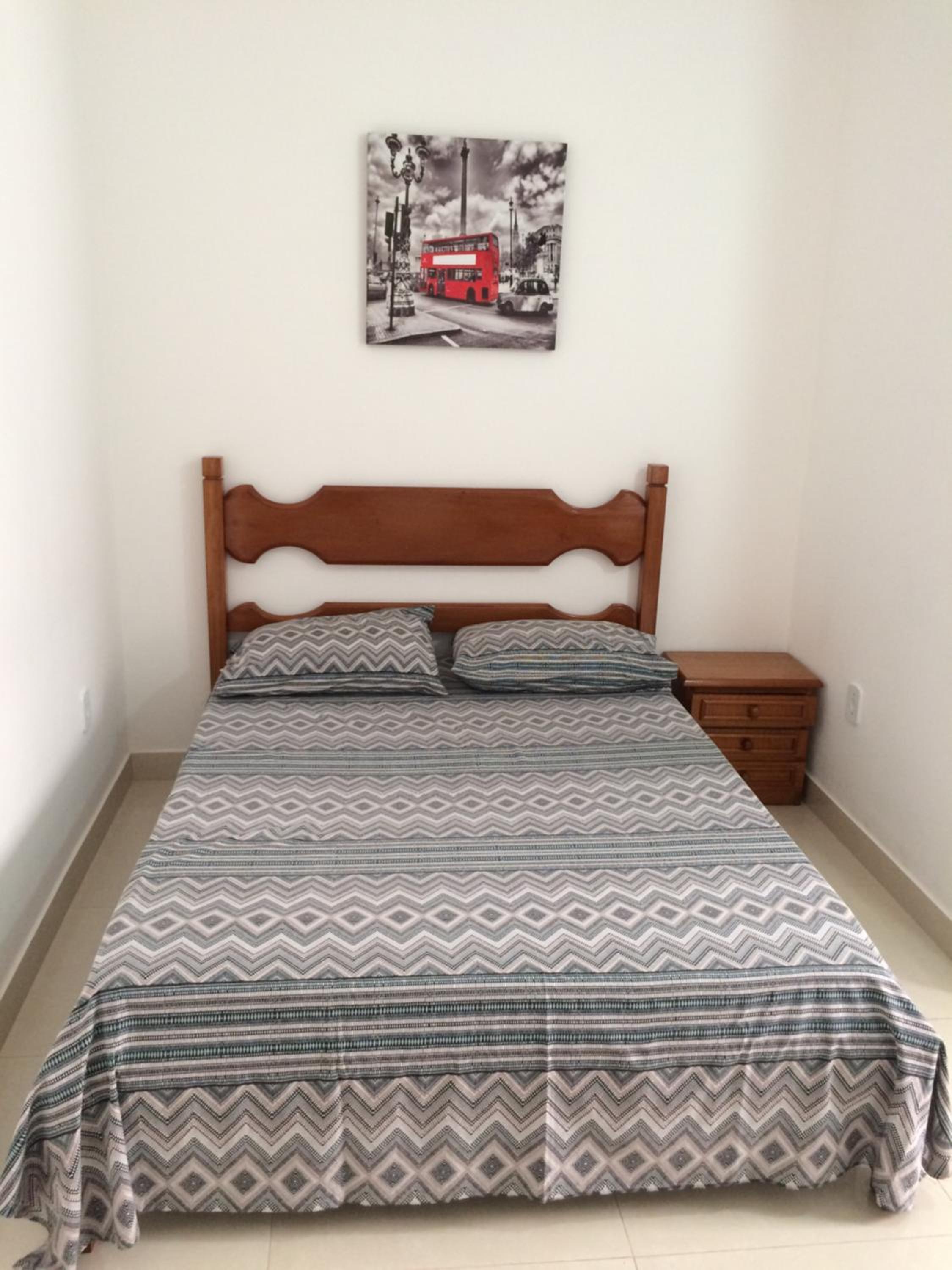 Não tem mesinha ao lado da cama.