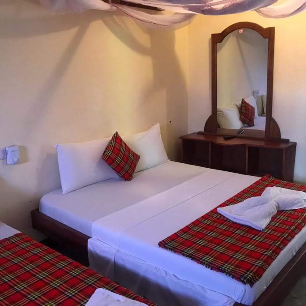 I was quite upset when we checked in and were told for 2 of our 3 nights, we would have 1 rm with 2 queen beds, instead of the 2 adjoining rooms I'd reserved and paid for on the booking site. But the manager was very willing to compensate us for the lost room according to our requests - we got a delicious meal and tour of a spice farm with transport from the hotel. The rooms are a bit old and run-down, especially bathrooms, but were clean and had good Windows and Ac. The rooftop terrace for meals is lovely, and the included hot breakfast was quite good, especially the fresh juice, fruit and the crepes they made one morning, and all the staff were kind and friendly. It is hard to find, especially since there was no sign, but other than some traffic noise from nearby busy road, location is good- ten minute walk on waterfront from Forodhani Gardens/old fort, and five from terminal for the fast ferries from Dar. Overall, it was a great place for us with our two young kids (5 and 8)-- as long as you can be a bit flexible, I'd recommend it.