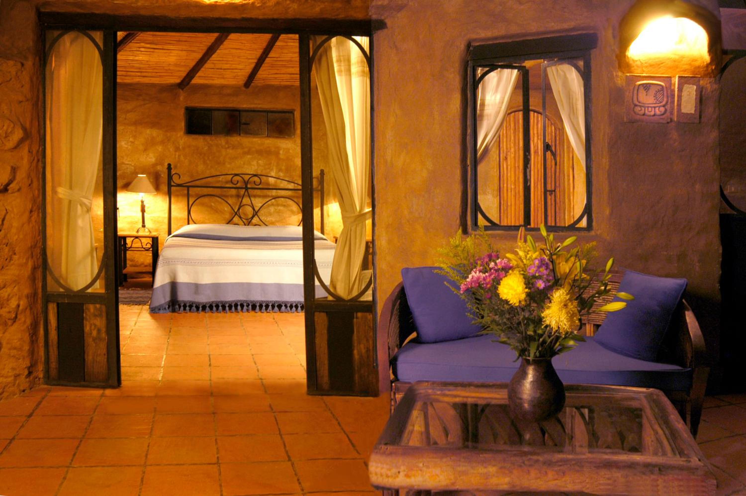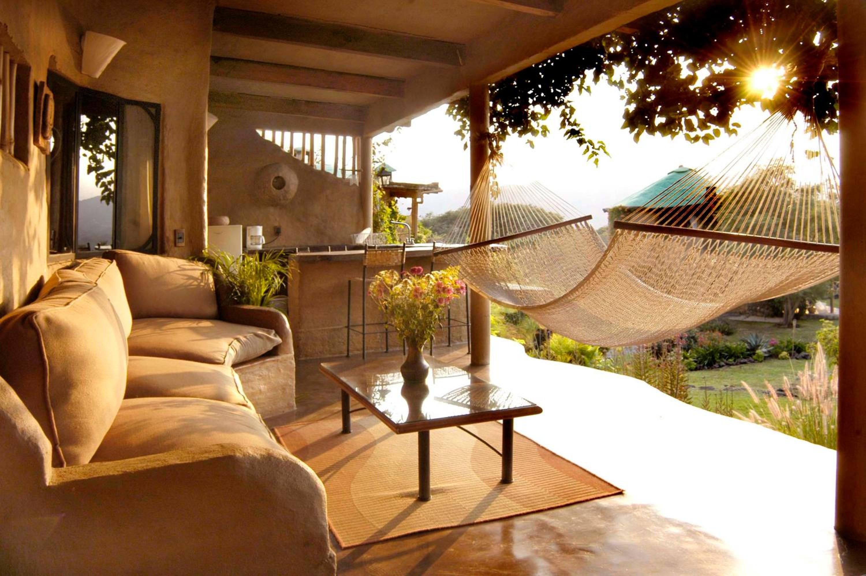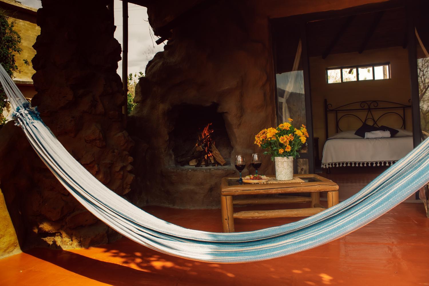 Each rustic suite at Valle Místico offers a private terrace with hammocks, ideal for soaking in the tranquil surroundings with the majestic Otlahyo Mountain as a backdrop. The suites also feature a separate seating area with a sofa and fireplace, along with convenient amenities like a coffee maker and fridge.