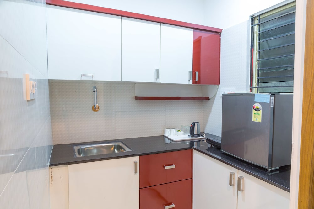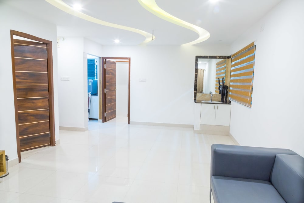 The room was not like an apartment kitchen there was less kitchenette, no water source for cooking, one plugpoints for multi gadgets no ceiling fan in the living area only stand fan. Have to purchase everything. Een no dish wash liquid provided to clean plates. Bathroom was not that clean. The floor always feels oily because no ventilation there. Also in images they showed l shape sofa in the family room but in our living room sane normal 2 seater sofa was available. After admingvthey told they will change but no response. Room also no sifa