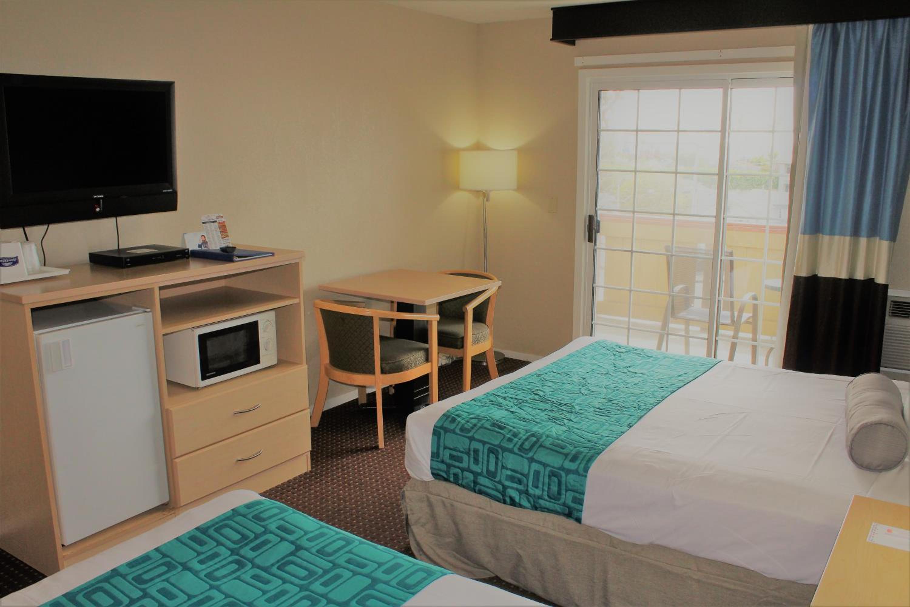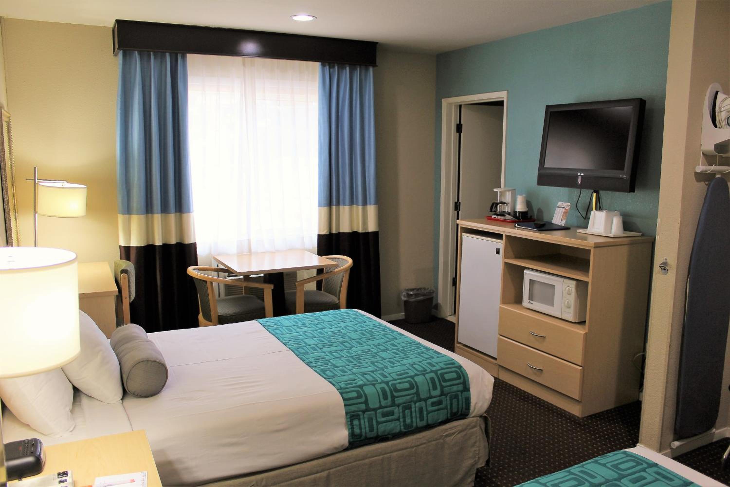 Each room is equipped with a flat-screen TV, fridge, and microwave for your convenience. The bright and cozy rooms ensure a comfortable stay for all guests.