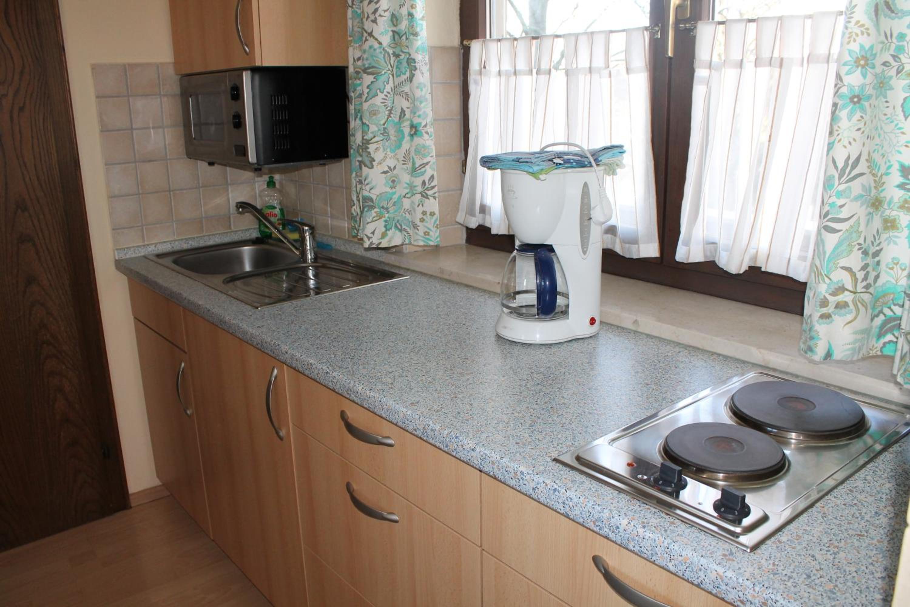 Das Zimmer war mit einer gut ausgestatteten Küchenzeile und einer Sitzecke ein perfekter Erholungsort für uns. Wir hatten ein Zimmer zur Therme mit großem Balkon.