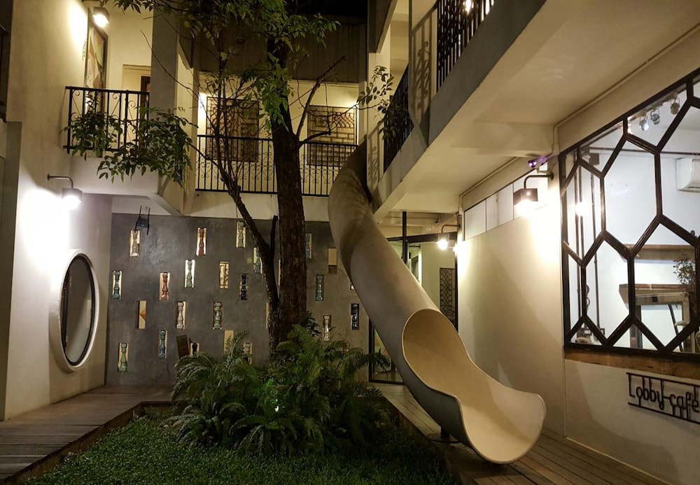 Great location with a slider from the 2nd floor to in front of the hotel