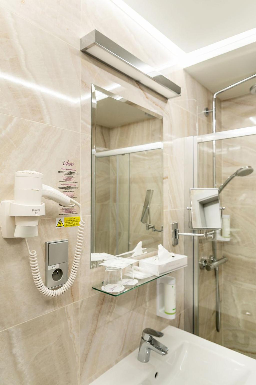 Ametyst Praha offers upscale boutique rooms in Vinohrady, featuring modern amenities like LCD TVs, minibars, and free Wi-Fi. Enjoy a comfortable stay with air-conditioned rooms and elegant bathrooms equipped with all essentials.