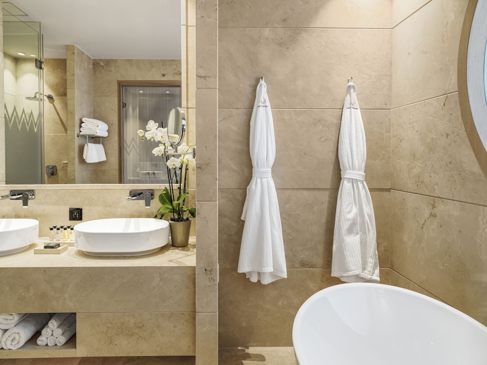 The hotel is beautiful, spacious rooms, very clean, nice bathrooms. About 20 min drive from the city, not much around