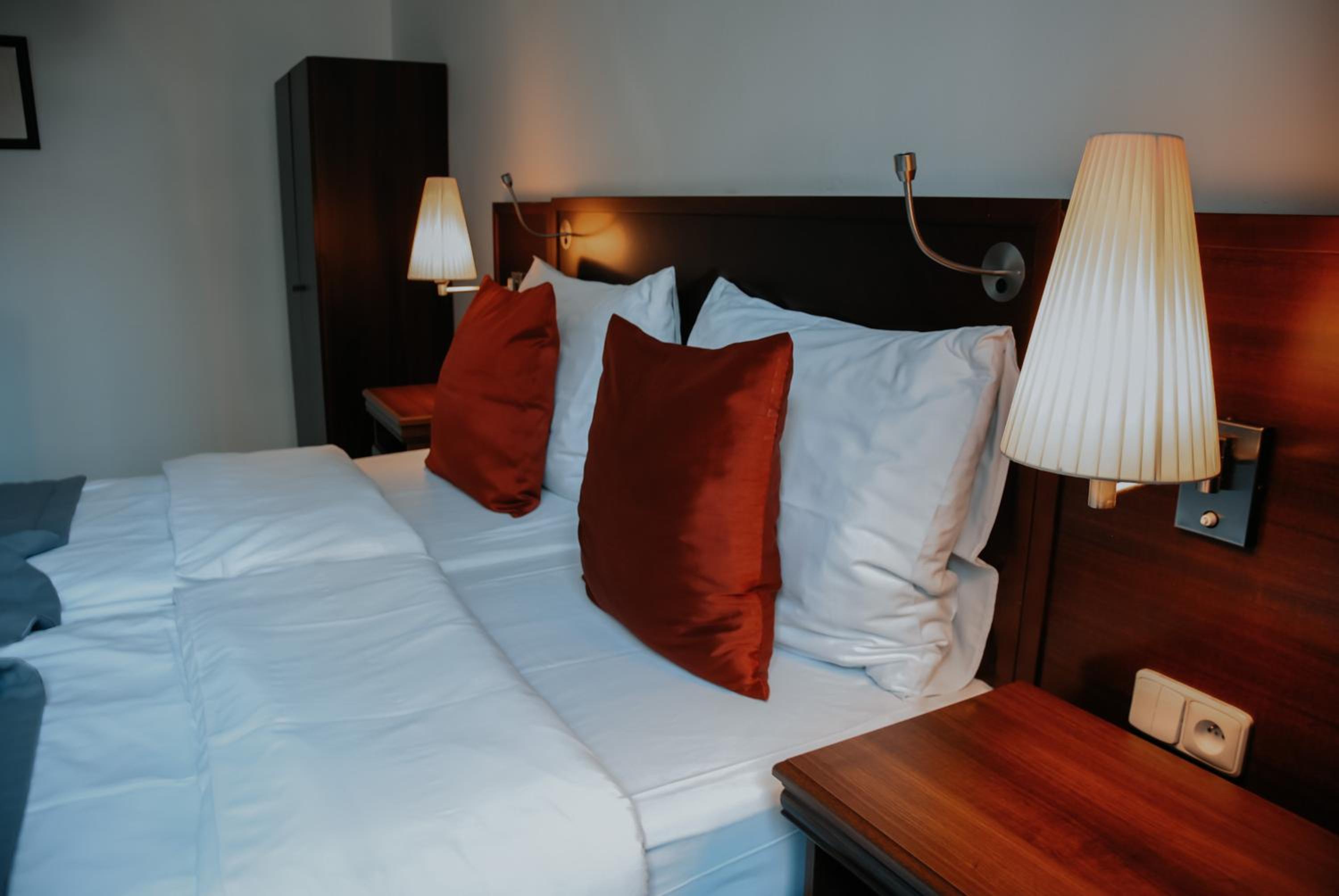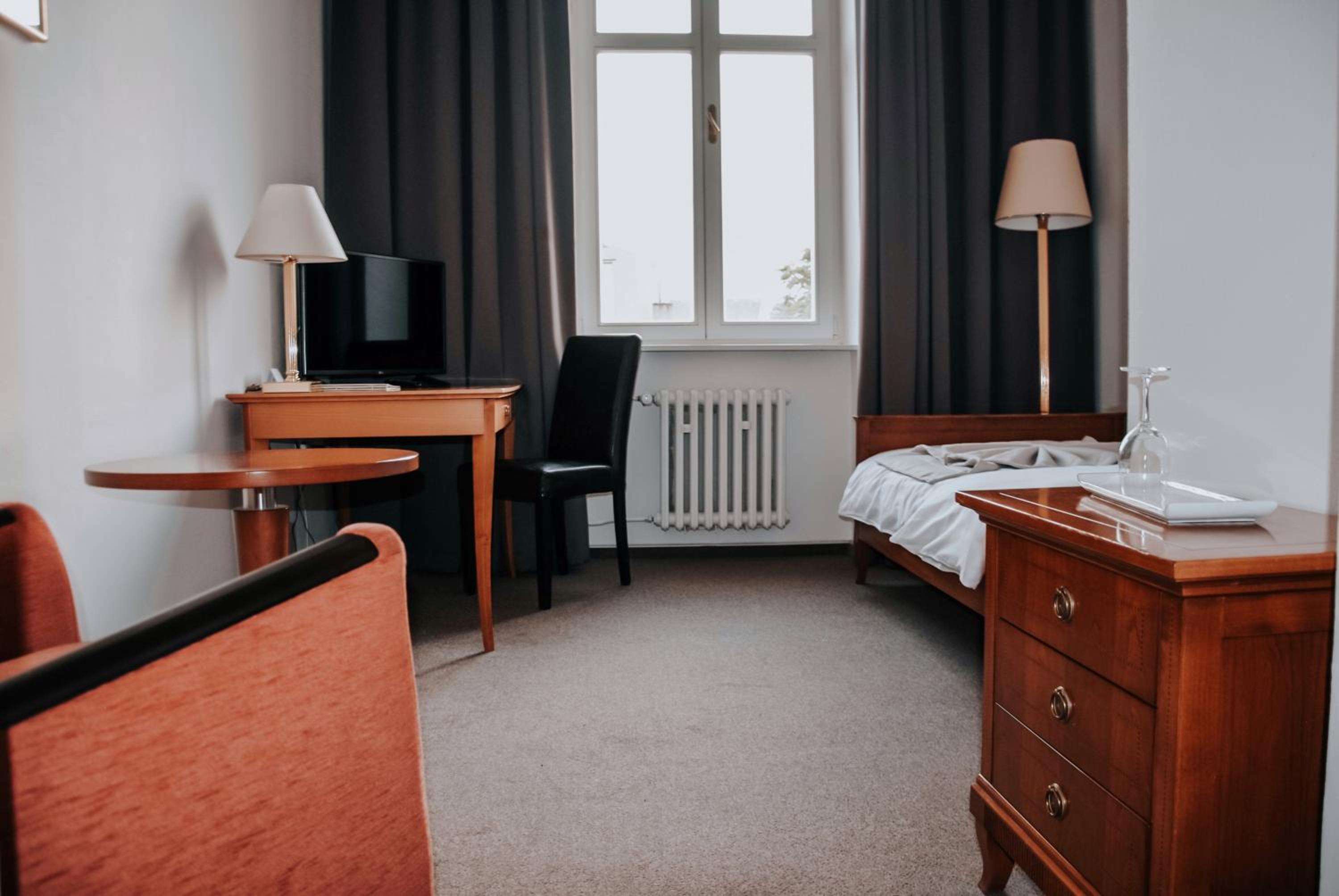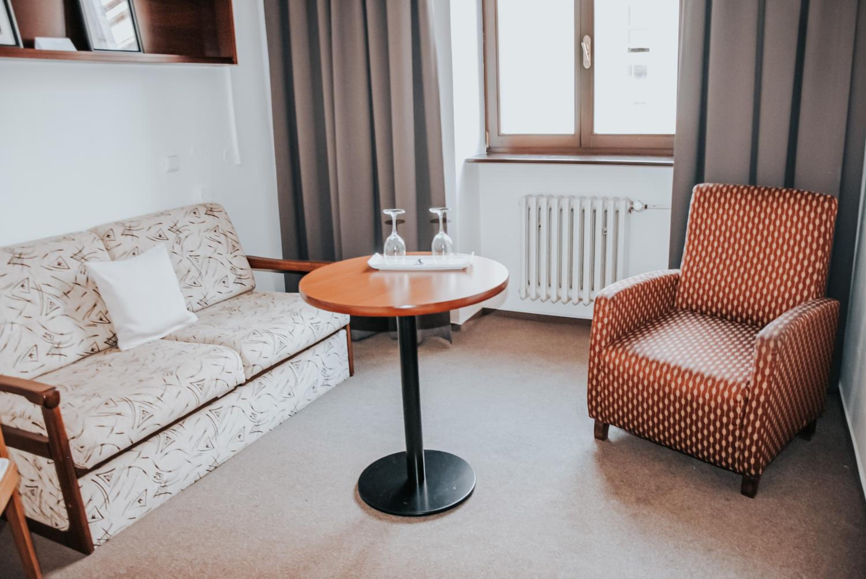 Hotel je v centru města, historická budova, hezké prostředí. Snídaně byla velmi slušný standard - bufetová. Pokoje jsou velké a modernizované, vybavení dostačující. Na pokoji byla k dispozici rychlovarná konvice s čajem a instantní kávou. Dobré instrukce pro bezobslužné ubytování.