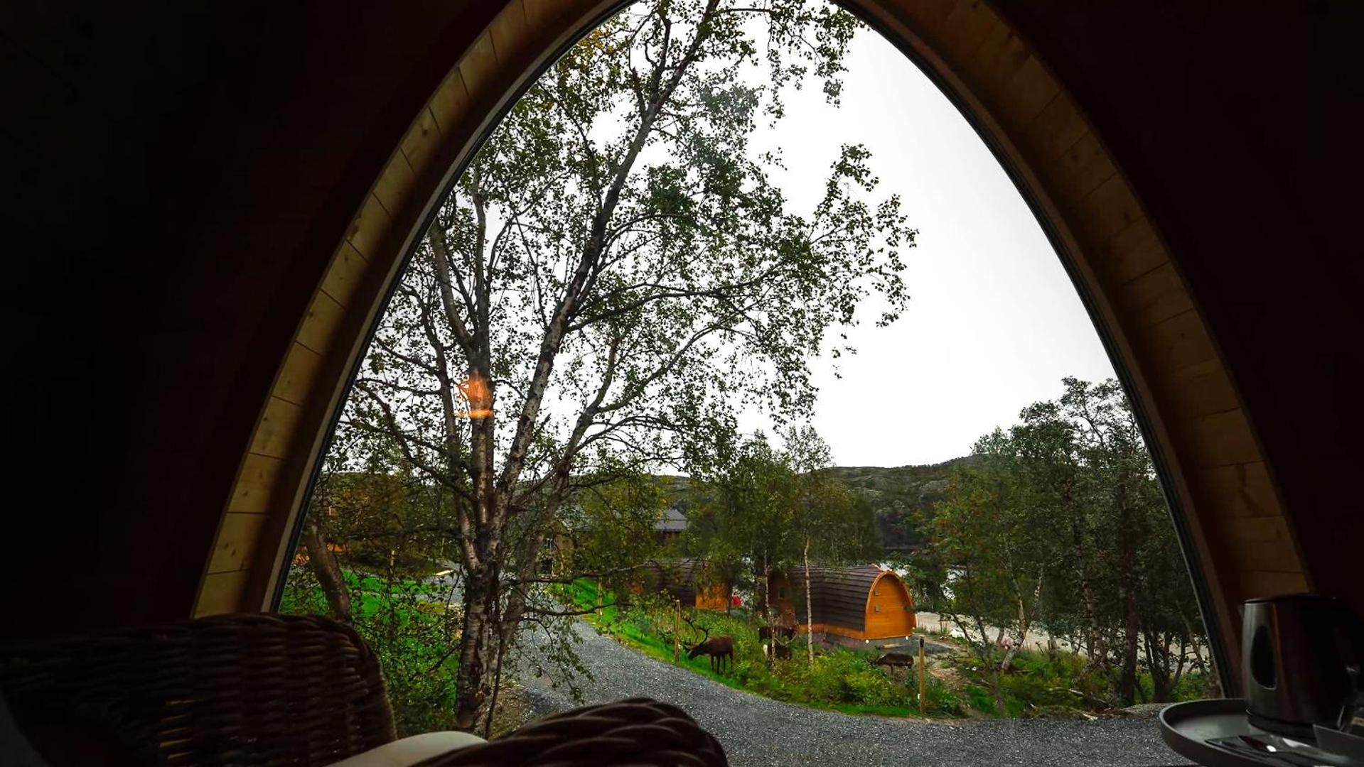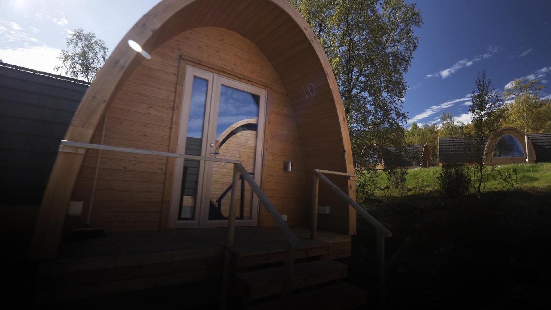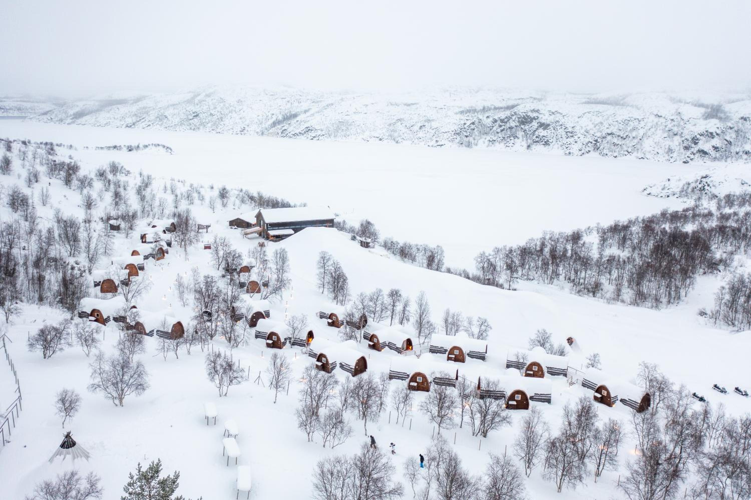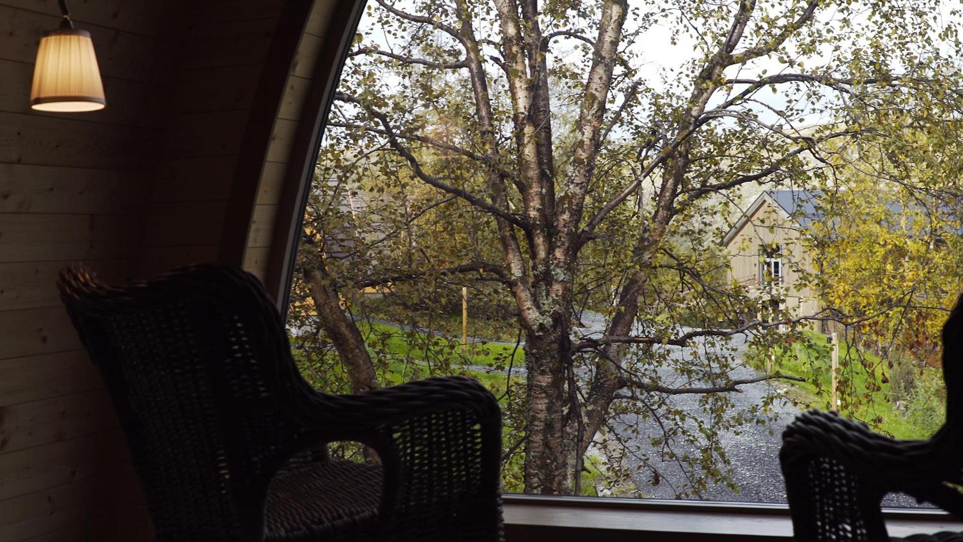 Relax in cozy wooden cottages inspired by traditional Sami huts, featuring large windows offering breathtaking mountain views and private bathrooms.