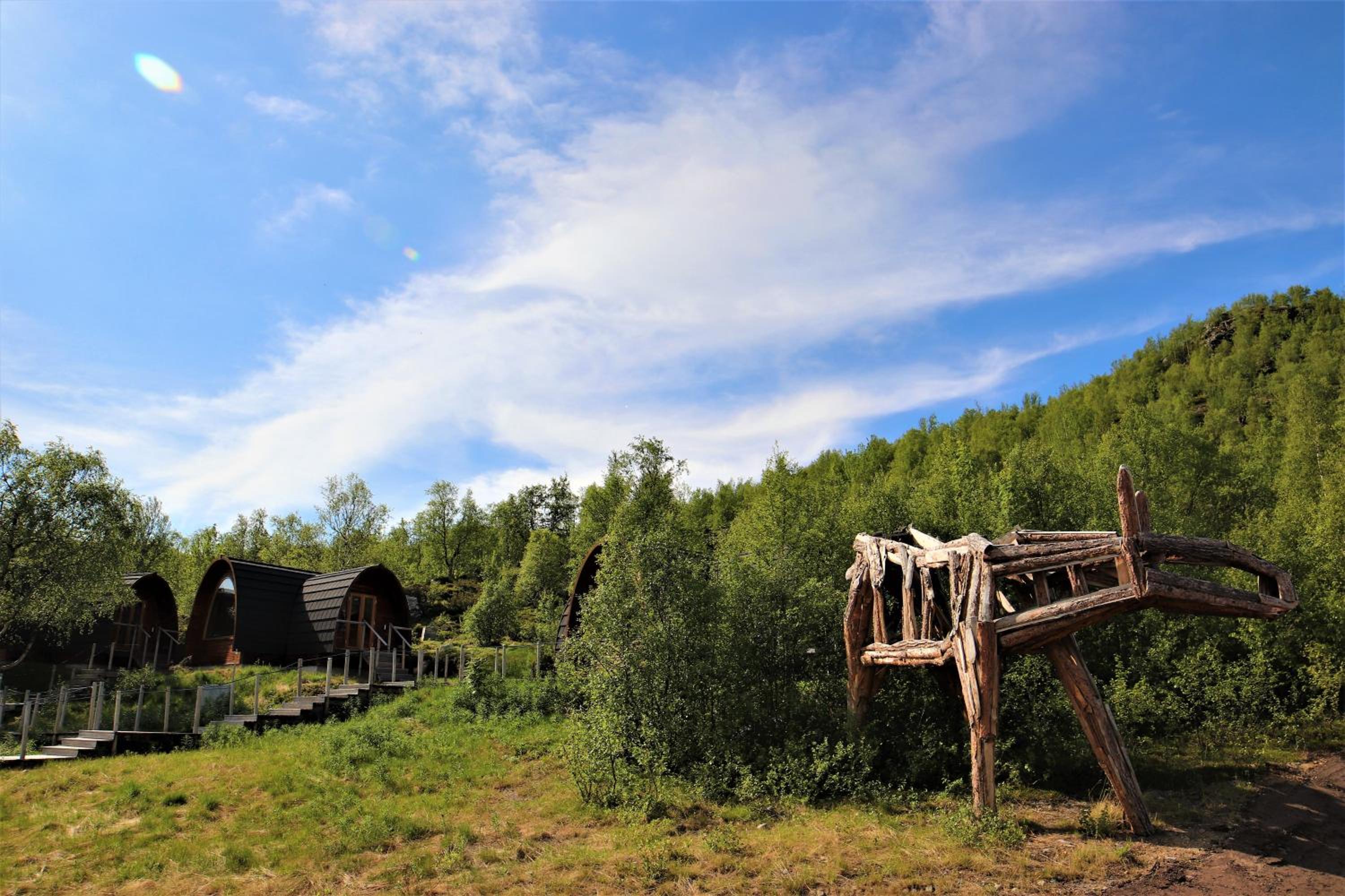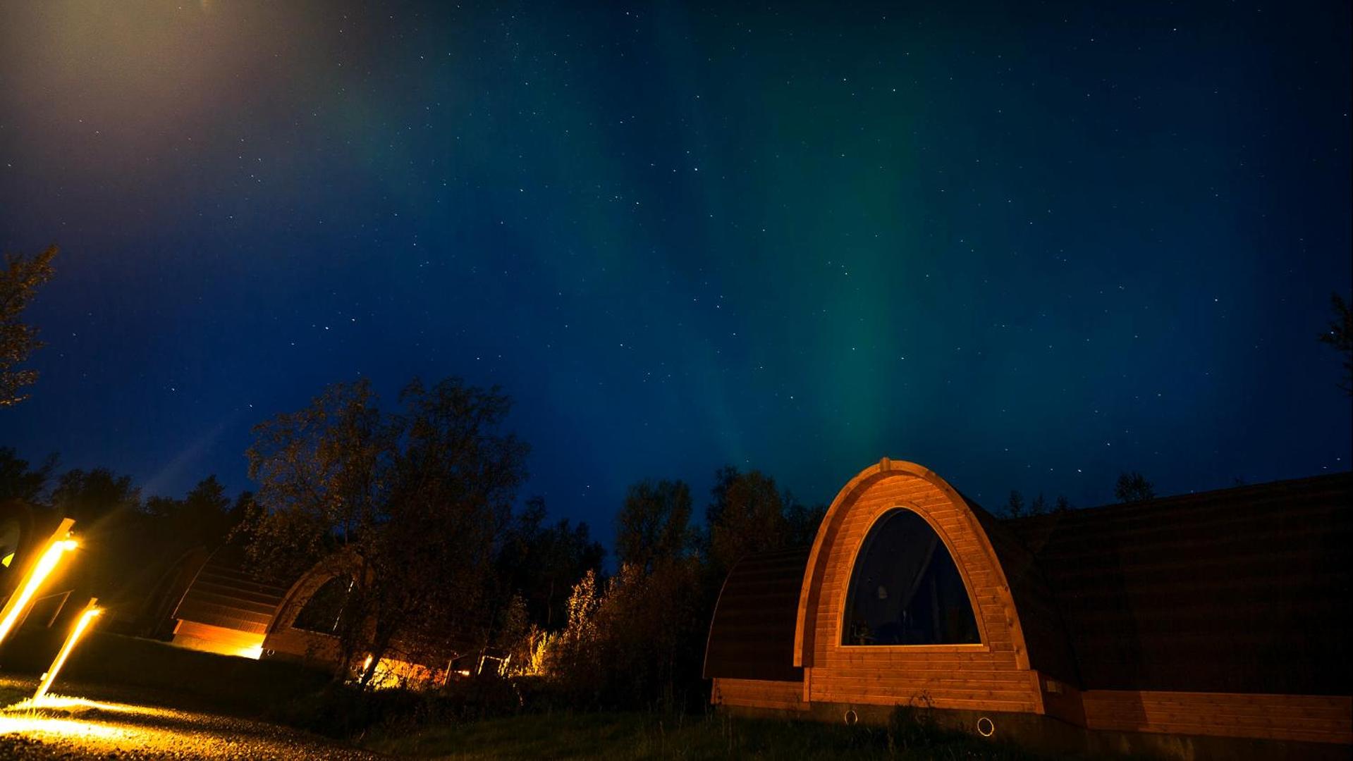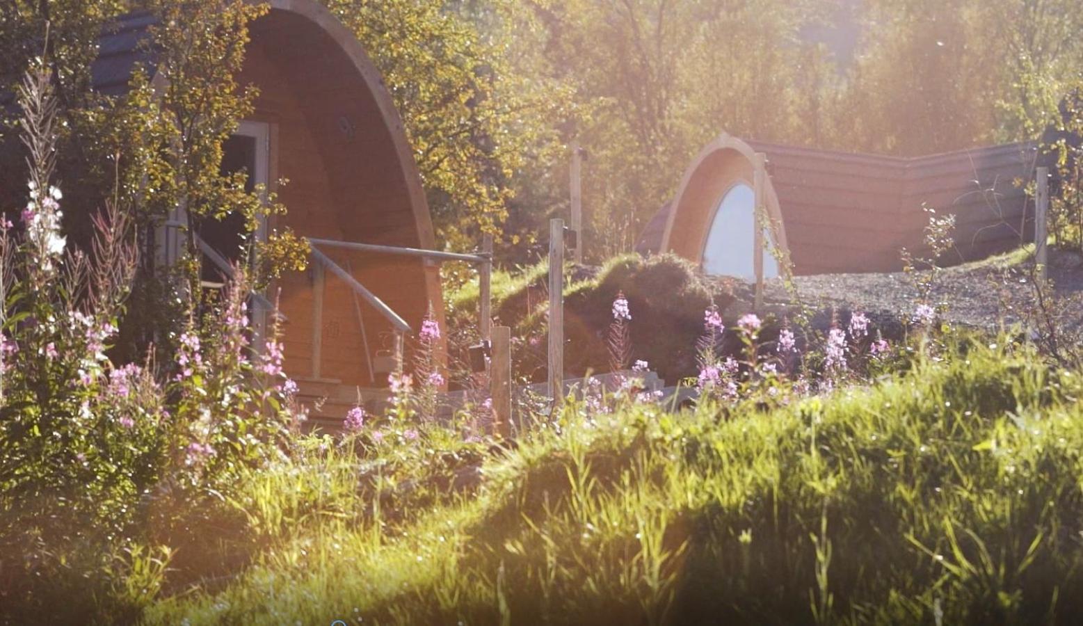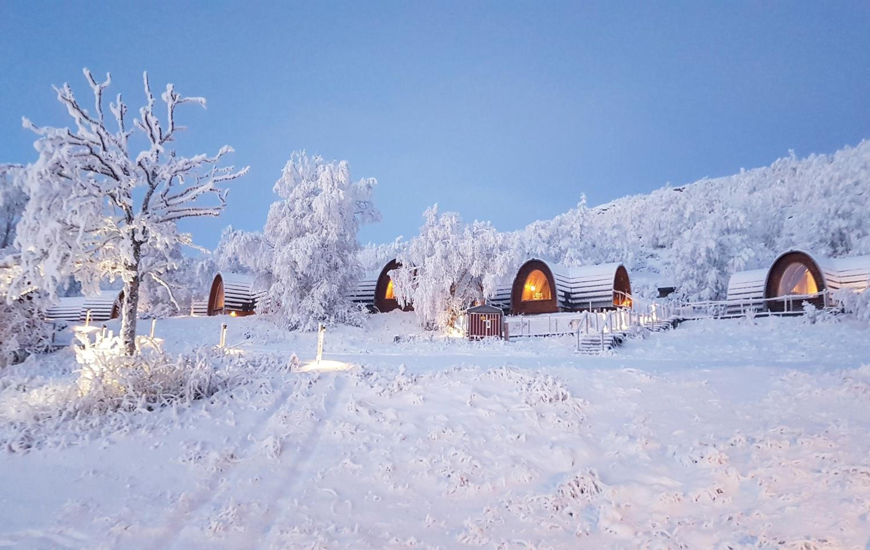 Relax in cozy wooden cottages inspired by traditional Sami huts, featuring large windows offering breathtaking mountain views and private bathrooms.
