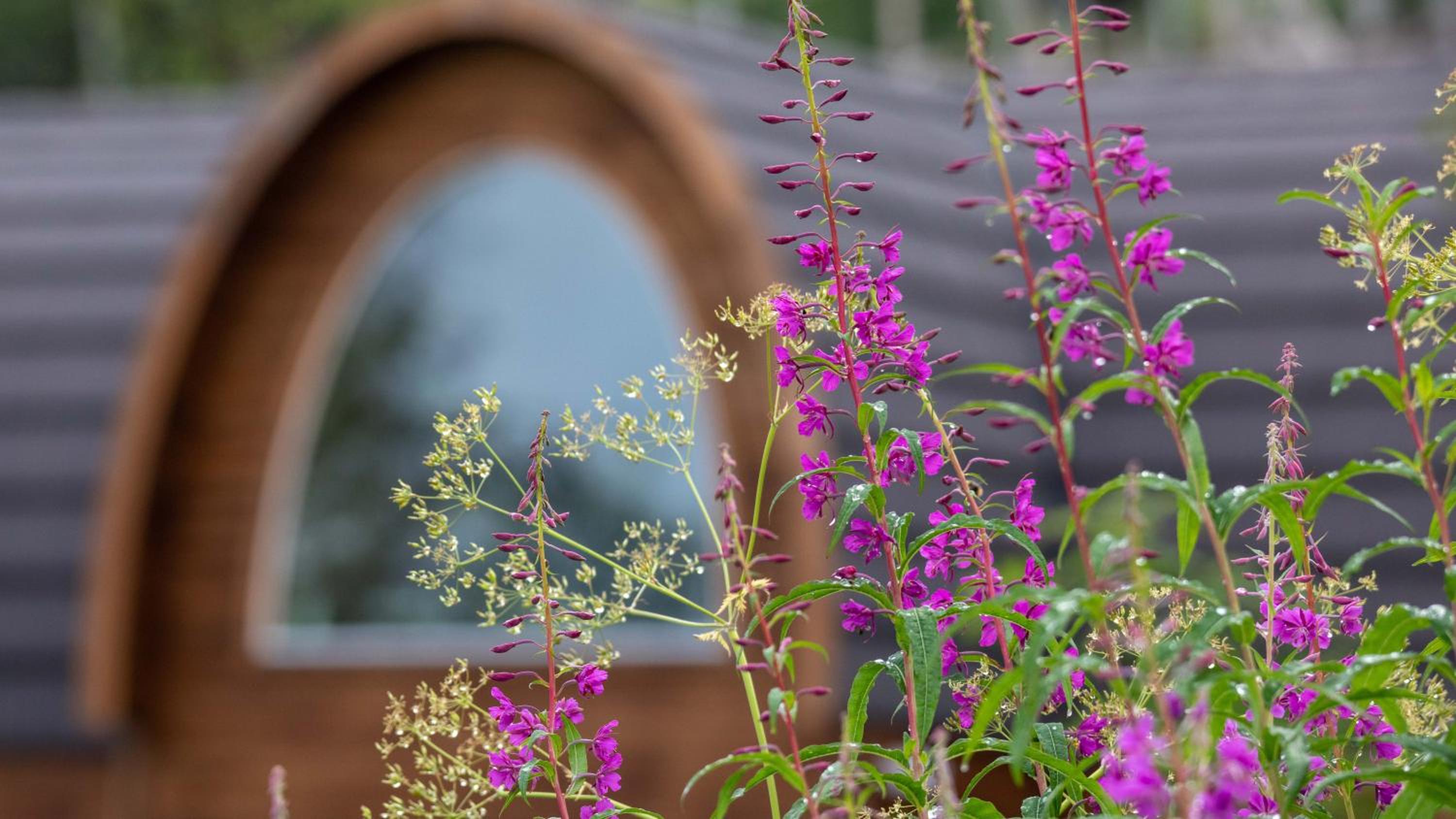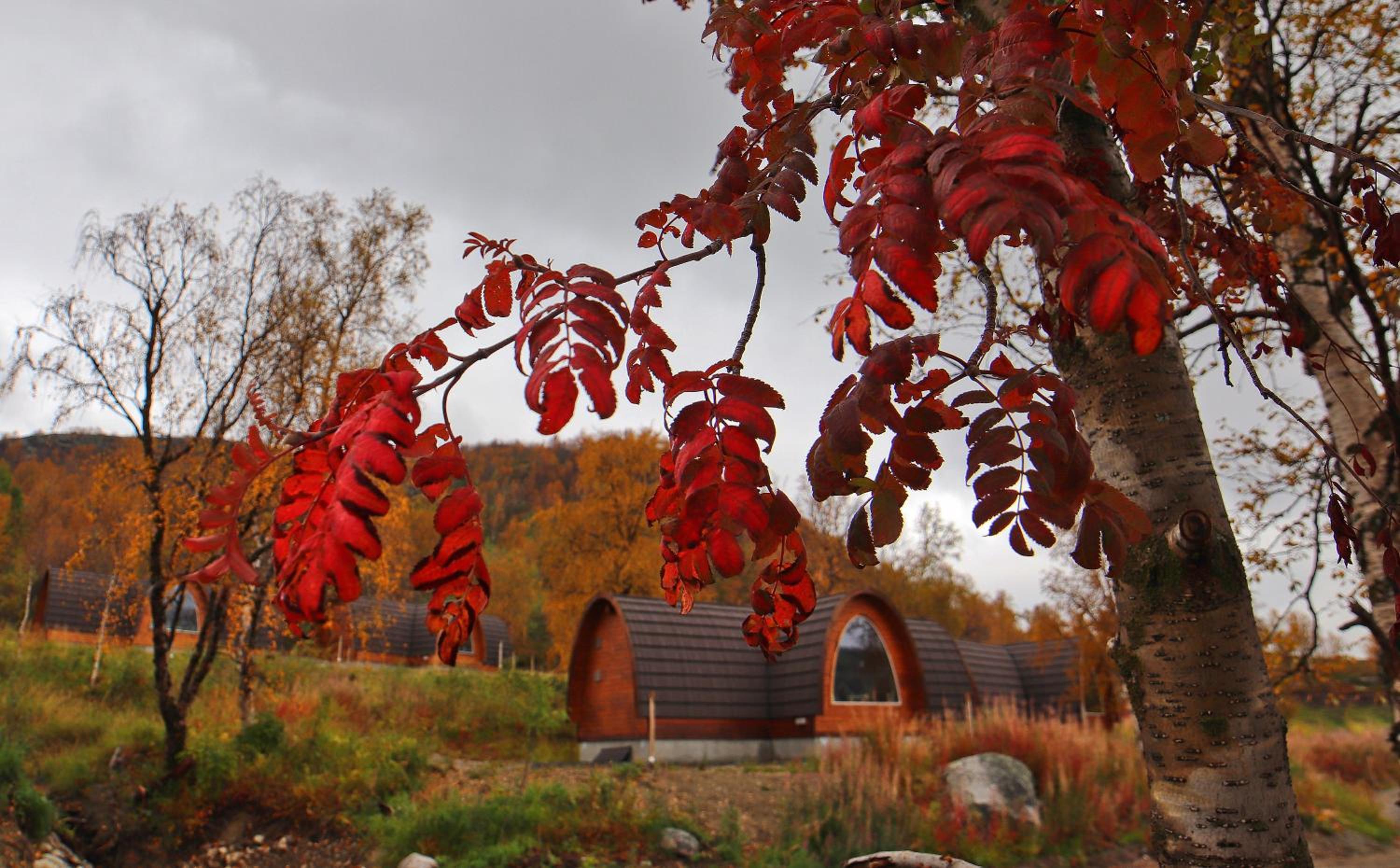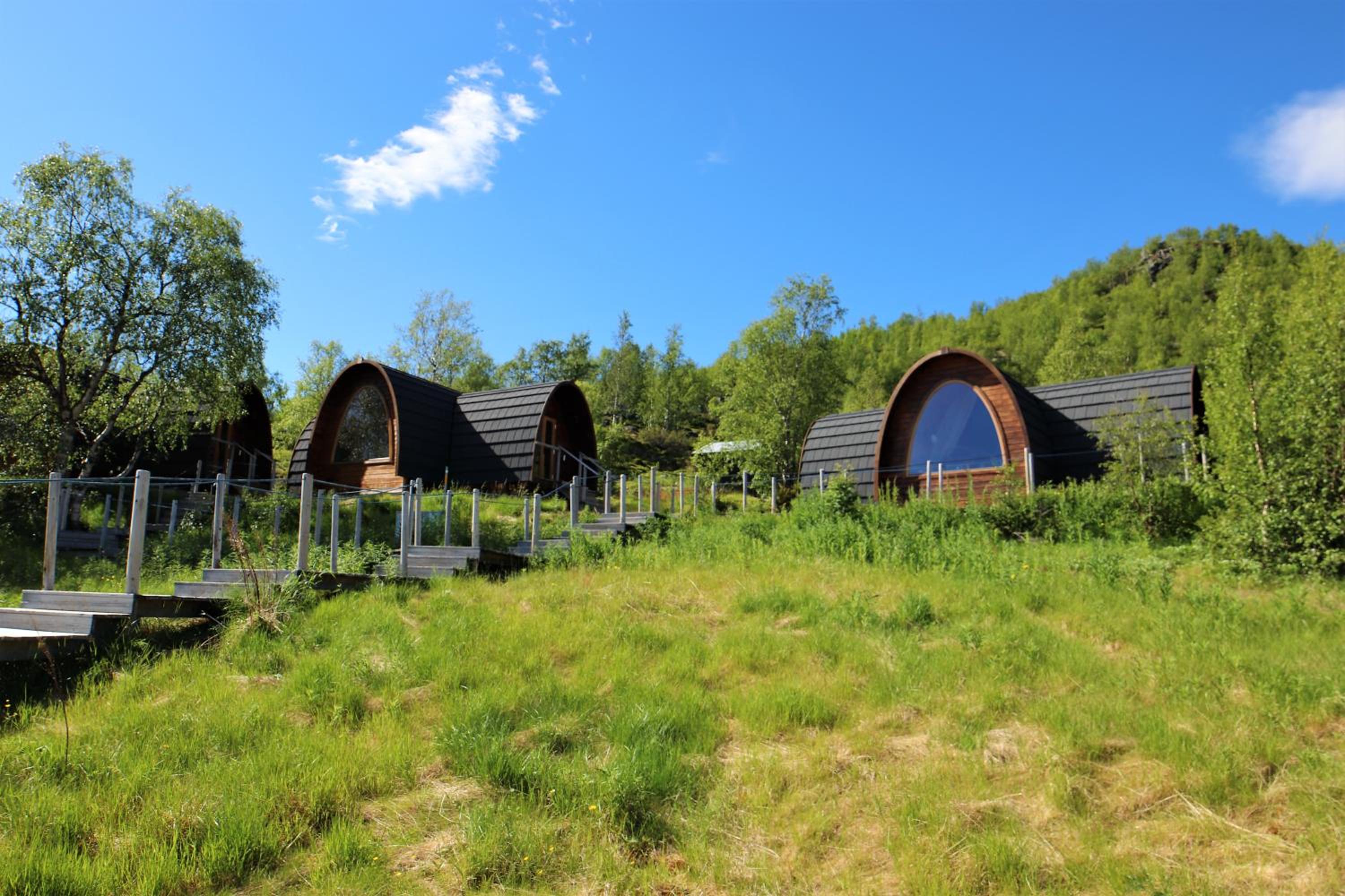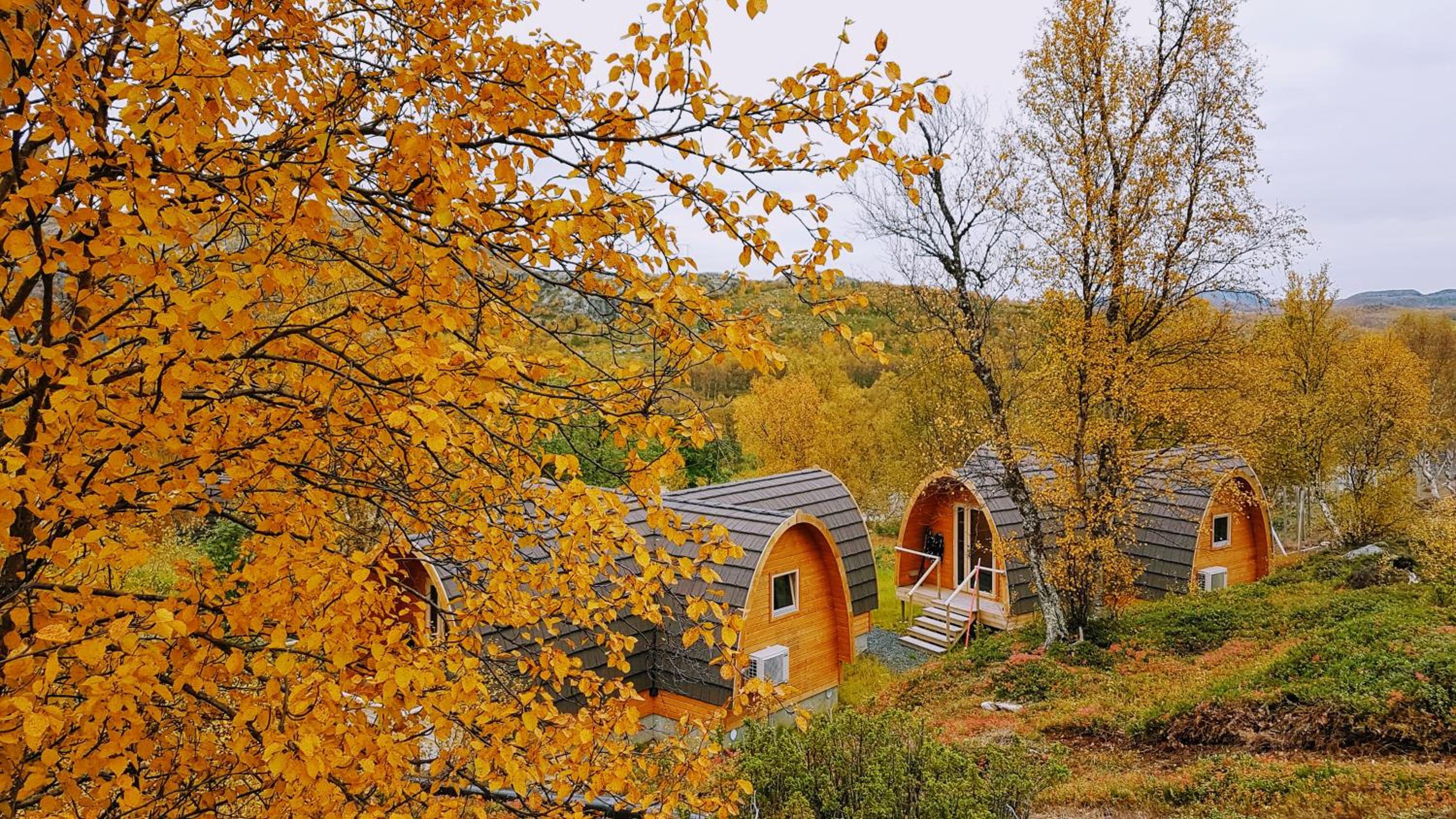 Relax in cozy wooden cottages inspired by traditional Sami huts, featuring large windows offering breathtaking mountain views and private bathrooms.