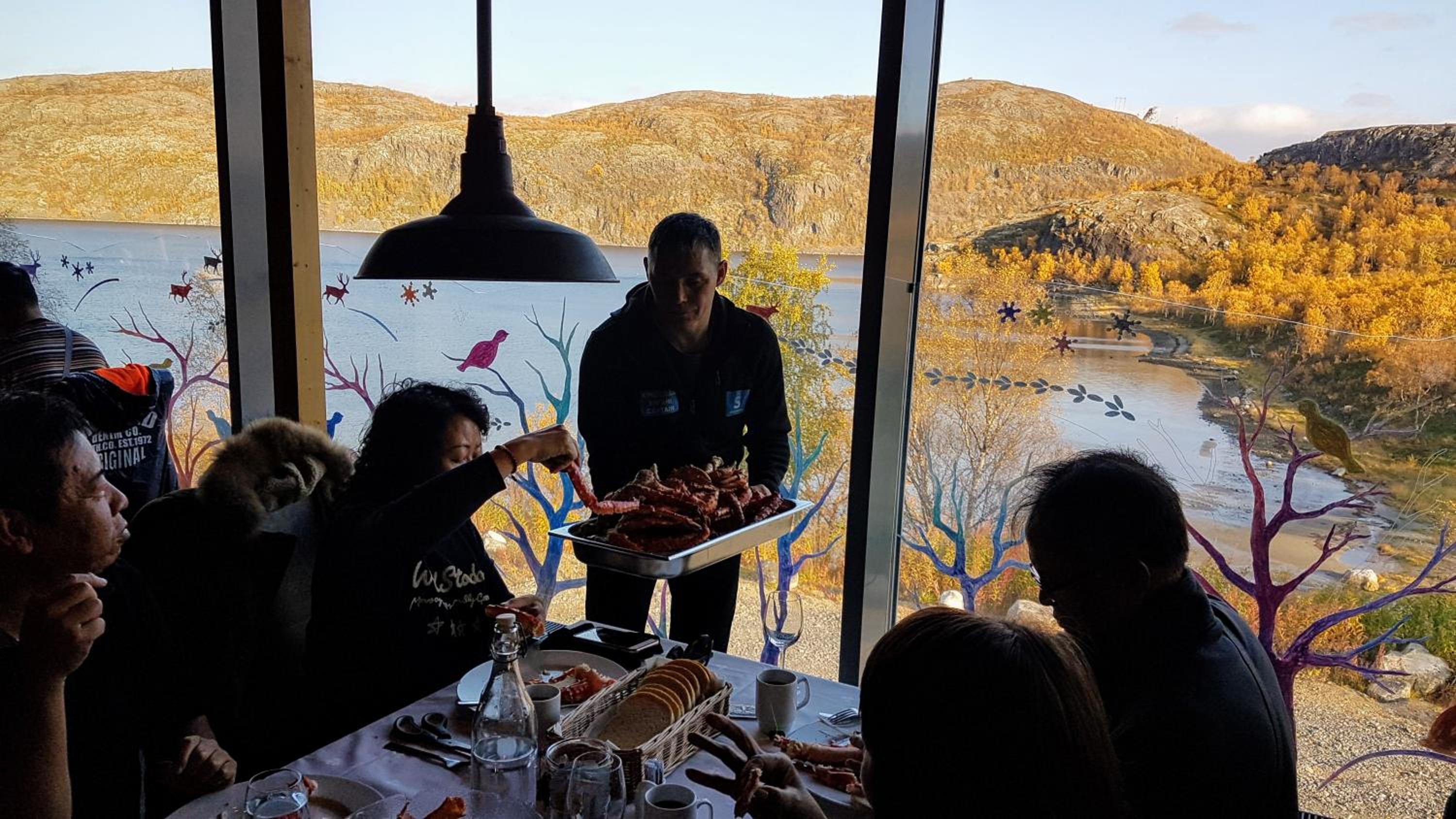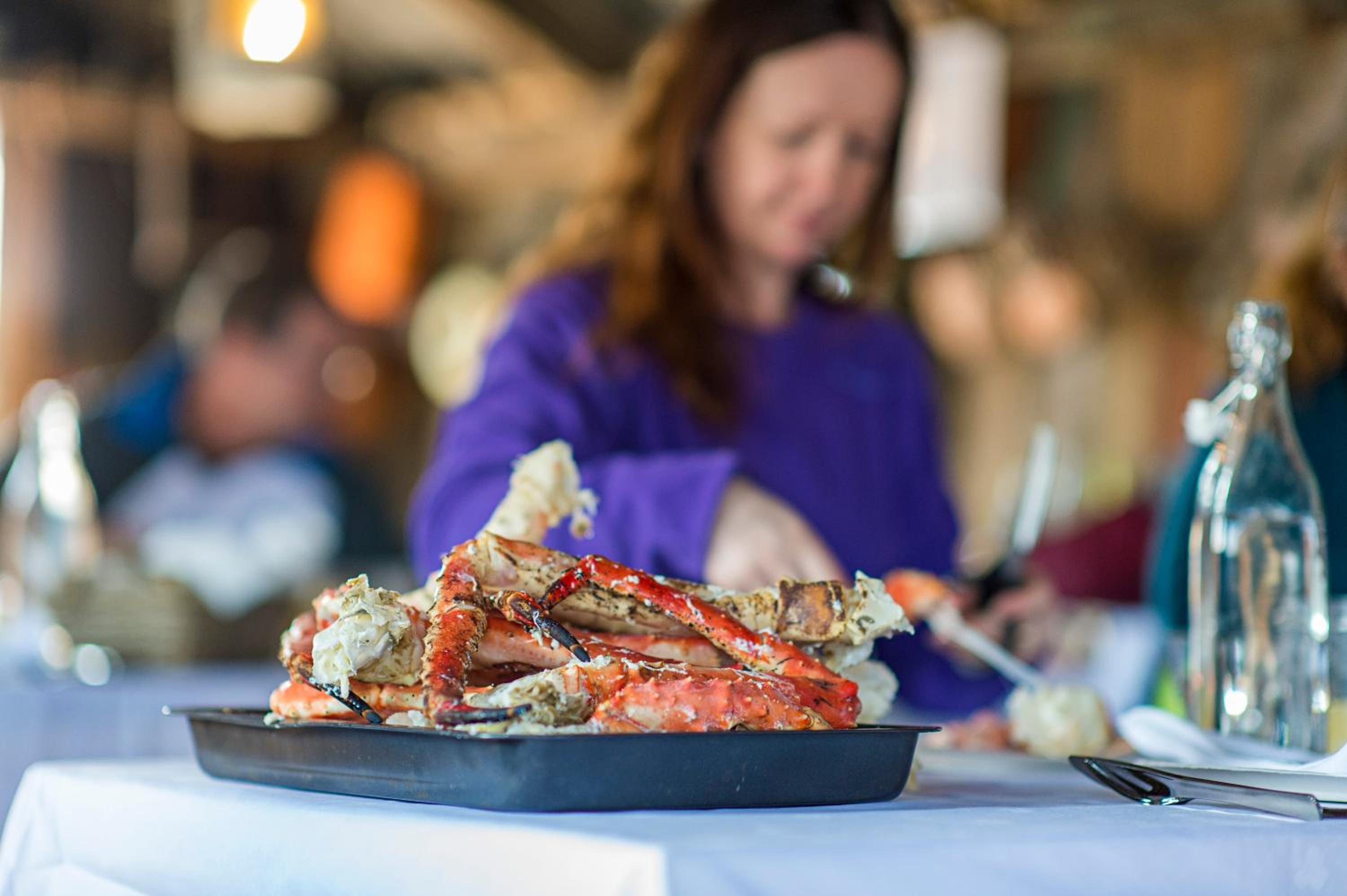 The only place to eat during the day was a small eatery that offer soup.of the day, pre-made wraps, pastries. It closed at 5pm. And then hotel restaurant had a 3 course meal that was $90 Per person and featured wonderful meal made with local food. We ate reindeer steak, and lamb. With king crab safaris they cooked the crab. Too much to eat. If you were on a tighter budget. You would still have to catch a taxi into town ( approx $45 dollars each way) or rent a car . seems that most of restaurants are opened around 6pm in town. Only place we found open during the day was a bistro in the small mall. Food there was fair to good.