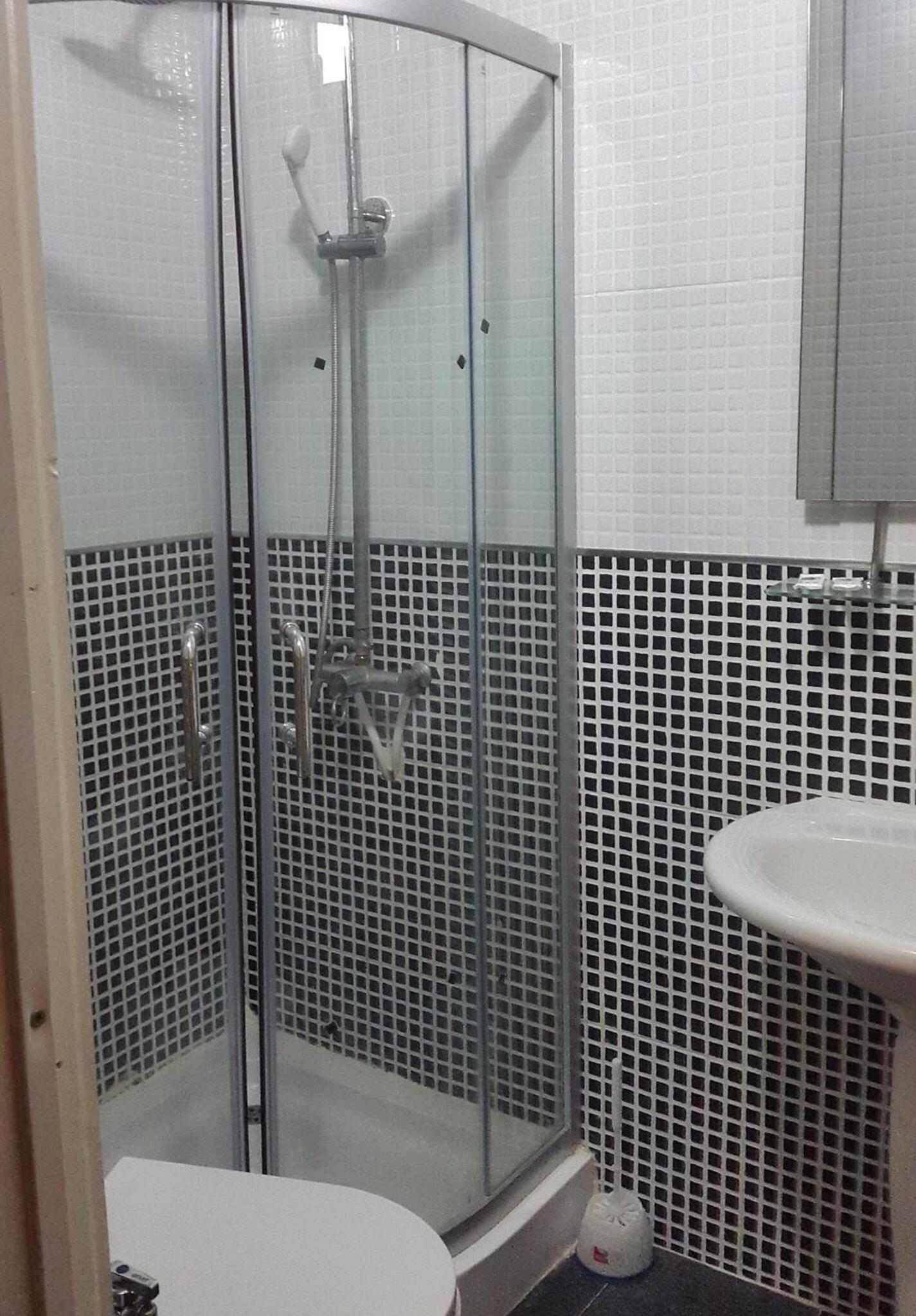 Shower so small and broken shower doors. And no hot tea, I don’t drink coffee.