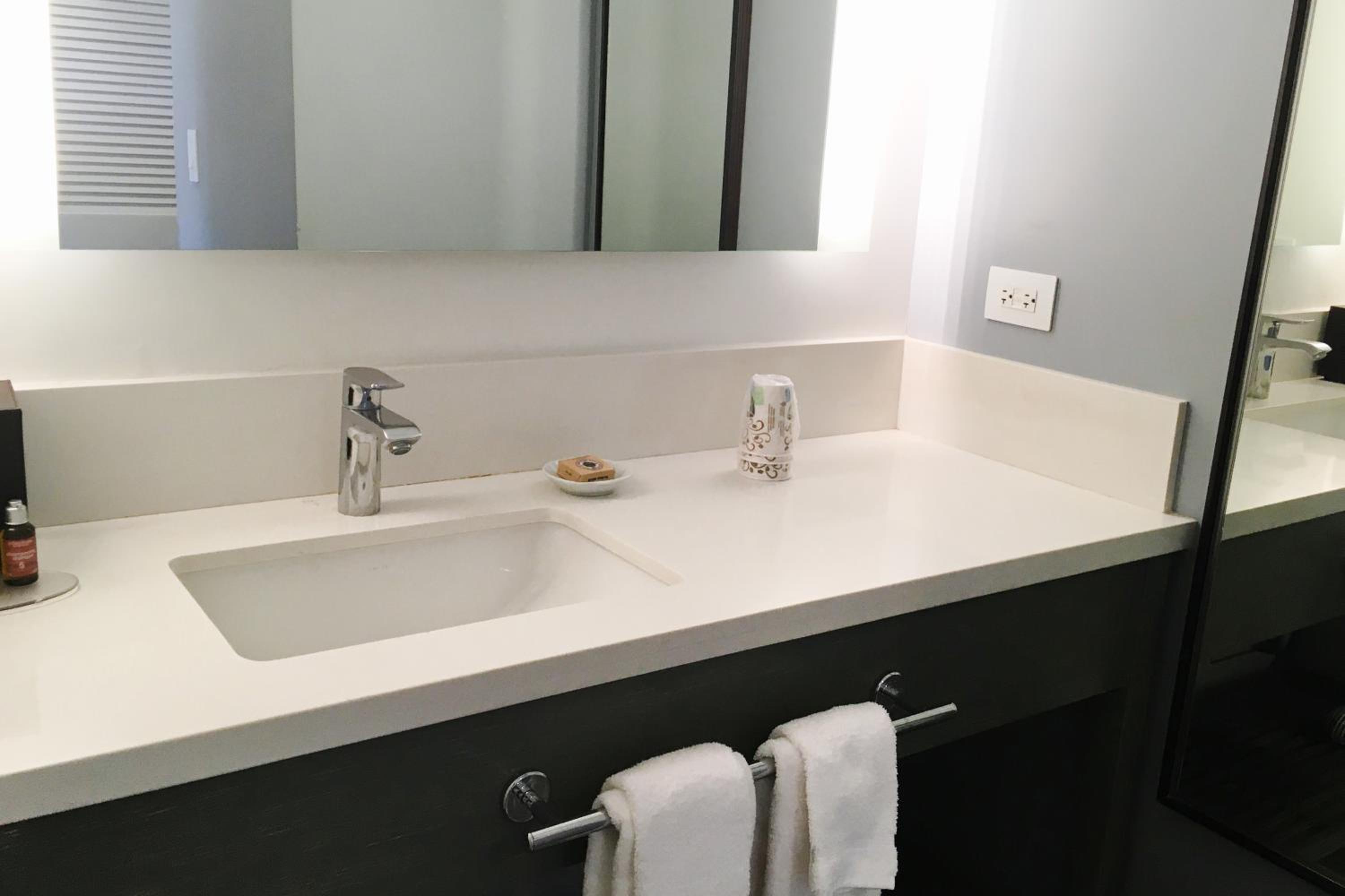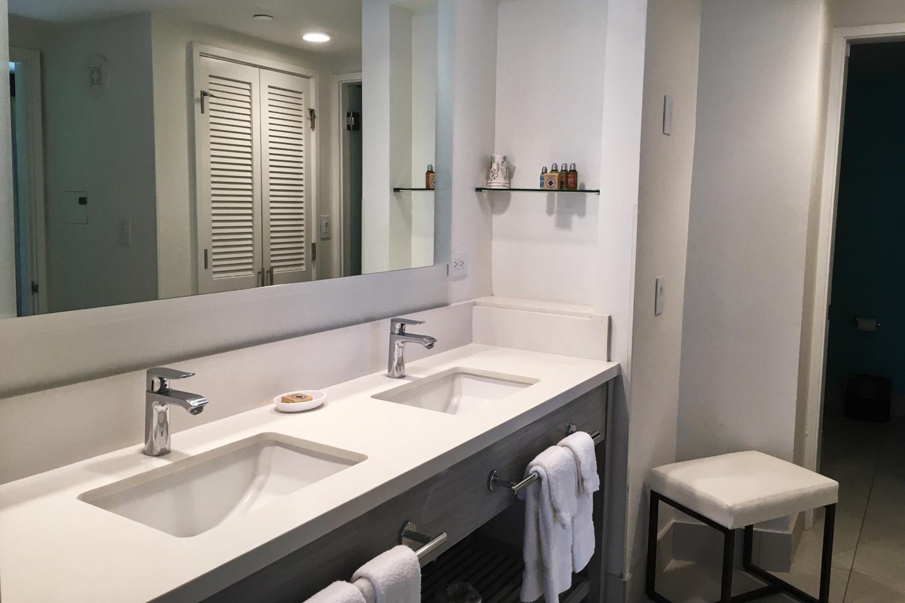The room size was horribly small. No mirror on the outside of bathroom so one could do makeup while the other person was in the shower.