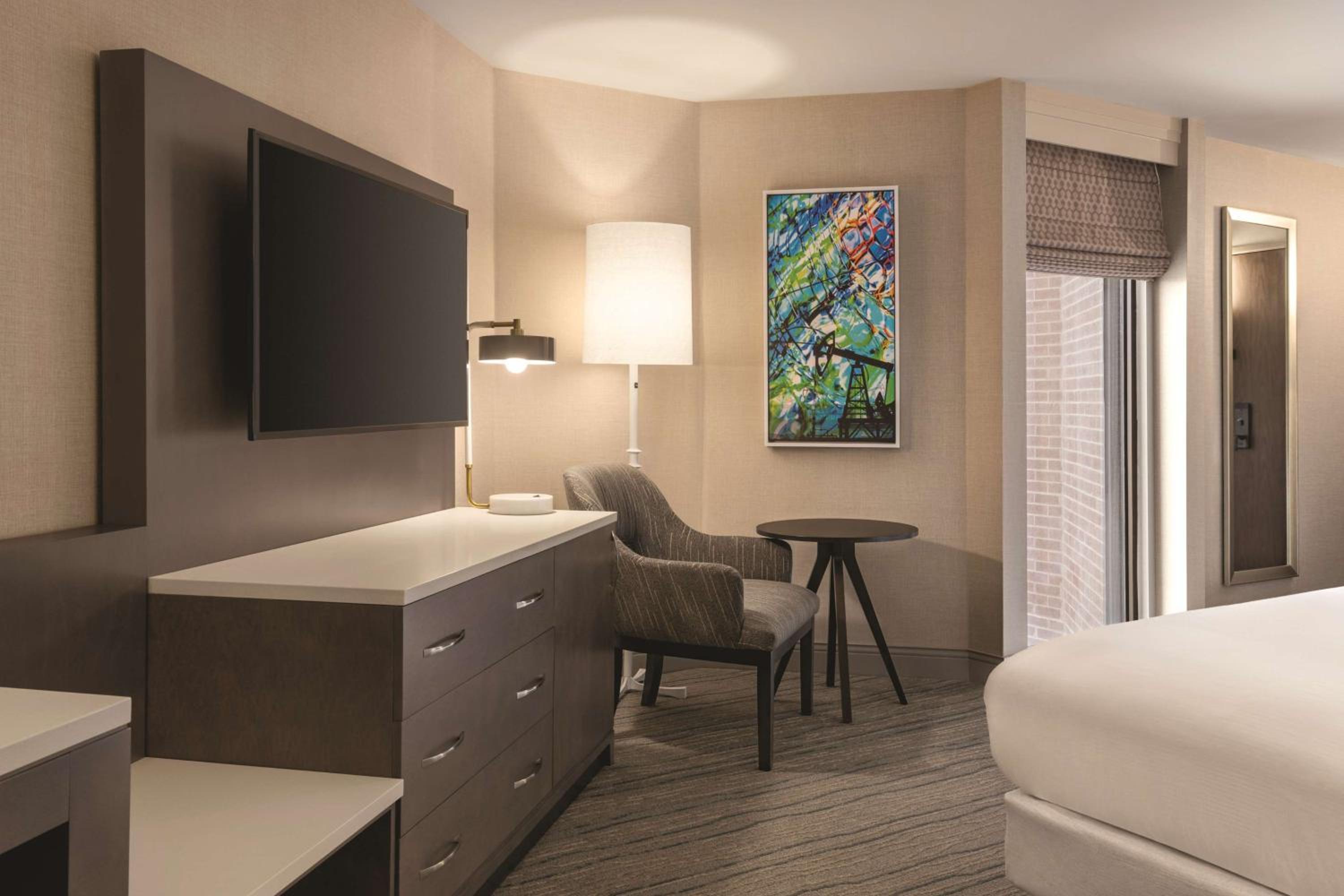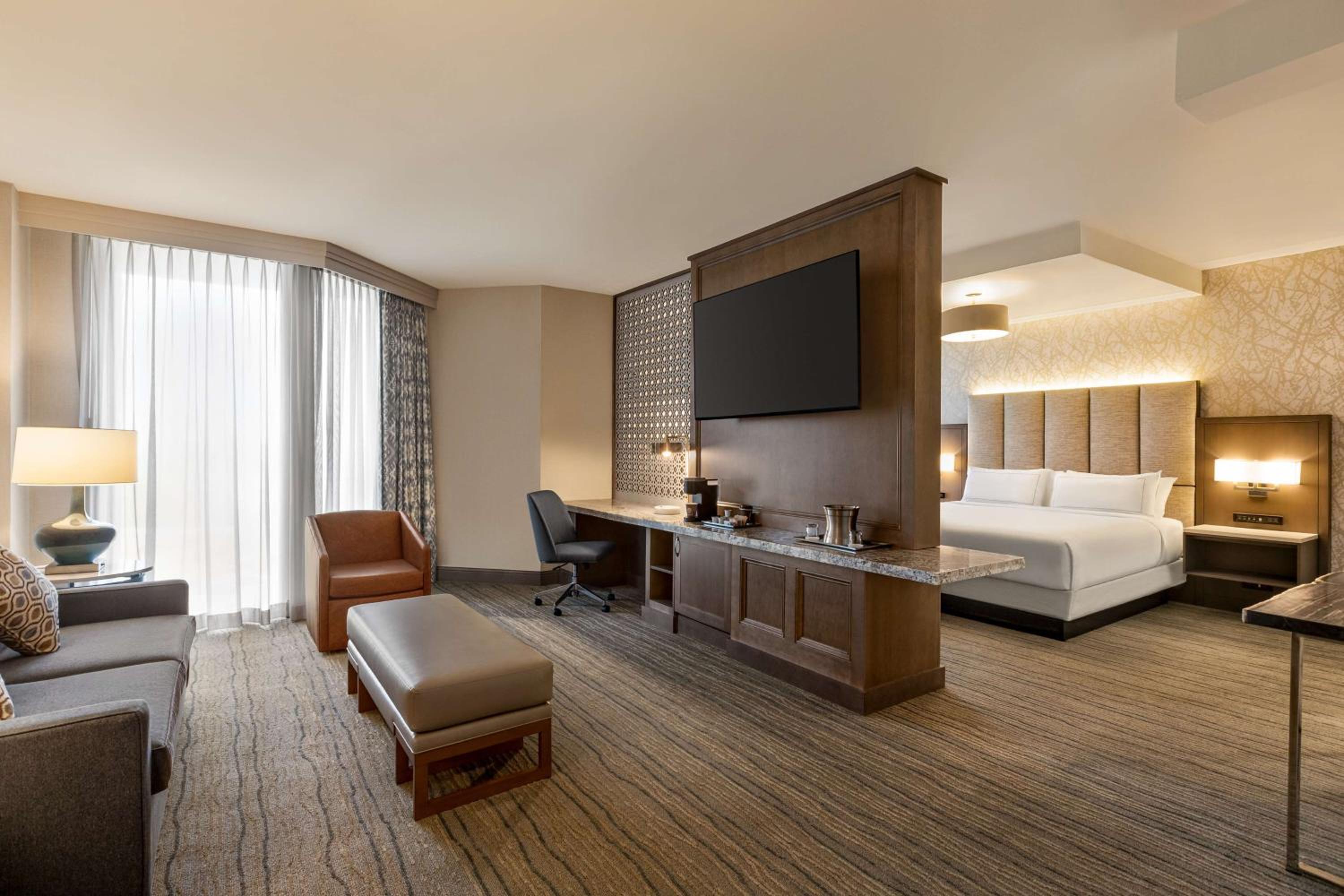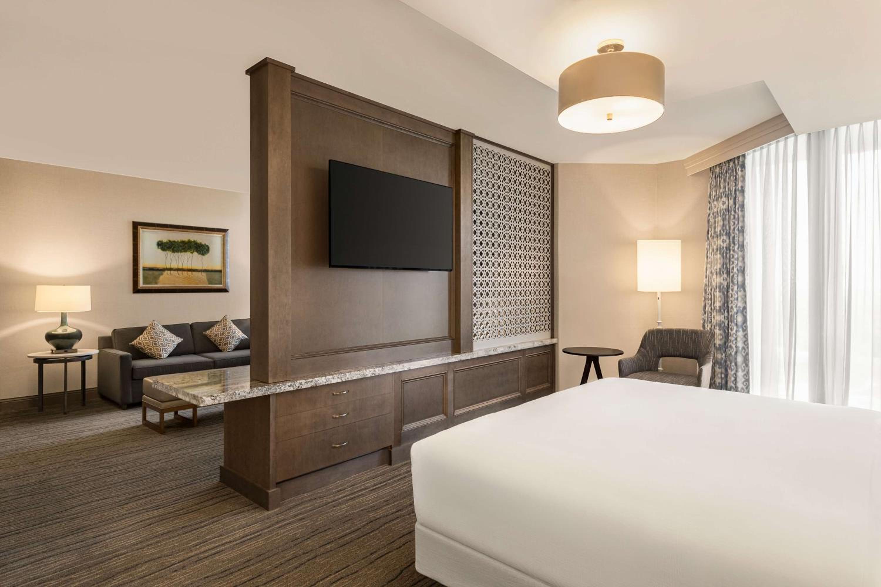 Indulge in comfort at Hilton DFW Lakes with spacious rooms equipped with all amenities for a relaxing stay, including a large work desk, cozy seating area, and entertainment options.
