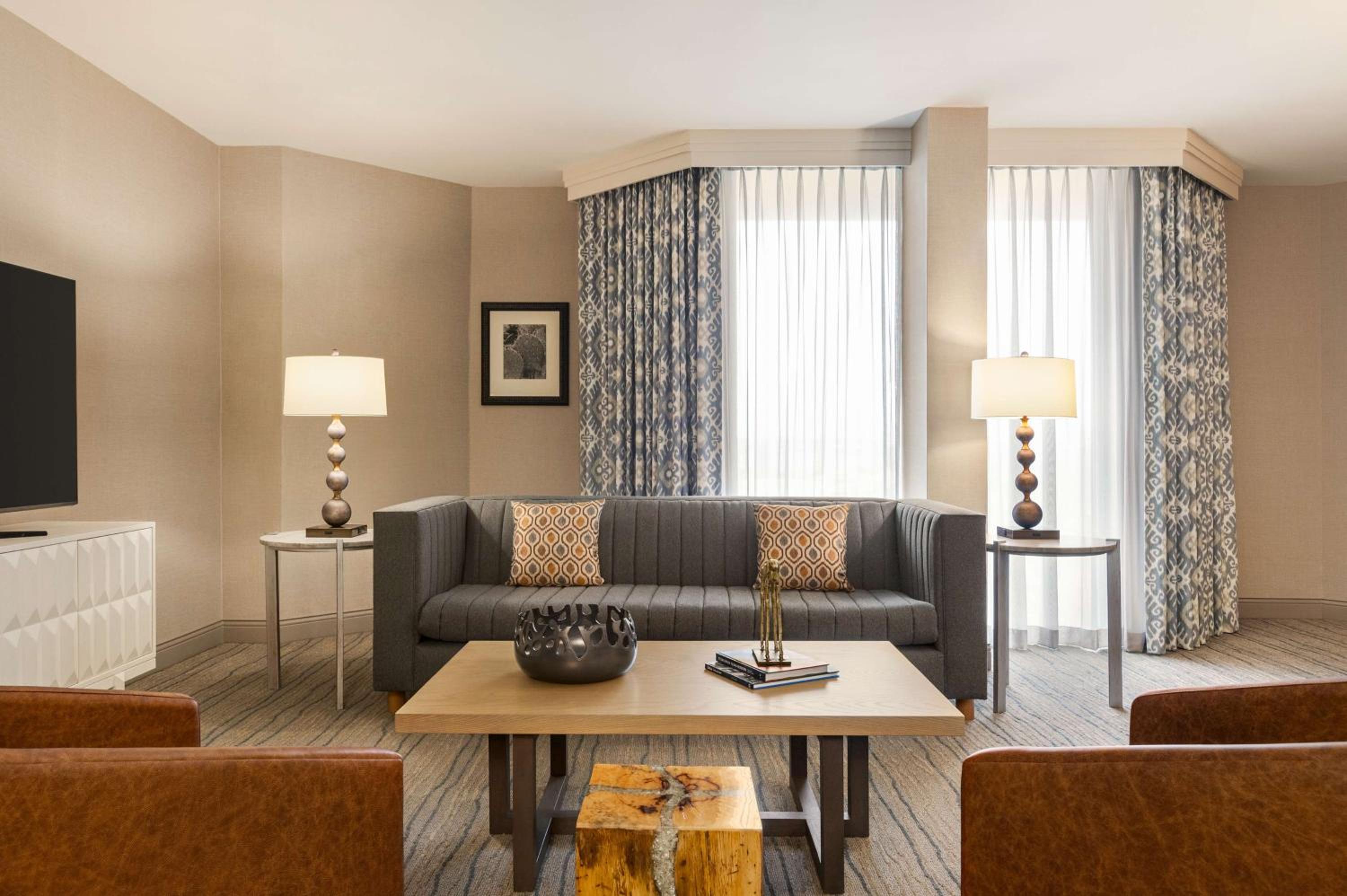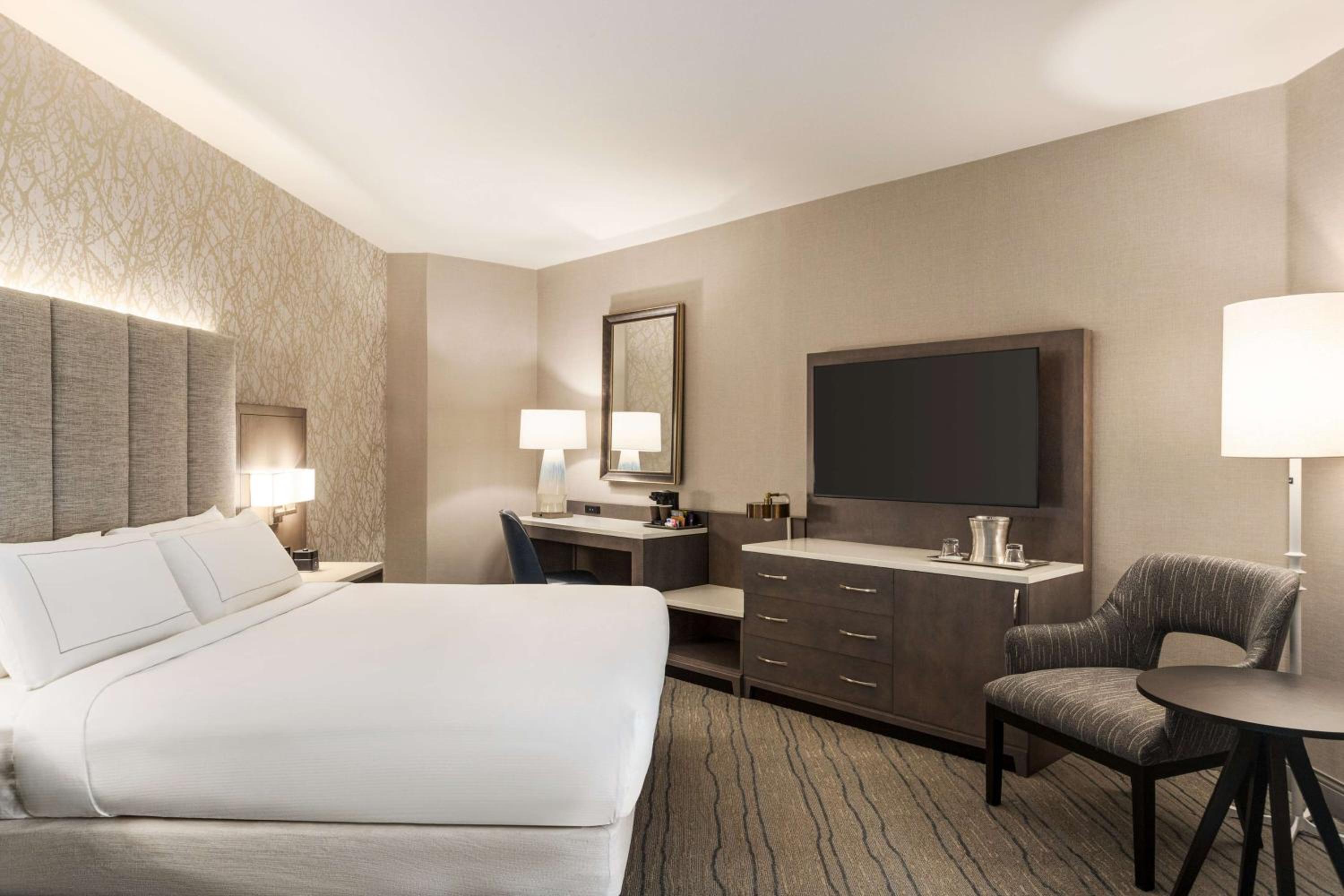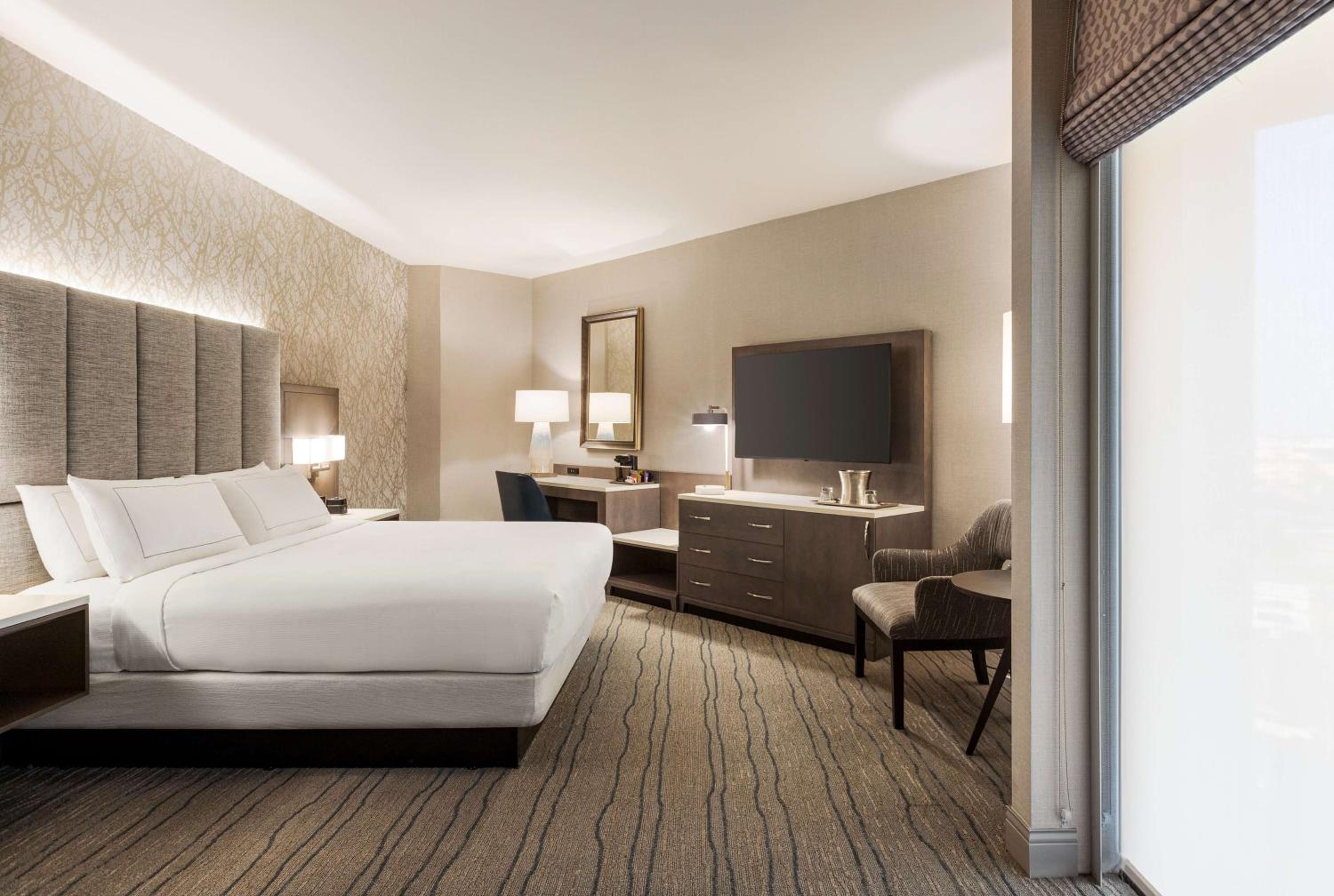 Indulge in comfort at Hilton DFW Lakes with spacious rooms equipped with all amenities for a relaxing stay, including a large work desk, cozy seating area, and entertainment options.