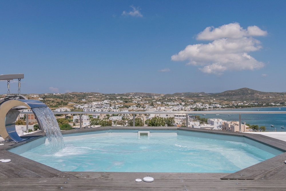 Relax by the seasonal outdoor pool or enjoy the scenic terrace views at Uncle's Luxury Adamas Suites.