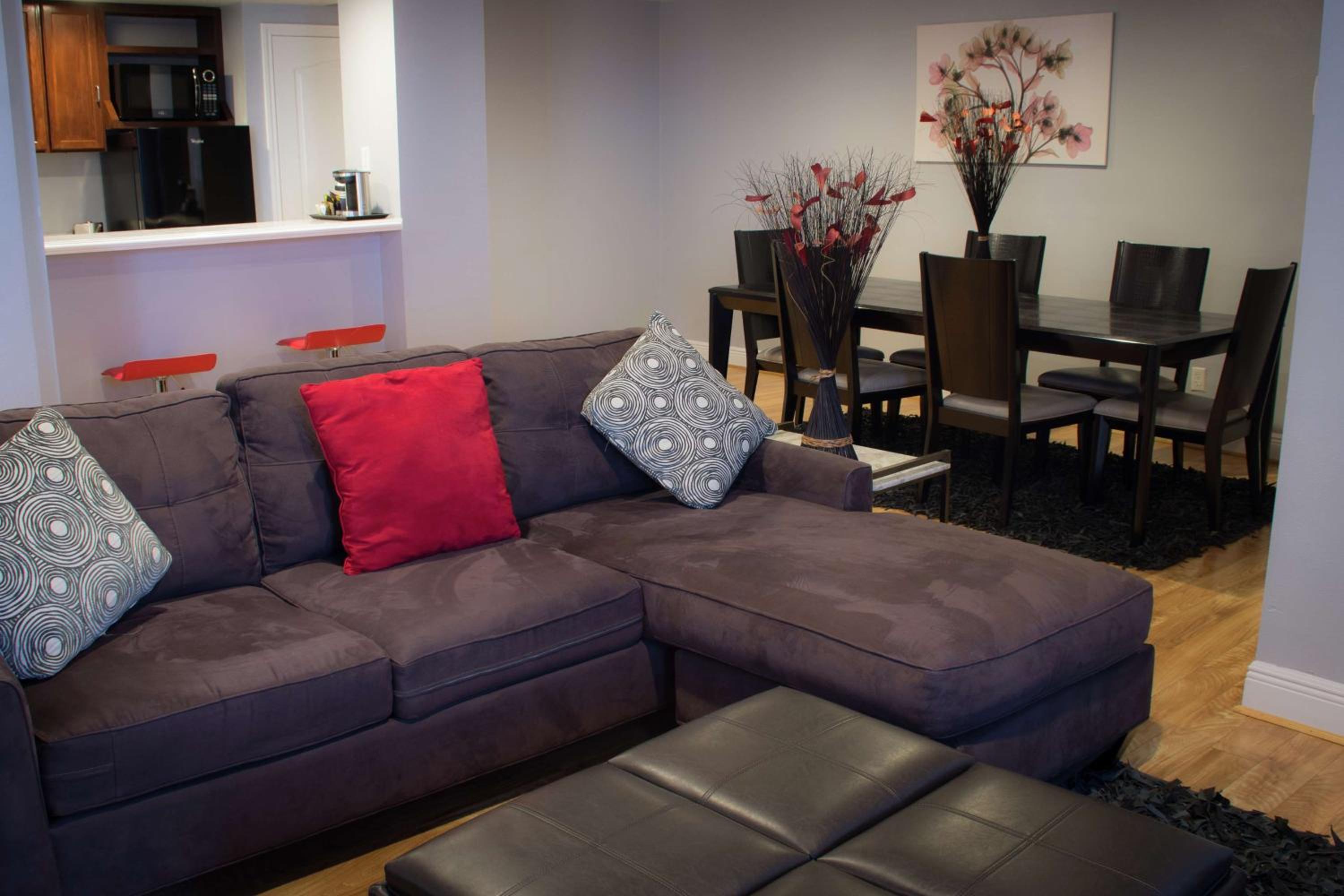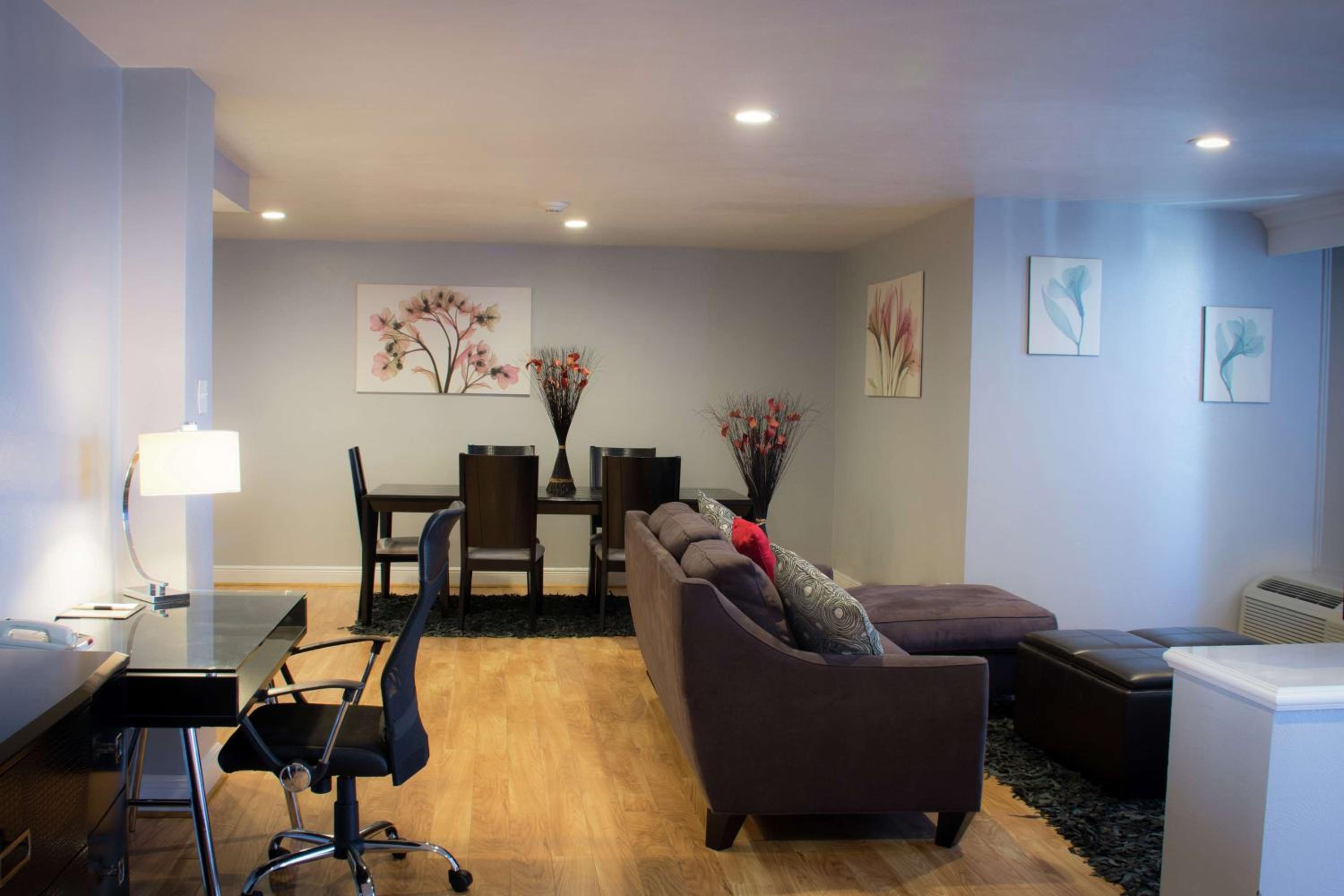 Guests can kickstart their day with a workout at the on-site fitness center or a refreshing swim in the outdoor pool. Indulge in a cocktail at the Mahogany Lounge, savor a delicious meal at Chez's restaurant, or take in city views from the rooftop bar.