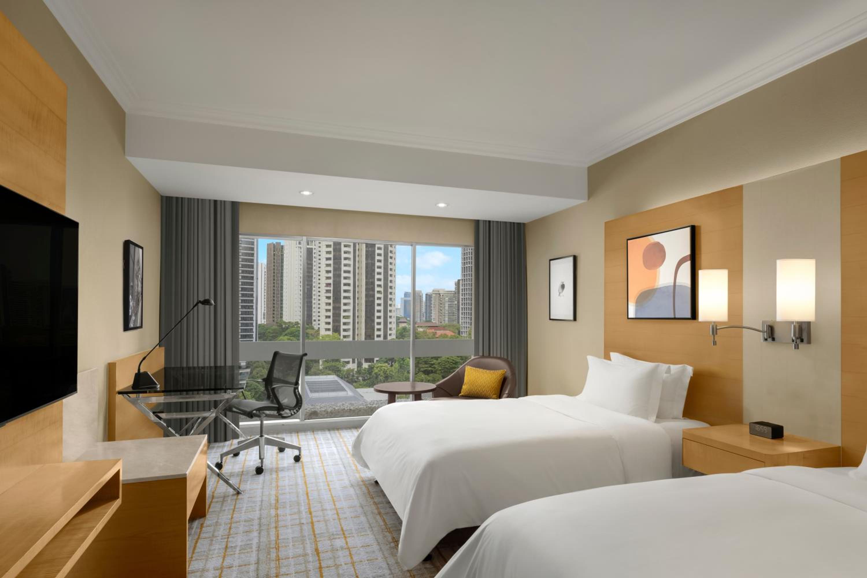 Experience modern rooms and suites with floor-to-ceiling windows offering stunning city views. Enjoy the comfort of large flat-screen TVs and unwind in marble bathrooms with bathtubs and rain showers.