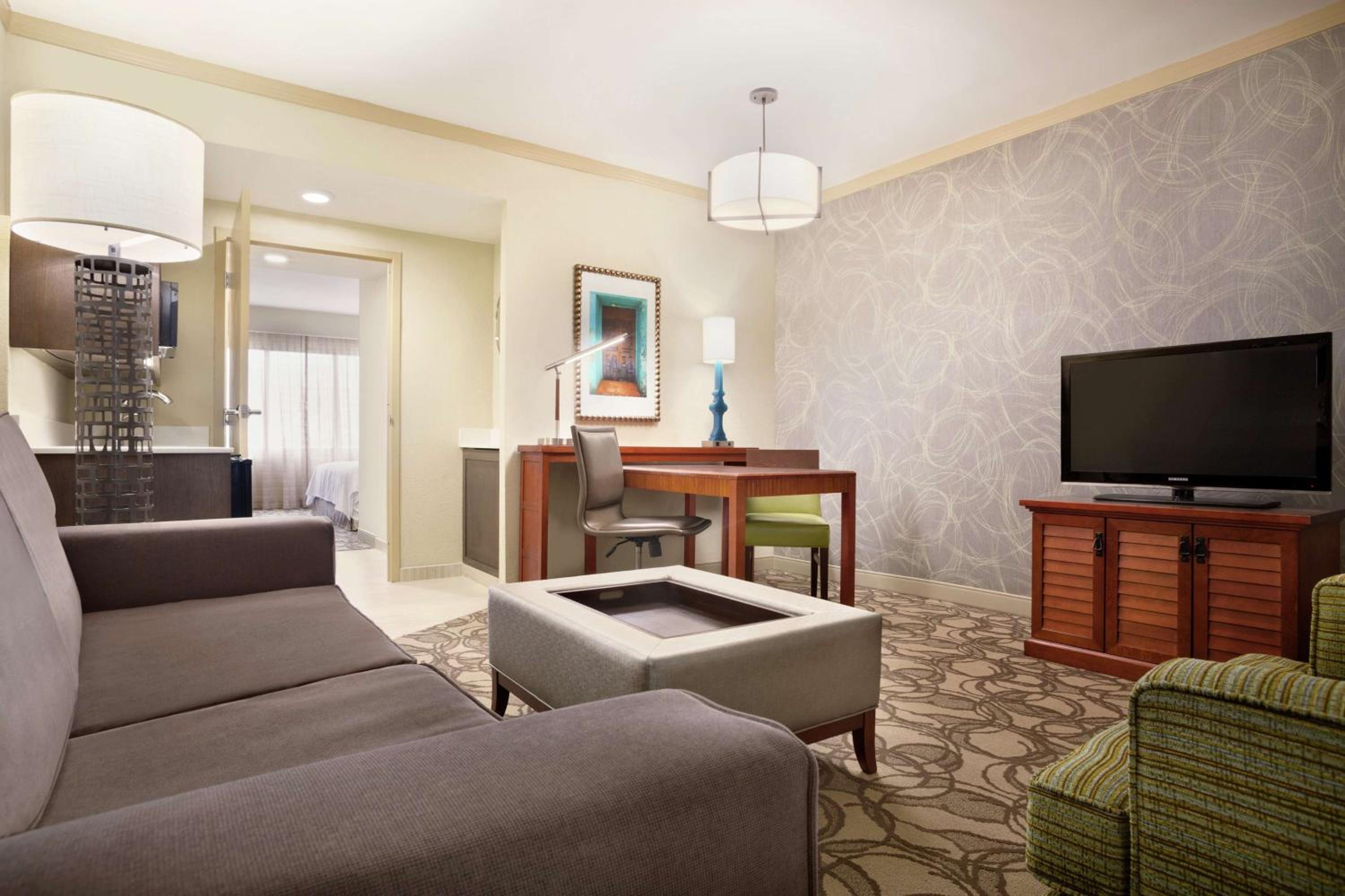 The location is great. The atmosphere is great. I love their courtyard, it’s inside and spacious. The reception with free drinks and snacks is excellent. The rooms is where I have some critiques. I stayed here years ago with my family and everything seemed clean and well maintained. This room seemed old and sad. You can look closely at the furniture and bathroom and see the wear and it needs an update. Our tub was small and stained. The sofa bed was uncomfortable. The pillows smooshed down to where you need all 3 just to not be uncomfortable. The room didn’t feel clean. Because of the room I felt that the value wasn’t exactly on par for the price. If you’re sleeping the the front section where the couch is and noisy neighbor’s were around it would wake you up or keep you up. I heard no noise in the back bedroom. The breakfast is excellent and the pool/hot-tub was a must to keep my grandchildren entertained. Two things I wish for in this hotel. Update the bathroom and find a way to let guests have a way to dry the bathing suits. Hooks in the shower or more hooks on the bathroom door. The service was wonderful as well. A downside was the 3 roaches we had to kill.