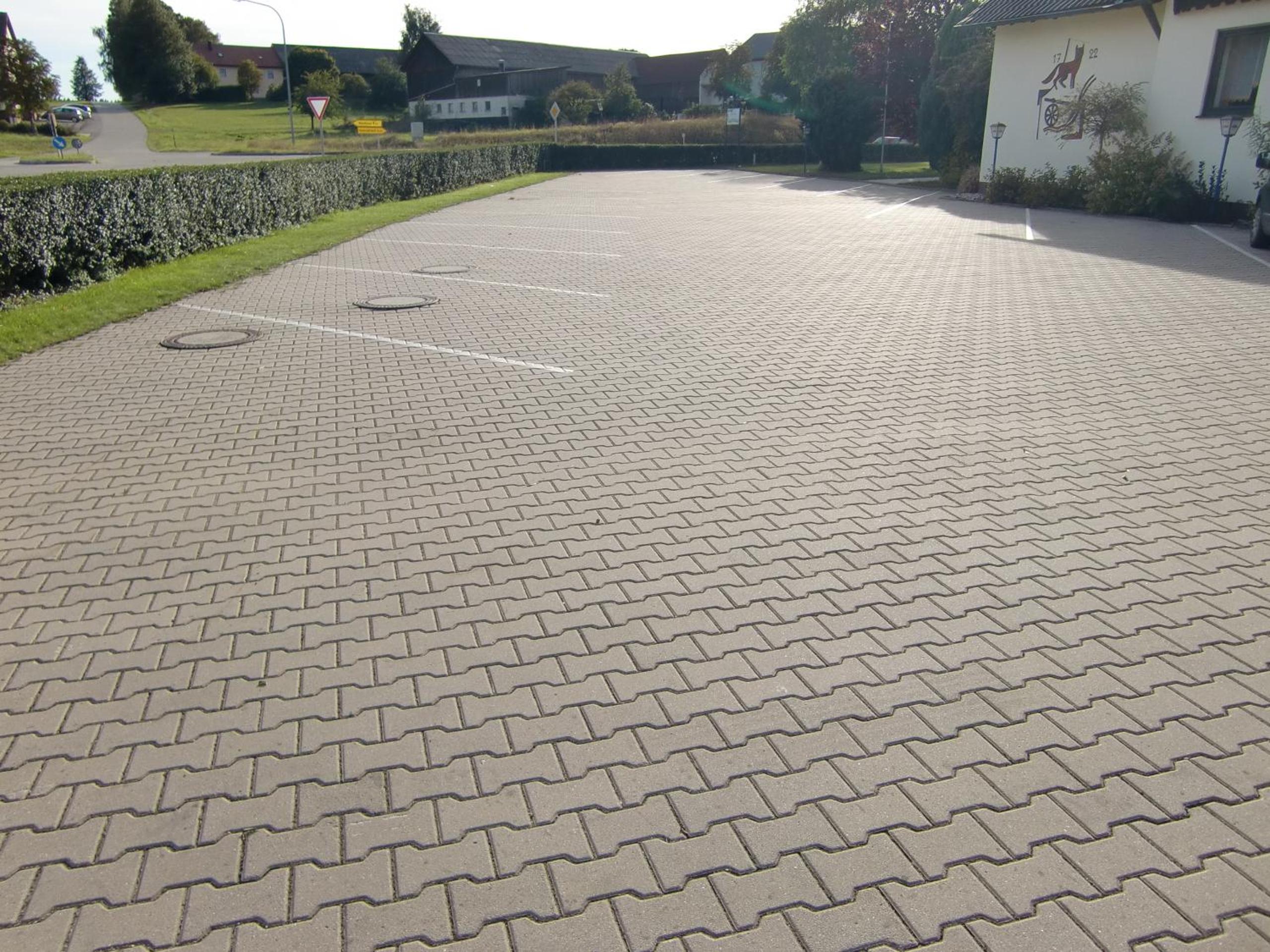 Parkplatz. Betten. Badezimmer. Innenhof.