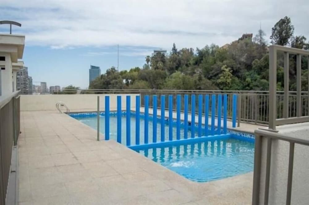Take a break and relax by the outdoor pool with a stunning view from the terrace and garden, perfect for unwinding after a day of exploring Santiago.
