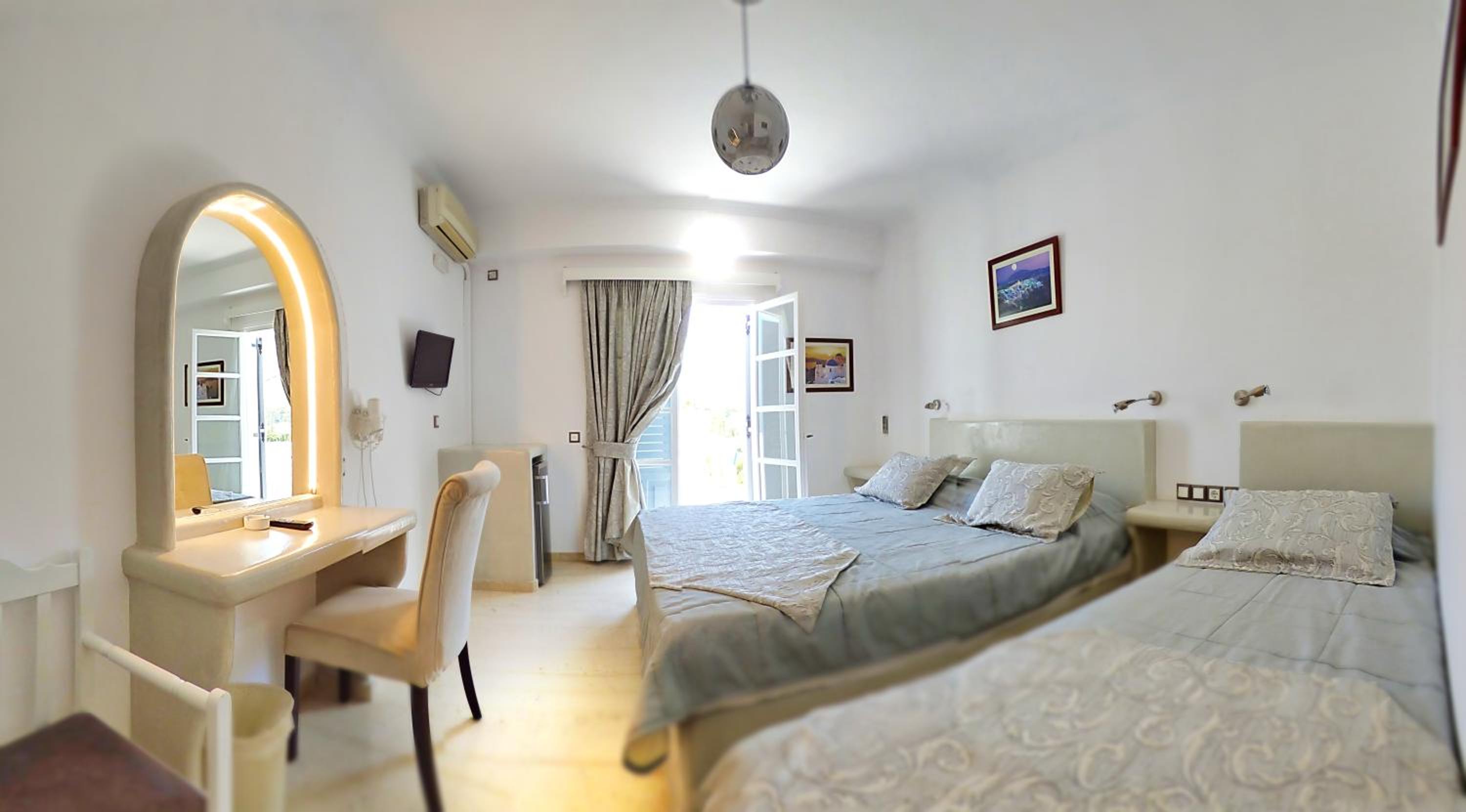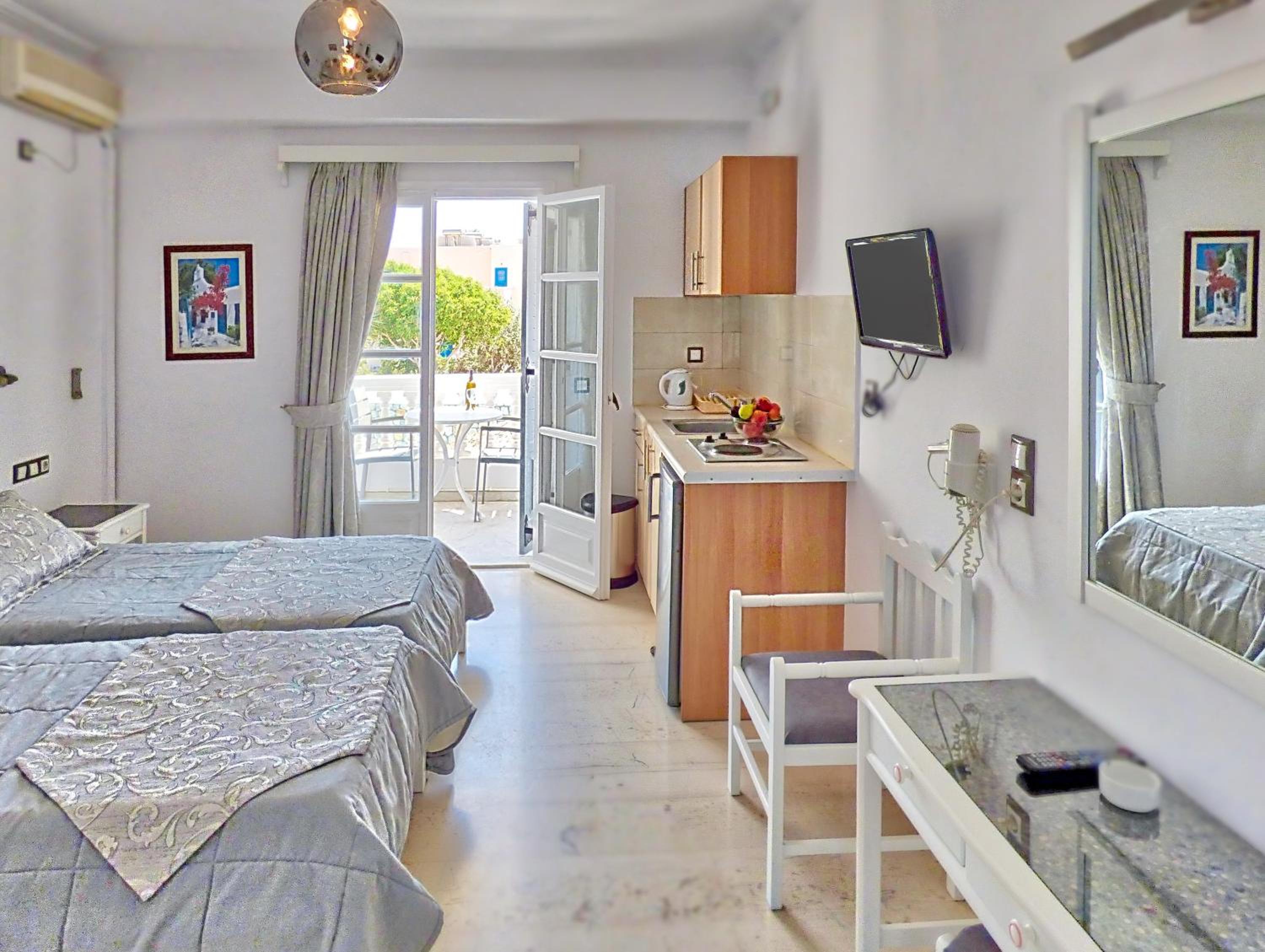 Comfortable Rooms: Each room at Avraki comes with a private balcony offering stunning garden views, ensuring a peaceful stay. The rooms are equipped with air conditioning, ensuring a comfortable environment, and a desk for convenience.
