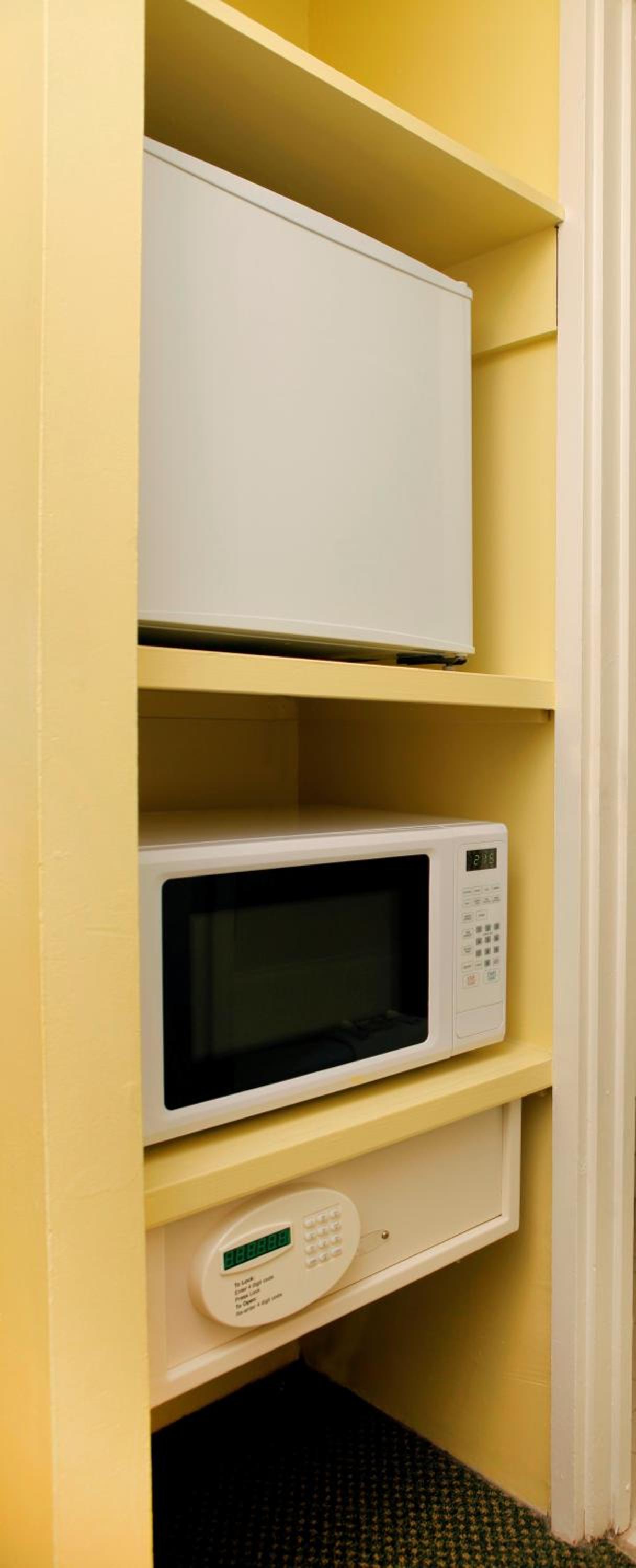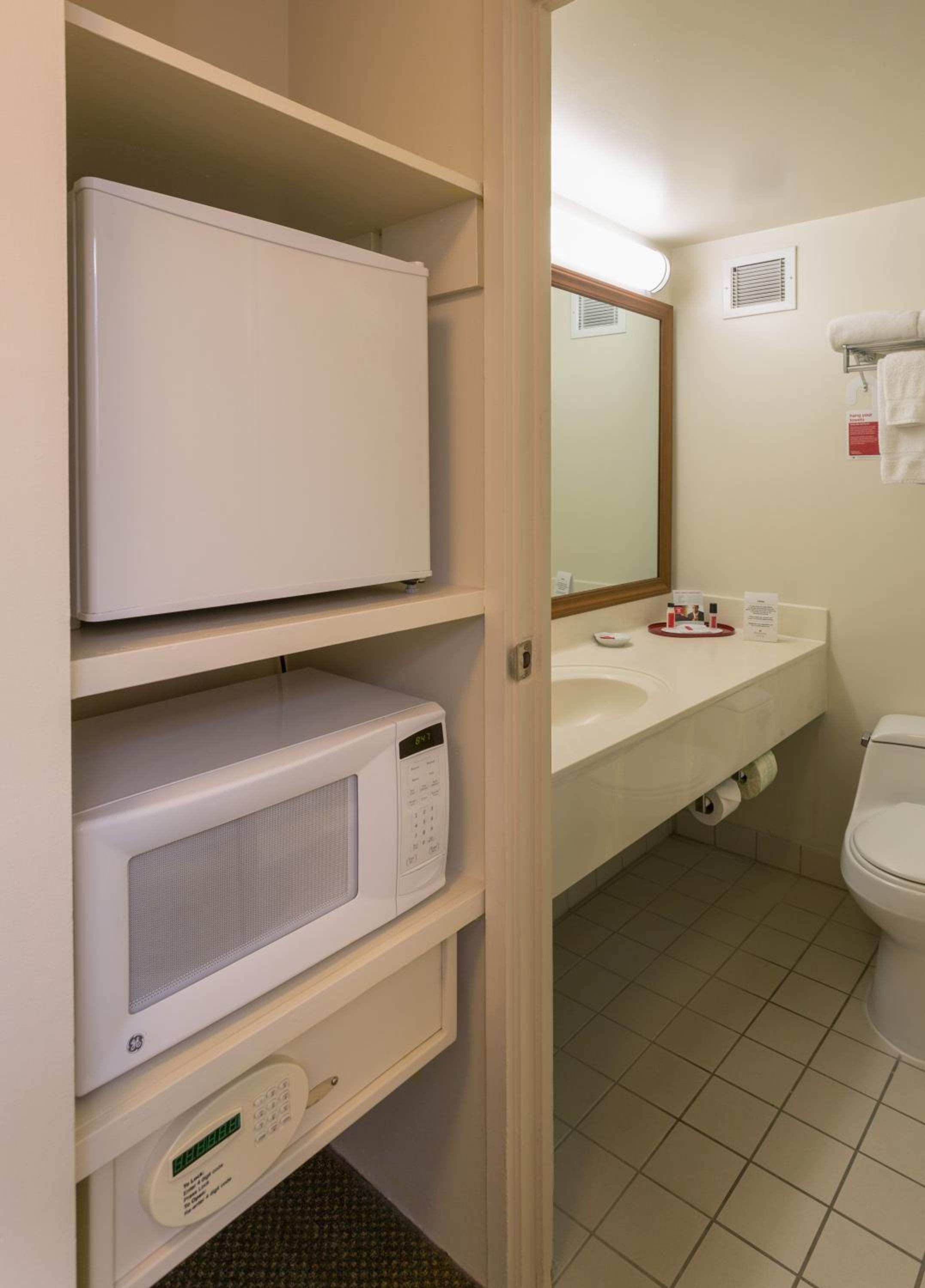 Each room at the hotel is equipped with modern amenities such as flat-screen HDTVs, mini-refrigerators, microwaves, and coffee-making facilities, ensuring a comfortable stay for guests.