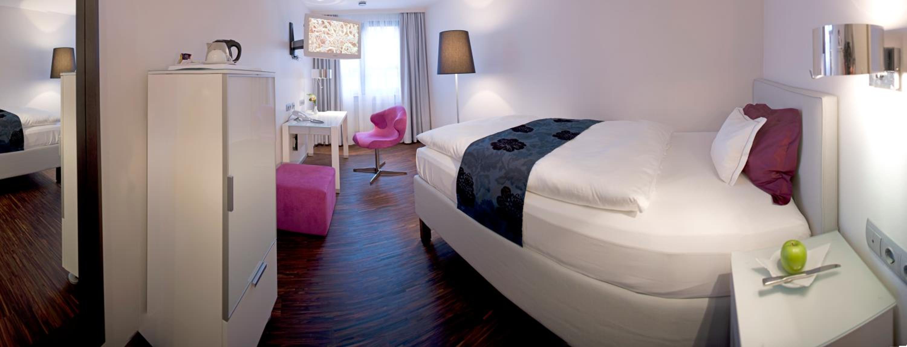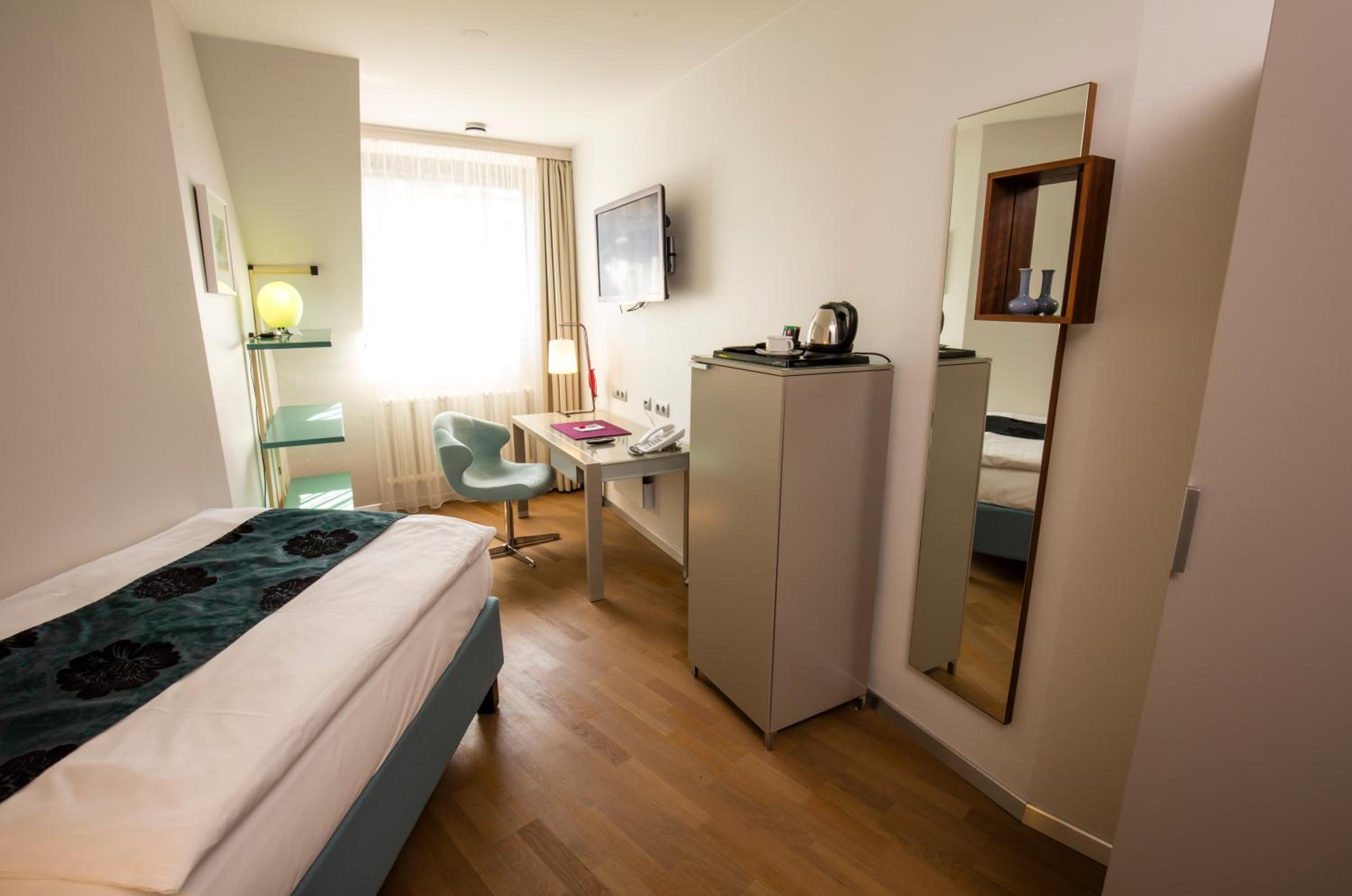 This hotel is a short walk from the station and also from the DFKI where I was working.It is also only 20 minutes from down town. The staff are very welcoming and helpful and the hotel is bright and airy.