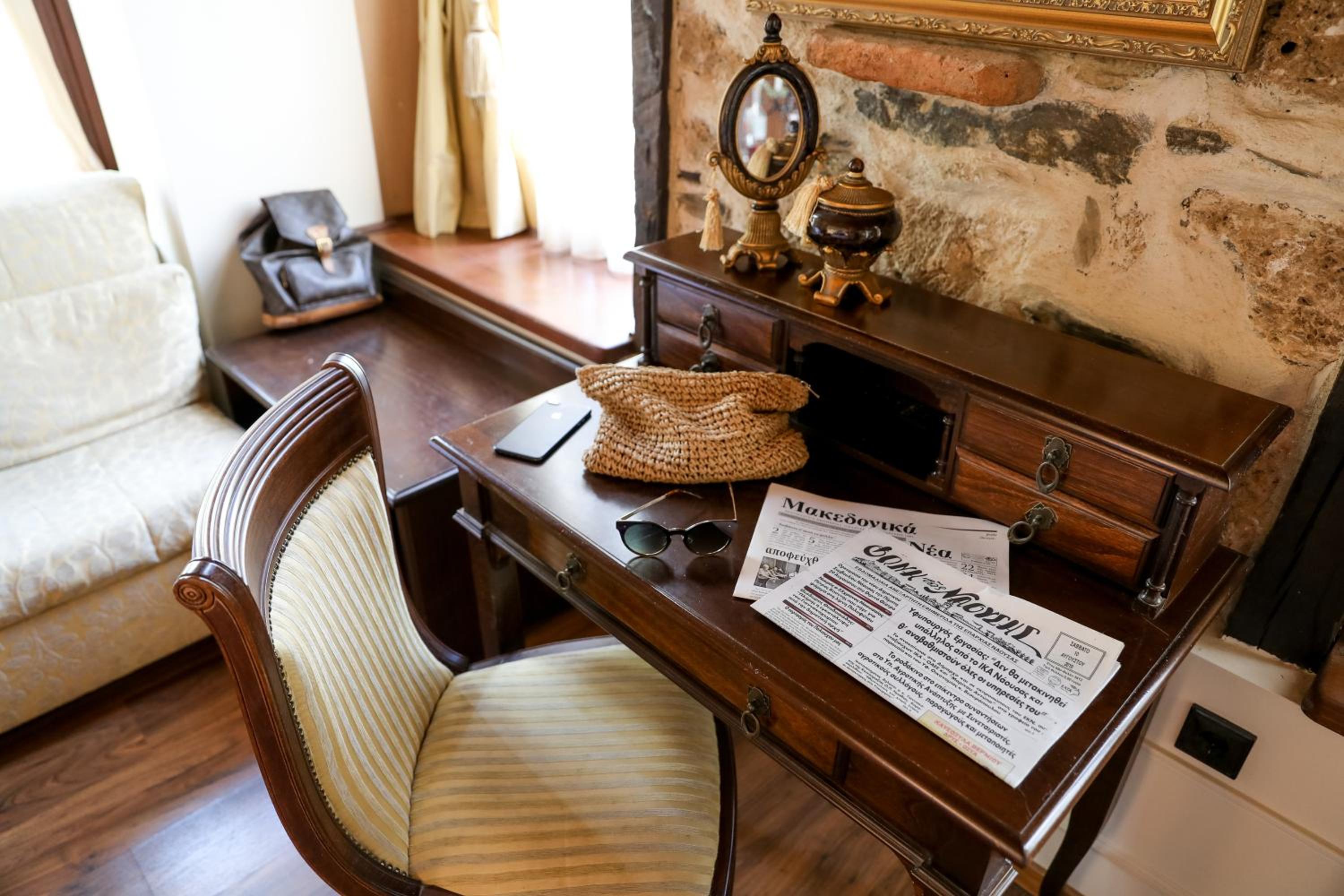 Super nice couple who run the inn. The hosted the best breakfast we’ve had in Greece!! Our host gifted us with his beautiful stories of being an Olympic Super slalom & downhill skier after we commented on the cool wooden skis adorning the fabulous inn. The location was great for cruising around town & soaking in the views.