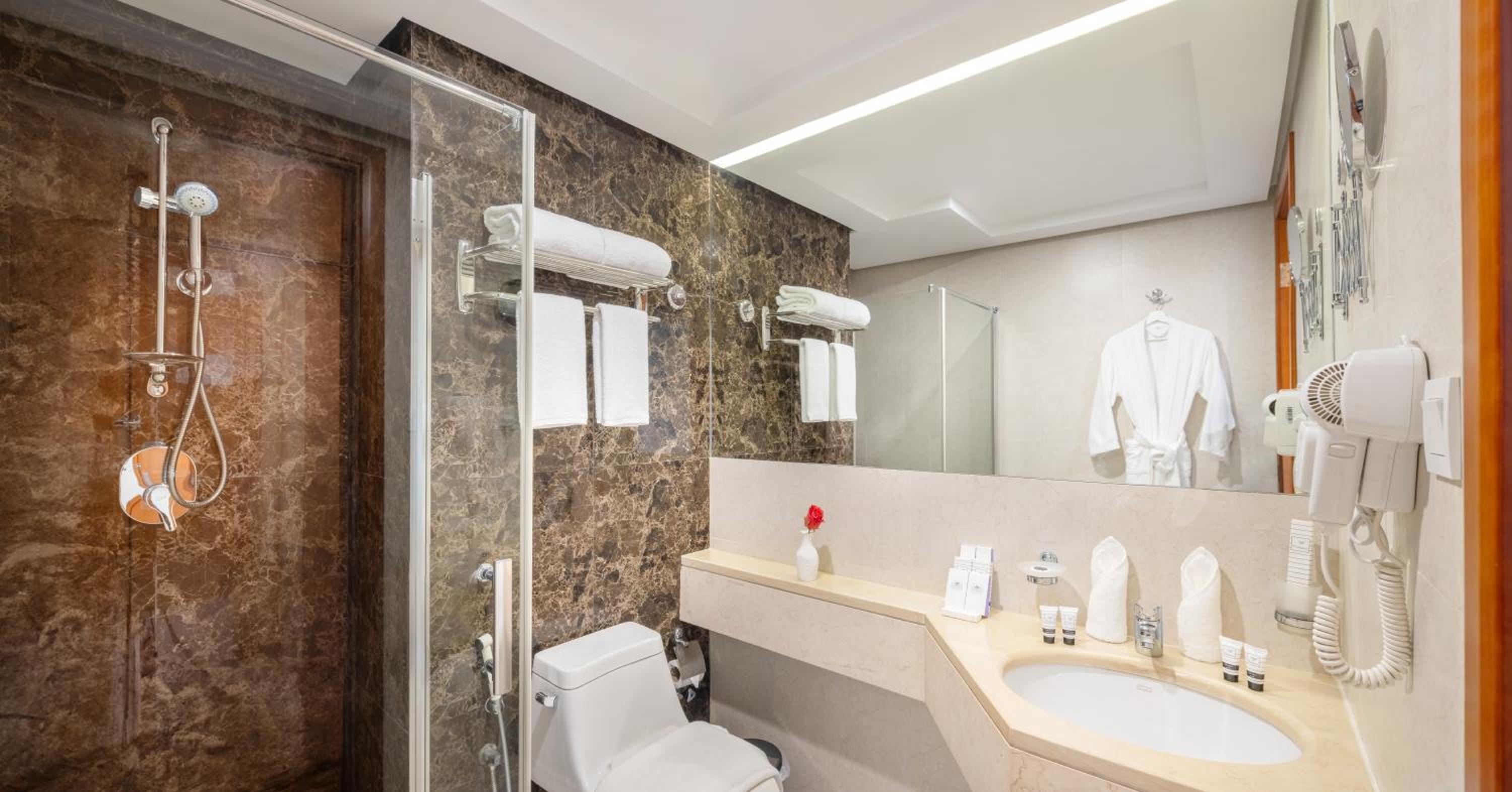 Modern Amenities: Each room is well-equipped with a flat-screen TV, wardrobe, and a private bathroom with complimentary toiletries and a hairdryer. Guests can also make use of the fridge provided in the rooms.