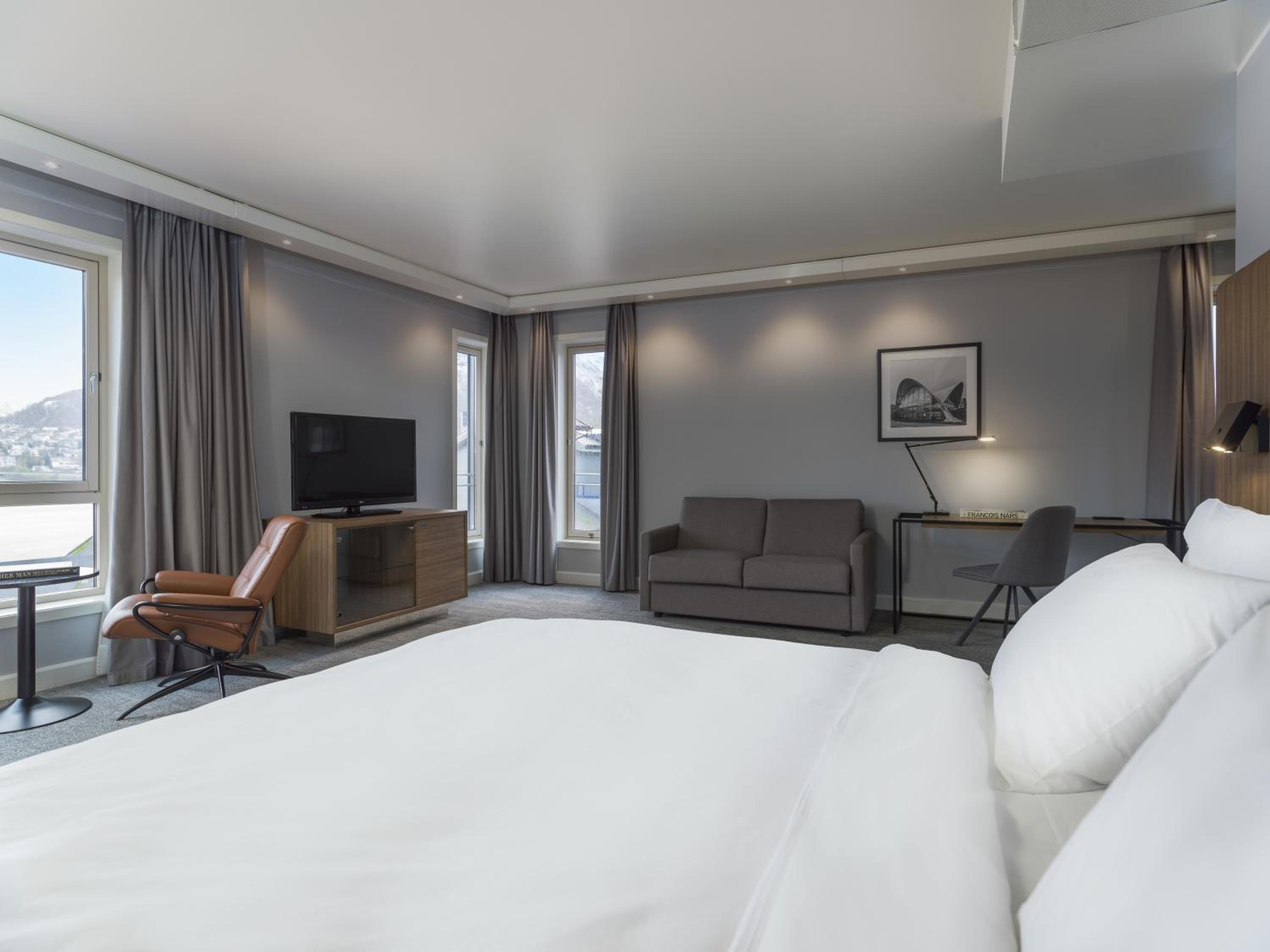 Located by Tromsø Harbour, Radisson Blu Hotel Tromsø offers heated rooms with flat-screen TVs and complimentary tea/coffee facilities. The majority of the rooms provide breathtaking views of the city, the Arctic Cathedral, or Tromsø Sound, all elegantly decorated in warm tones.