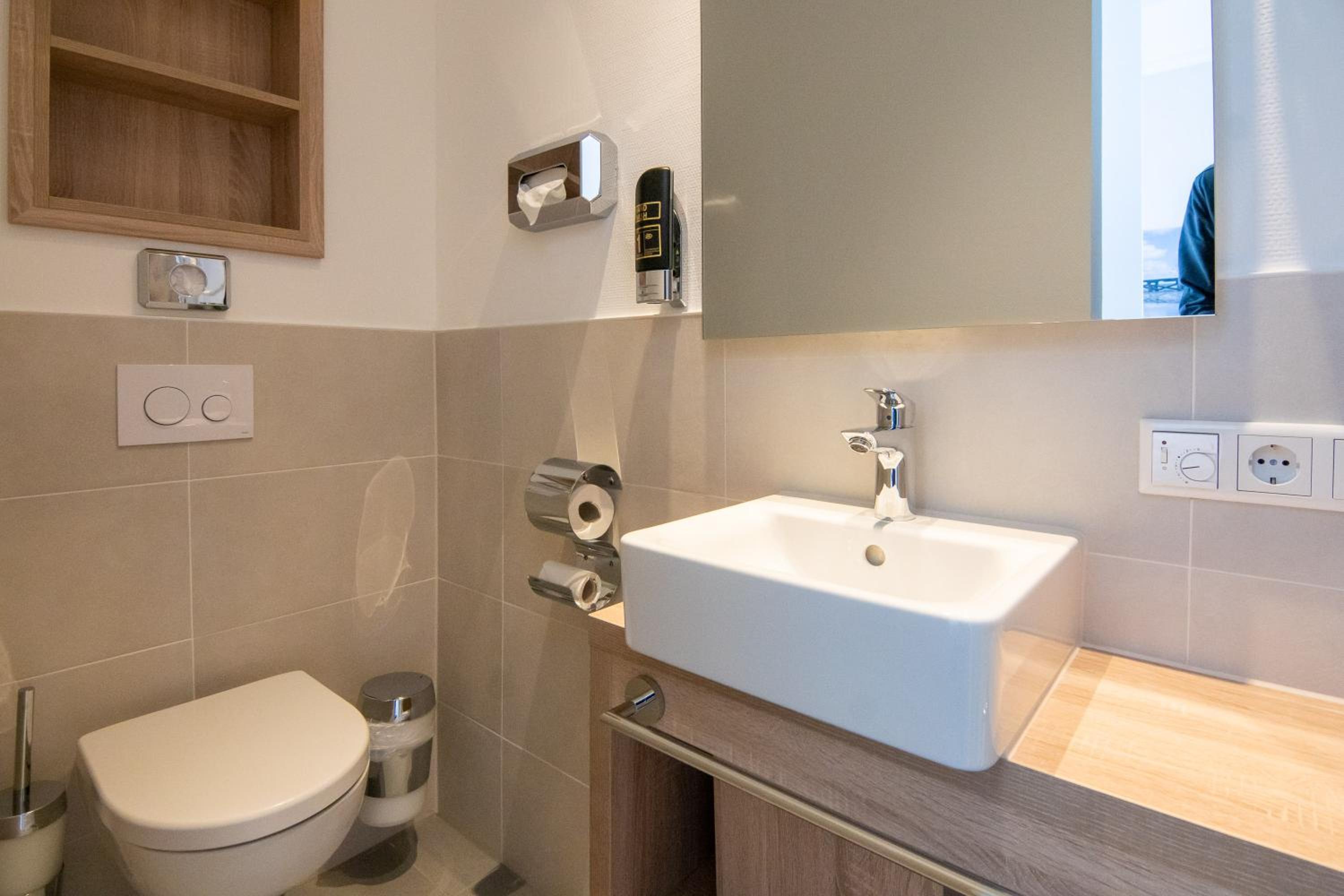 Alles sehr sauber, sehr freundliches Personal, reichhaltiges Frühstücks-Buffet. Eine Bar Nähe Hauseingang :-) Wenig Stauraum für mehrtägigen Aufenthalt. Aber es gibt ausklappbare Vorrichtung zum Aufhängen von Garderobe im Schlafzimmer und im Bad eineb Doppelhaken oben an der Duschtür.