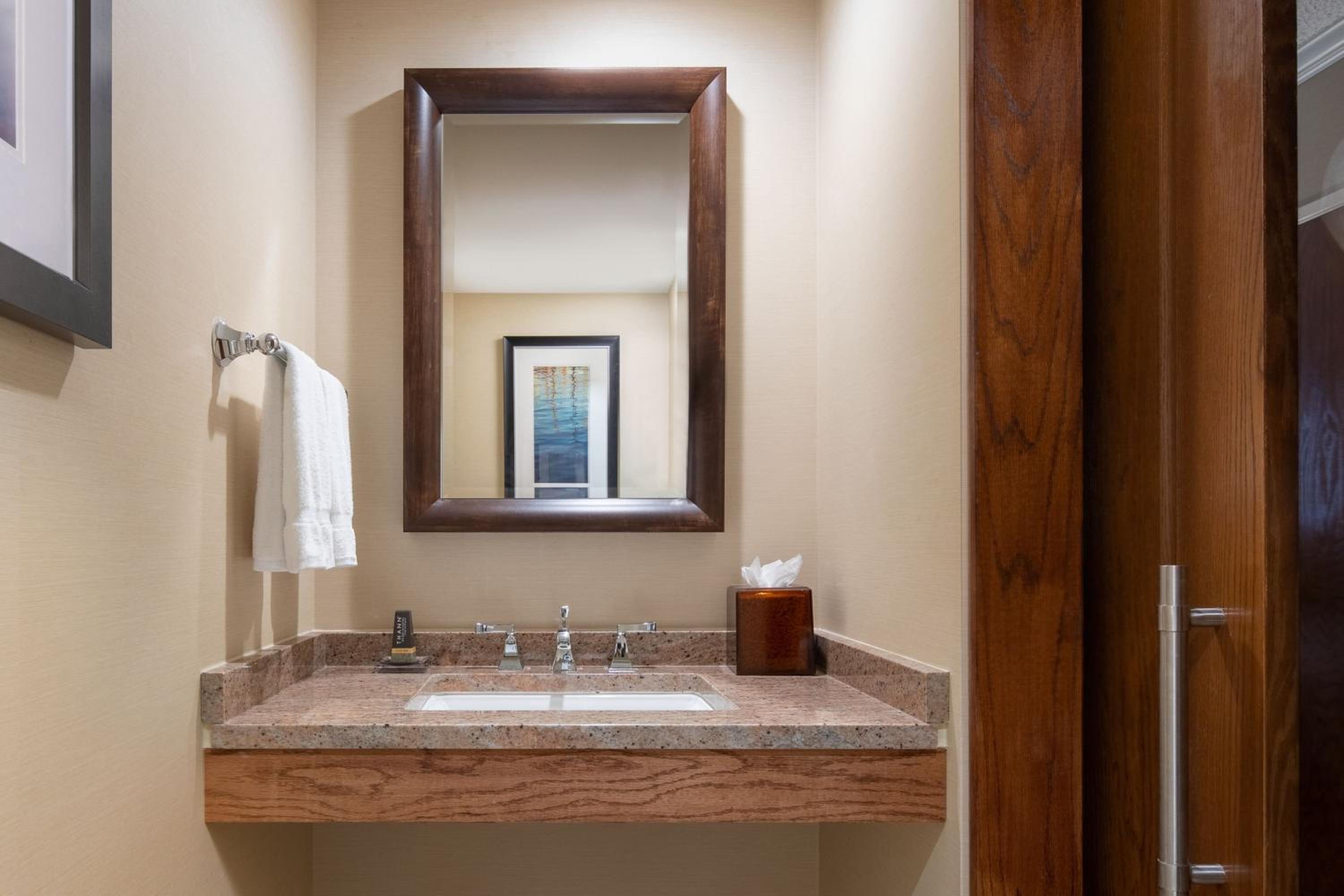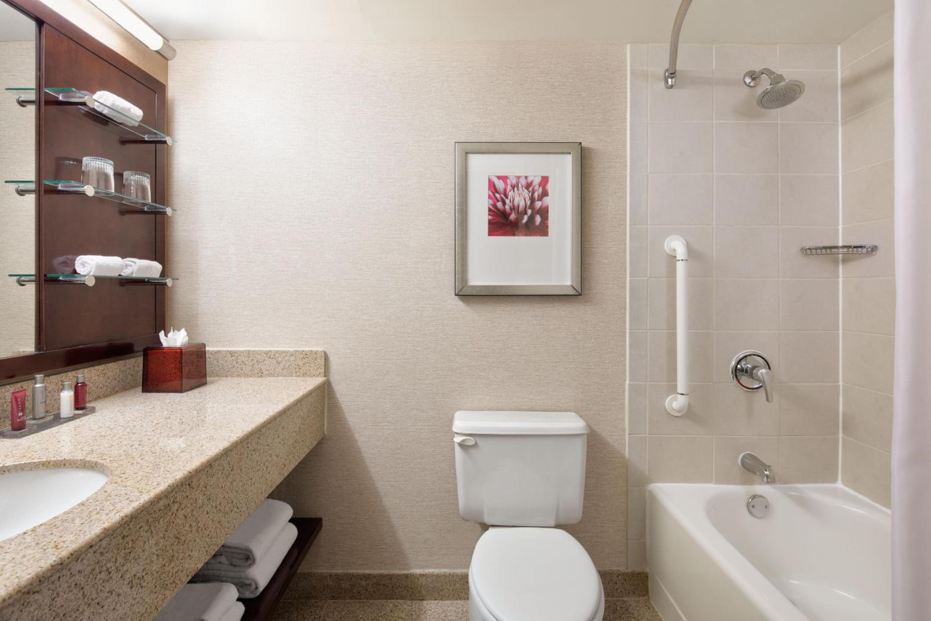 Indulge in our elegantly designed rooms featuring flat-screen TVs, granite countertops, and marble floors. Enjoy the convenience of ironing facilities, work desk, and complimentary toiletries for a comfortable stay.