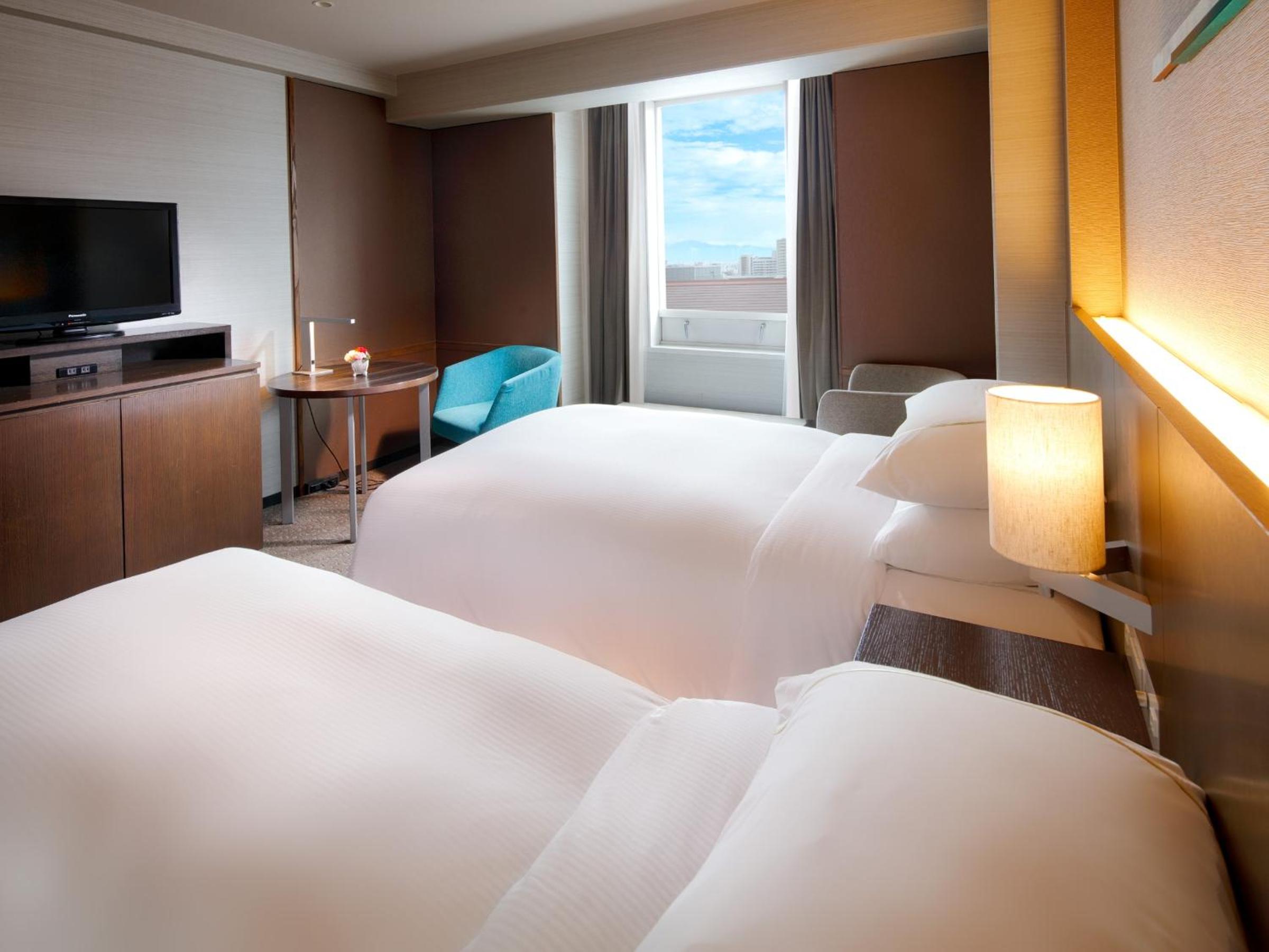 The Sheraton Miyako Hotel Osaka offers spacious non-smoking rooms with free WiFi, a minibar, and comfortable sleepwear provided daily.