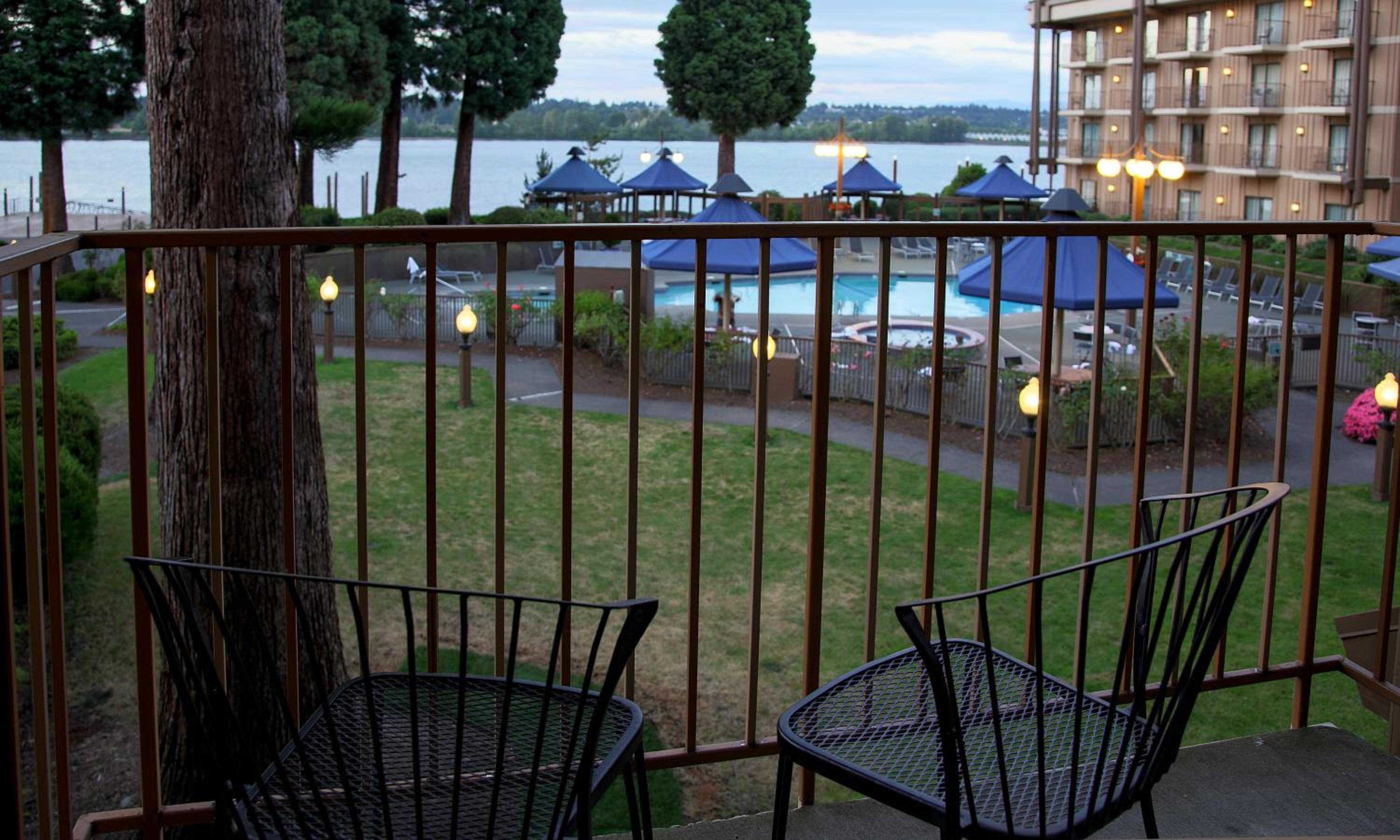 Fantastic views, access to dock, balconies, great pool with a lovely temperature. The hot tub was essential and very nice. All right on the river. The restaurant was fantastic! We paid at booking to add breakfast and it was amazing. Full menu and cooked to order. The breakfast burritos, waffles, poached eggs, and omelets were all really top notch. And we chose to eat dinner there both nights as well! The French dip, Mediterranean salad, salmon, caprese and fries were all very delicious! The lemon water in the lobby was an extra nice touch. We really appreciated it. The place feels very welcoming and we would definitely stay here again. Also convenient access to target for any essentials.