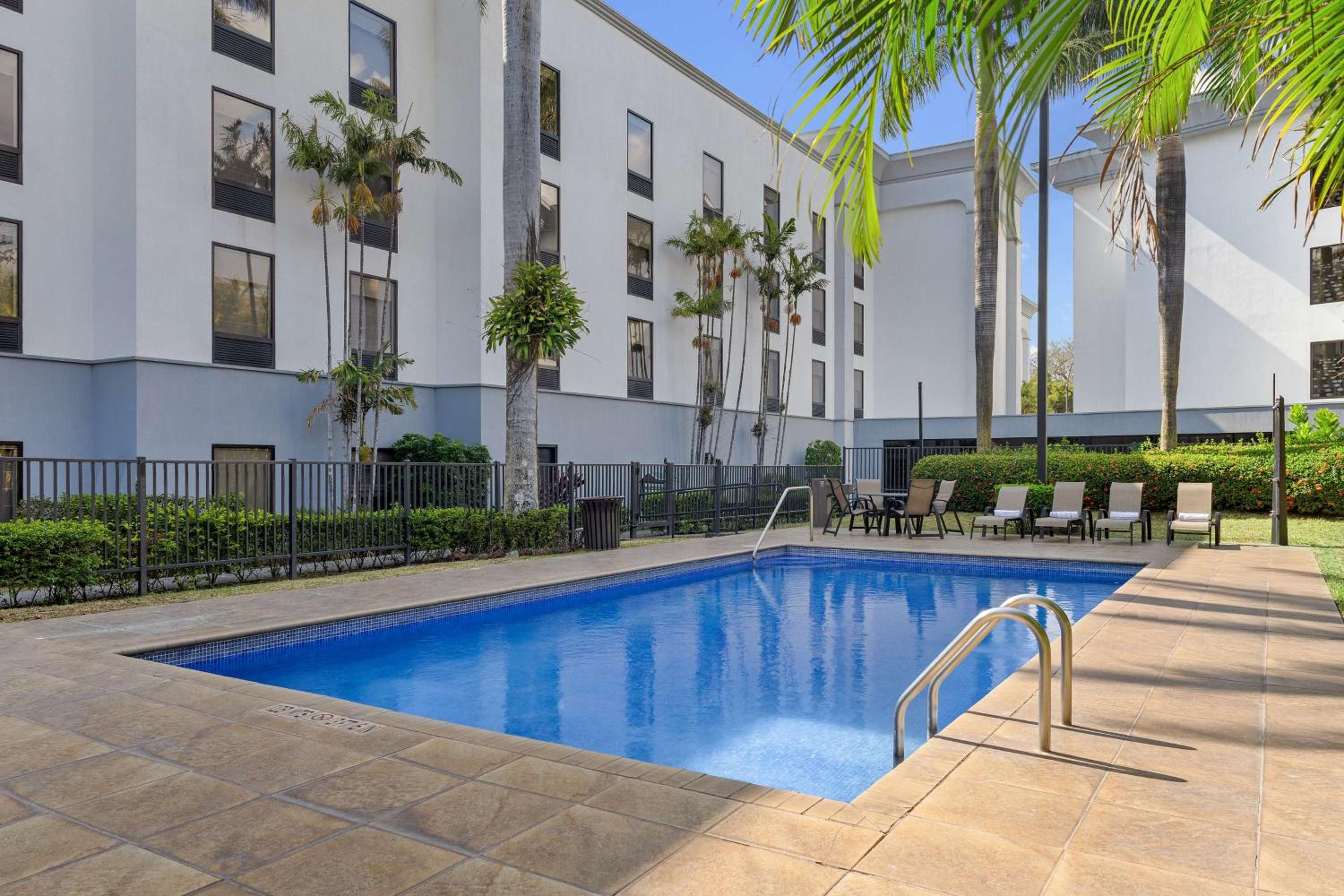 Luxurious Amenities: Hampton Inn & Suites offers a large pool, a gym, free Wi-Fi, and complimentary airport transfers for a convenient stay.