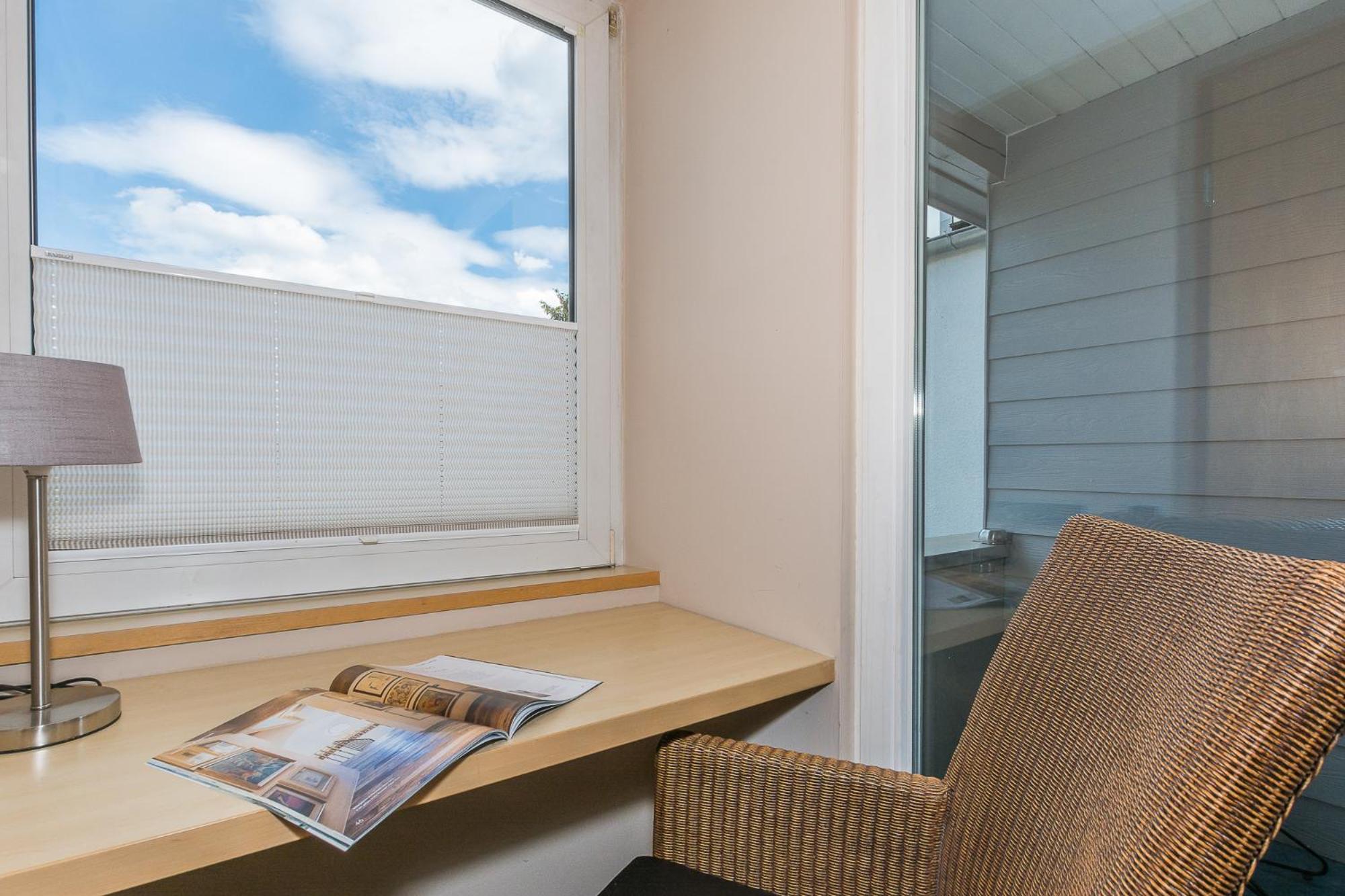 Kleines Zimmer, kleines Bad, Glastür zum Bad.