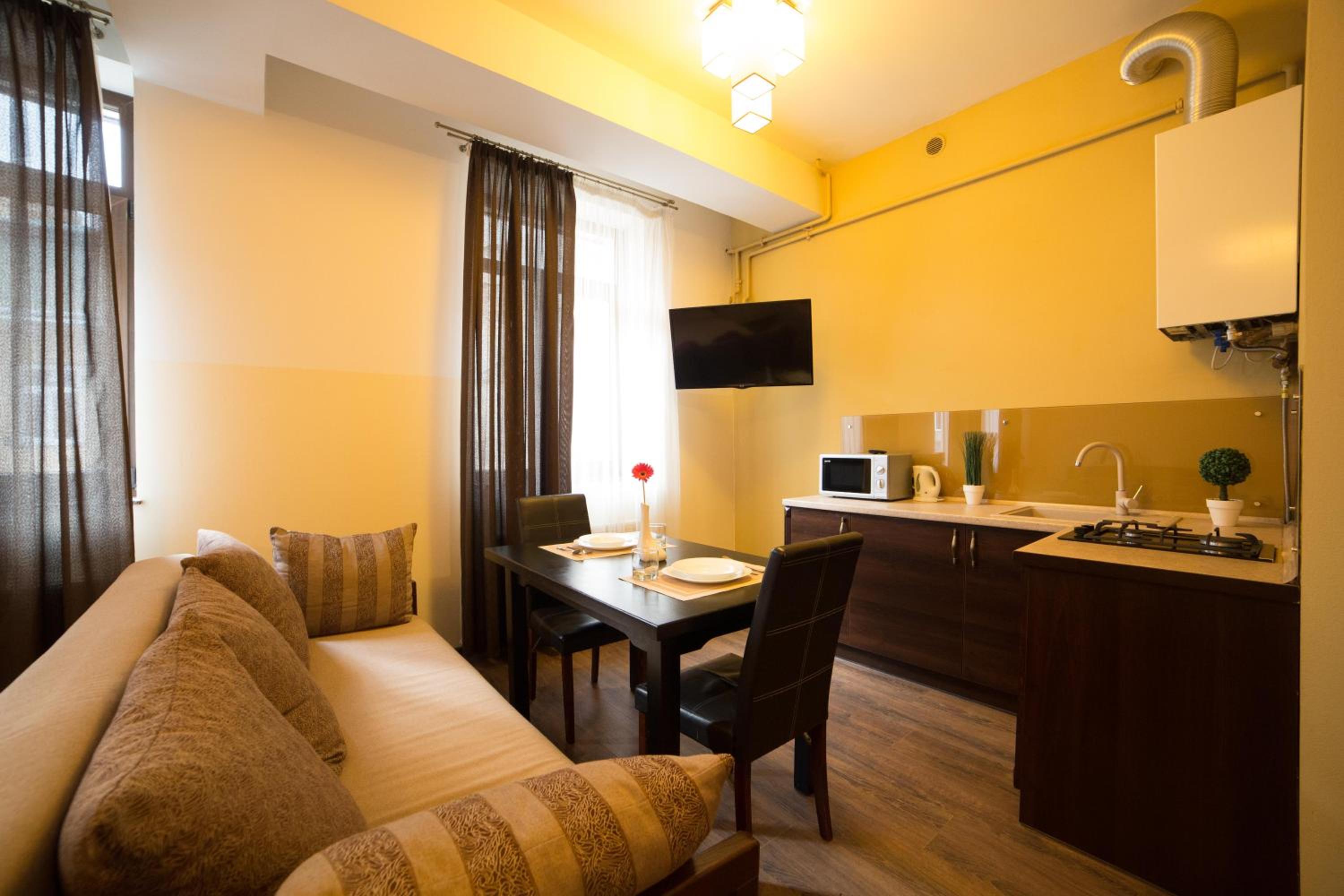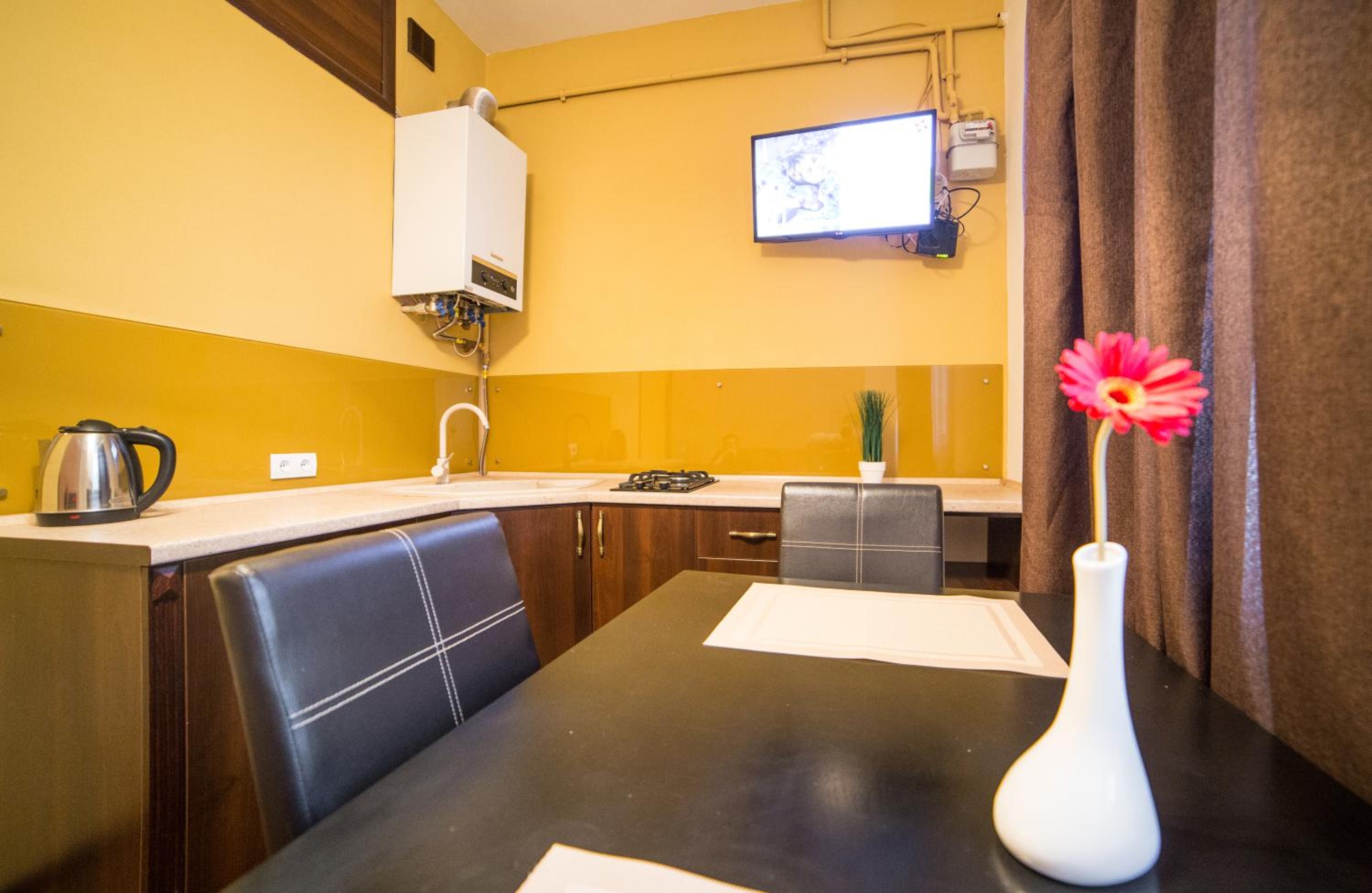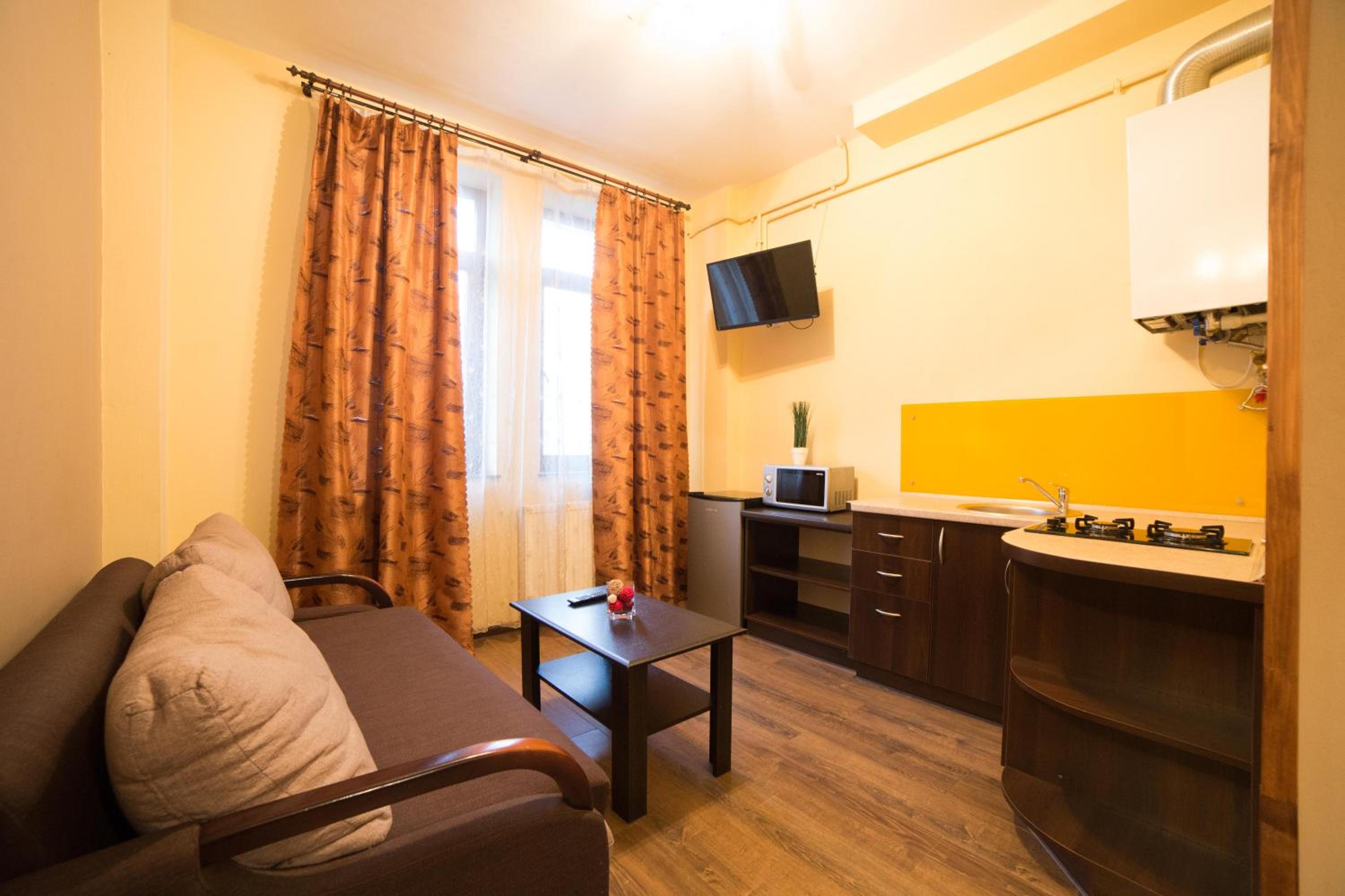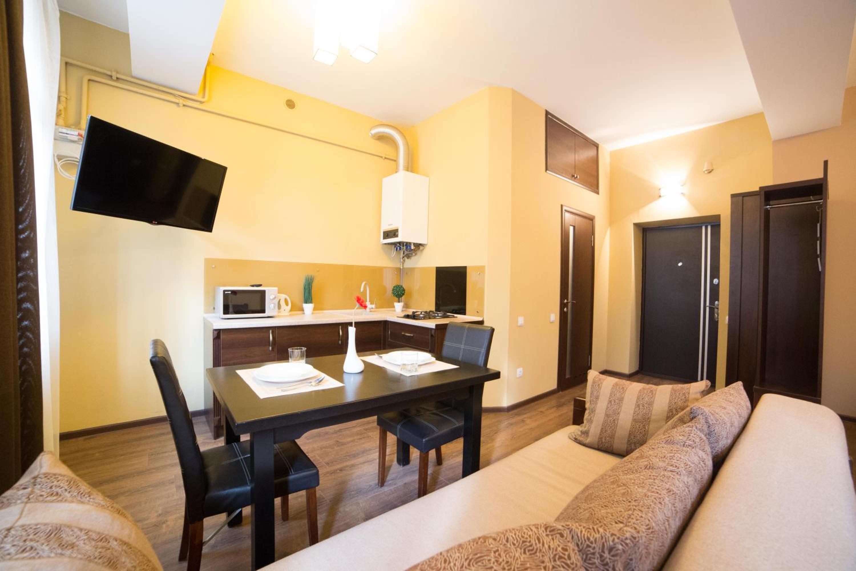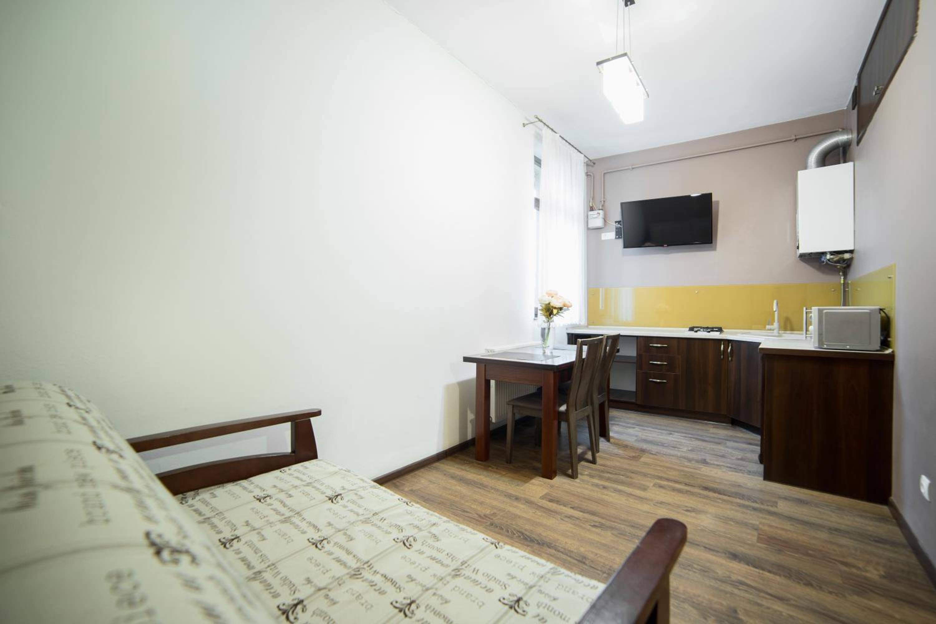 Aparthotel Na Mytniy in Lviv offers upscale accommodation with modern amenities. Each unit is equipped with a flat-screen TV, kitchenette, and a private bathroom ensuring a comfortable stay for guests.