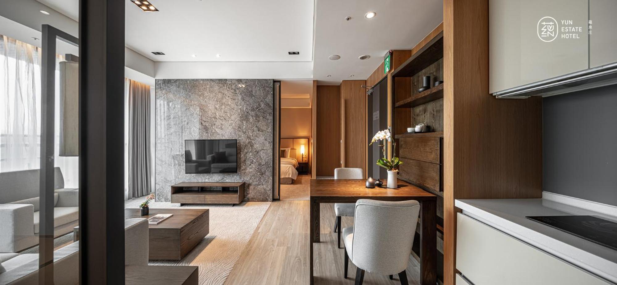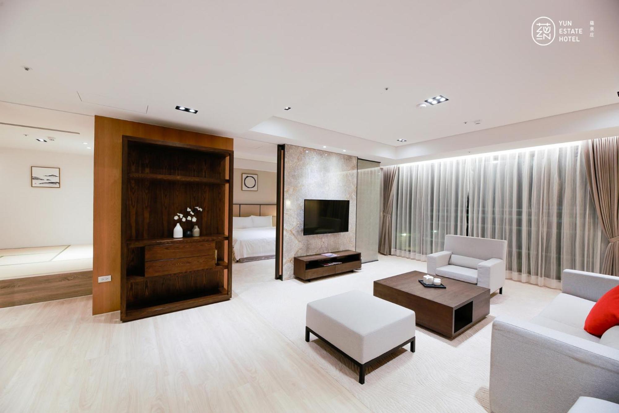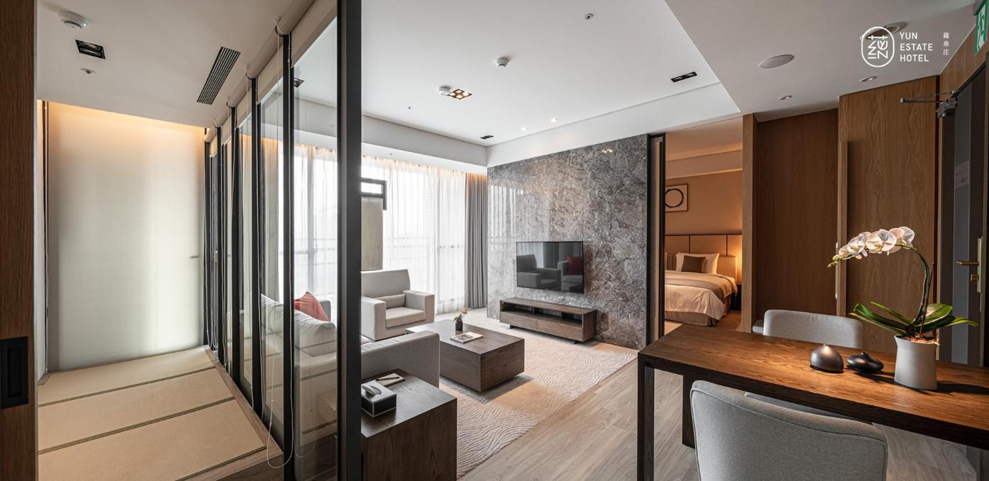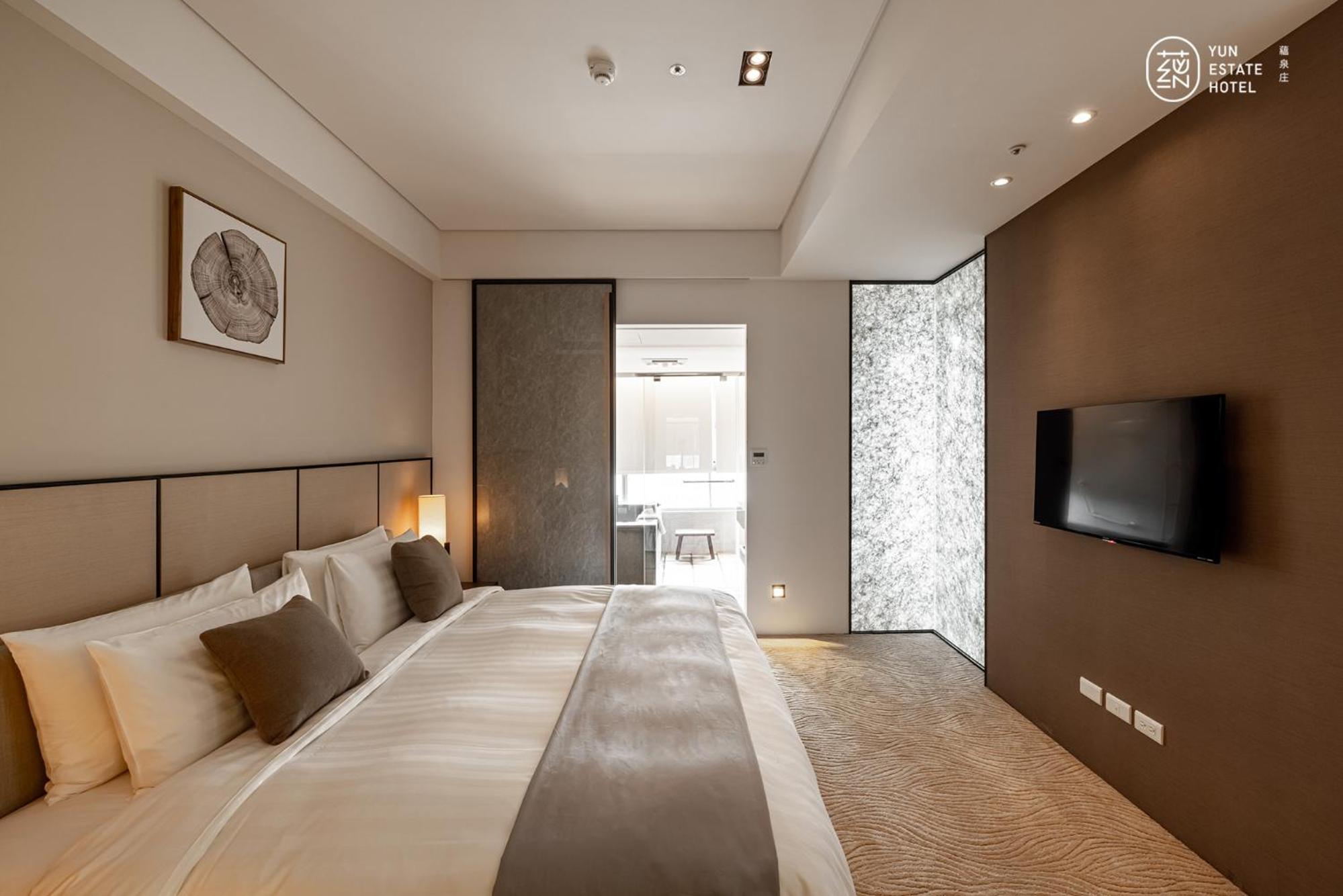 Experience comfort and style at 蘊泉庄 Yun Estate Hotel in Tamsui. Indulge in air-conditioned rooms with modern amenities like a coffee machine, flat-screen TV, and a private balcony.