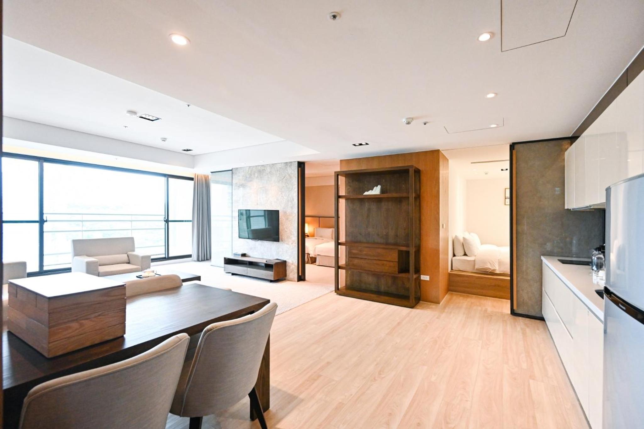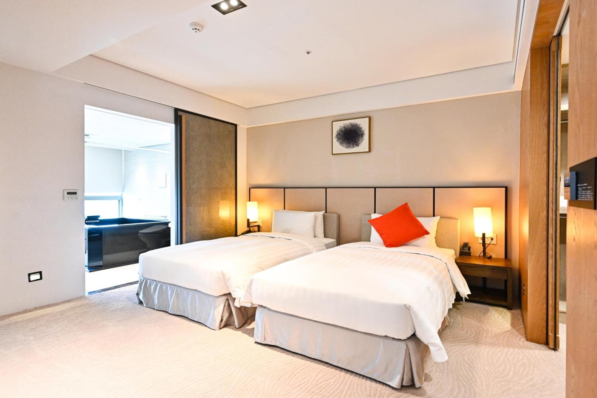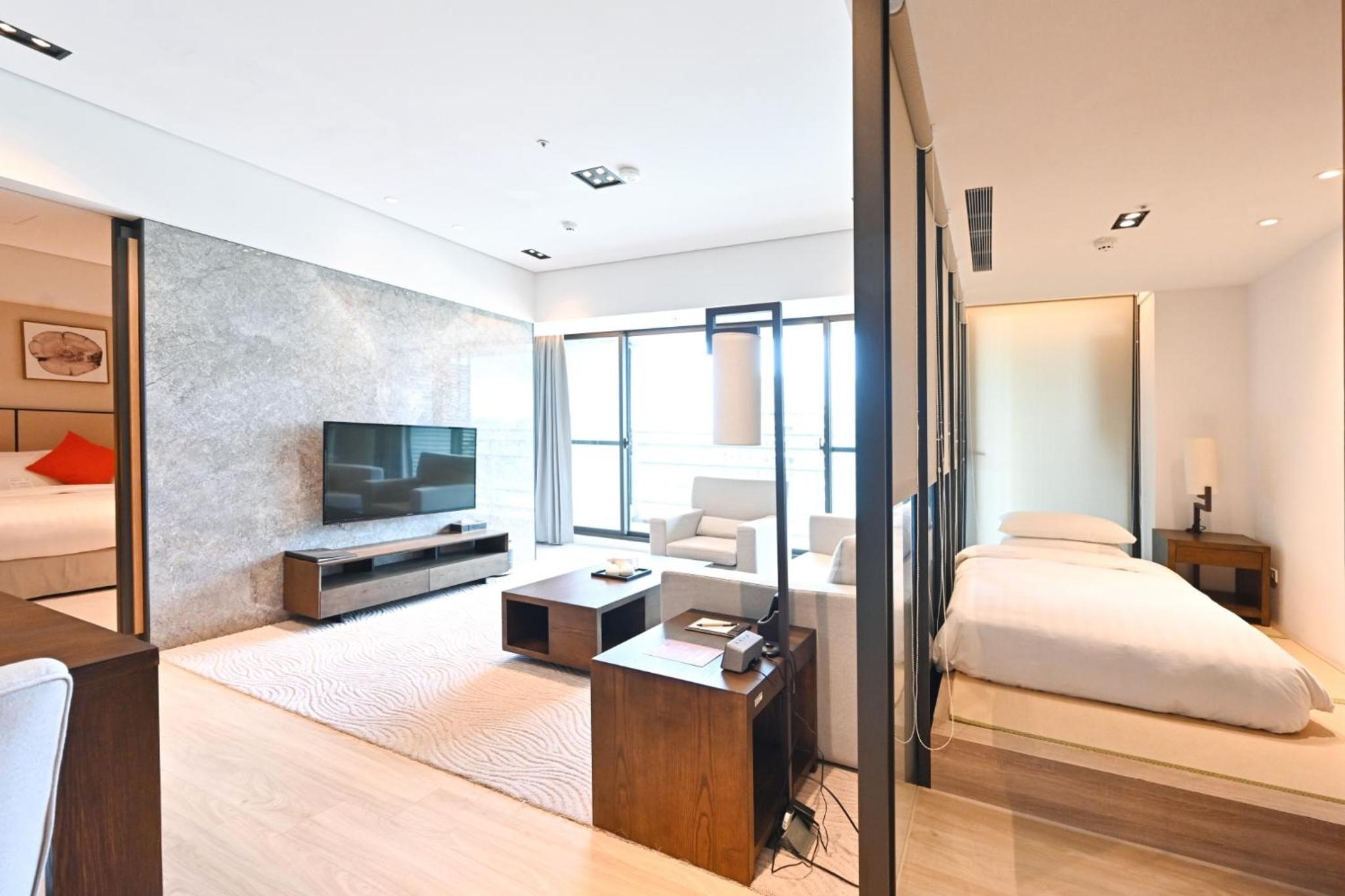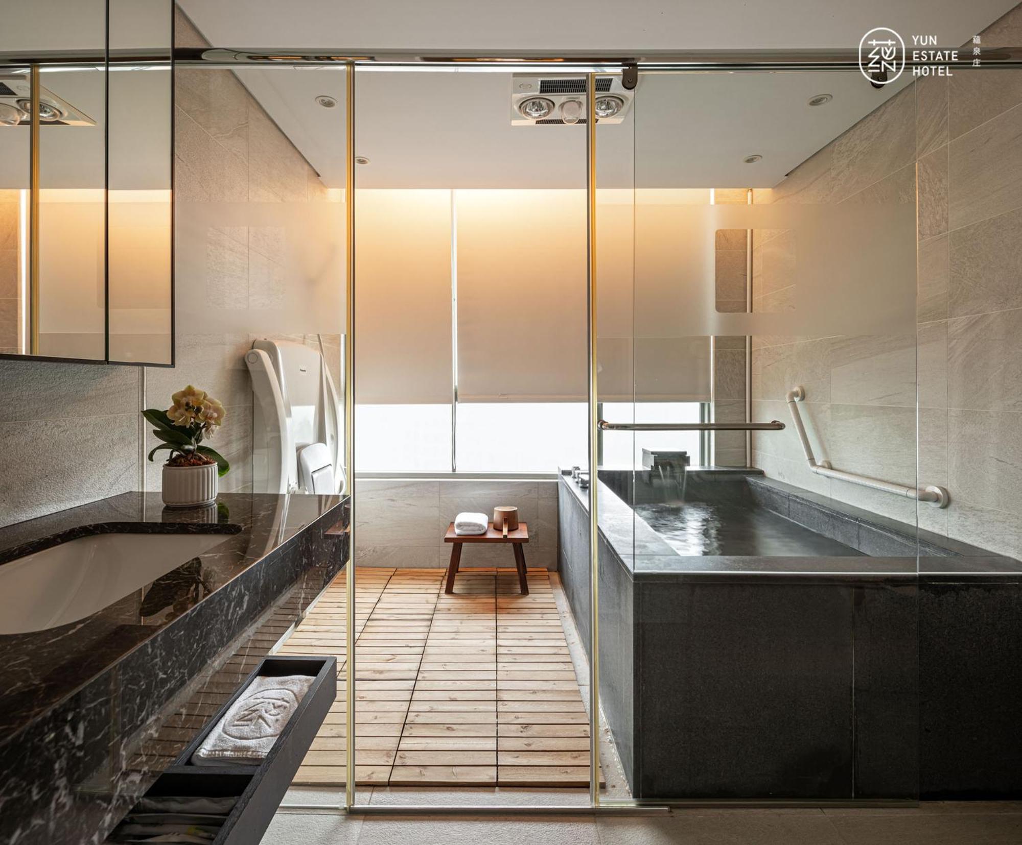 Experience comfort and style at 蘊泉庄 Yun Estate Hotel in Tamsui. Indulge in air-conditioned rooms with modern amenities like a coffee machine, flat-screen TV, and a private balcony.