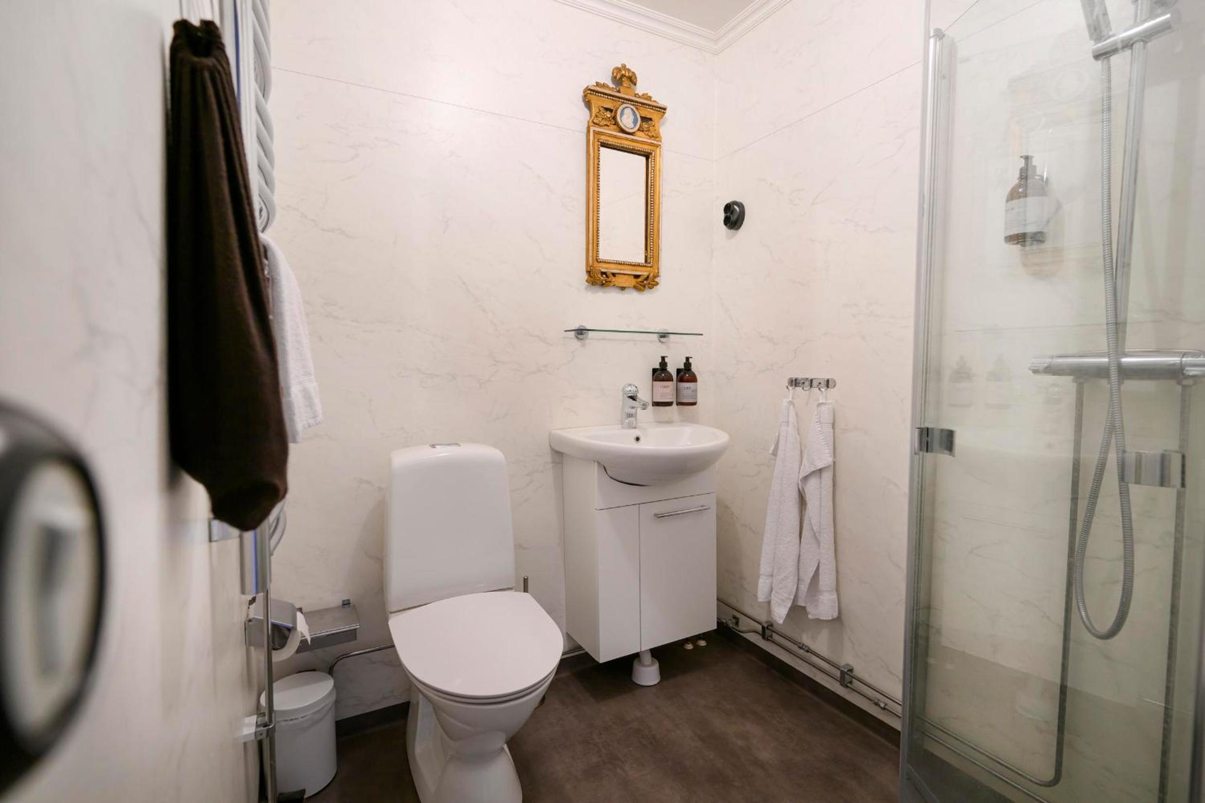 Badrummets utformning, en jättehög tröskel in och placering av toaletten var verkligen underlig.