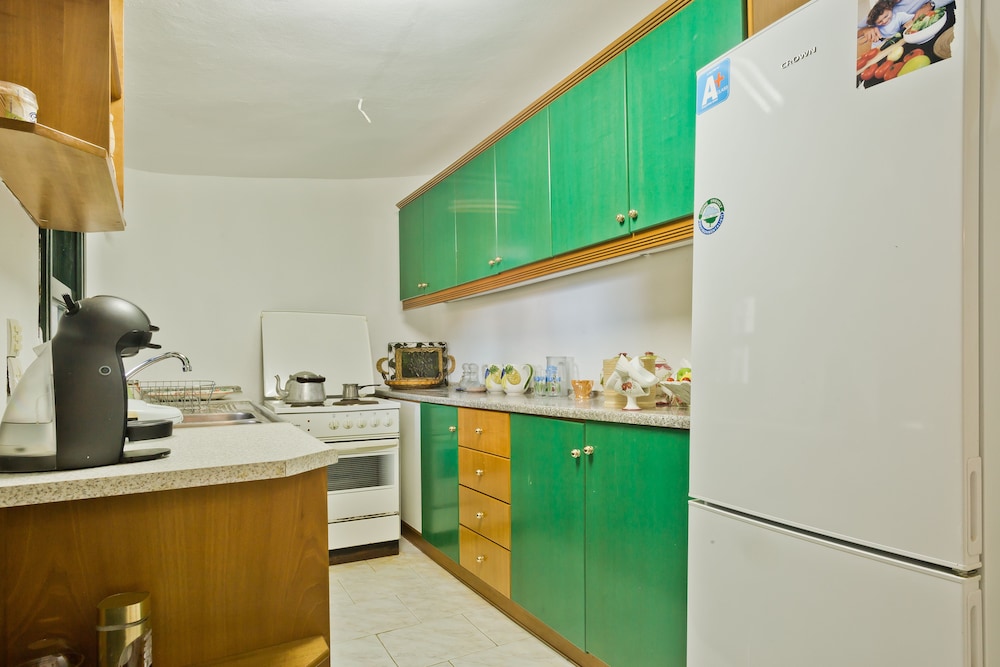 Relax in this spacious apartment that features a kitchen with modern amenities like a refrigerator and an oven.