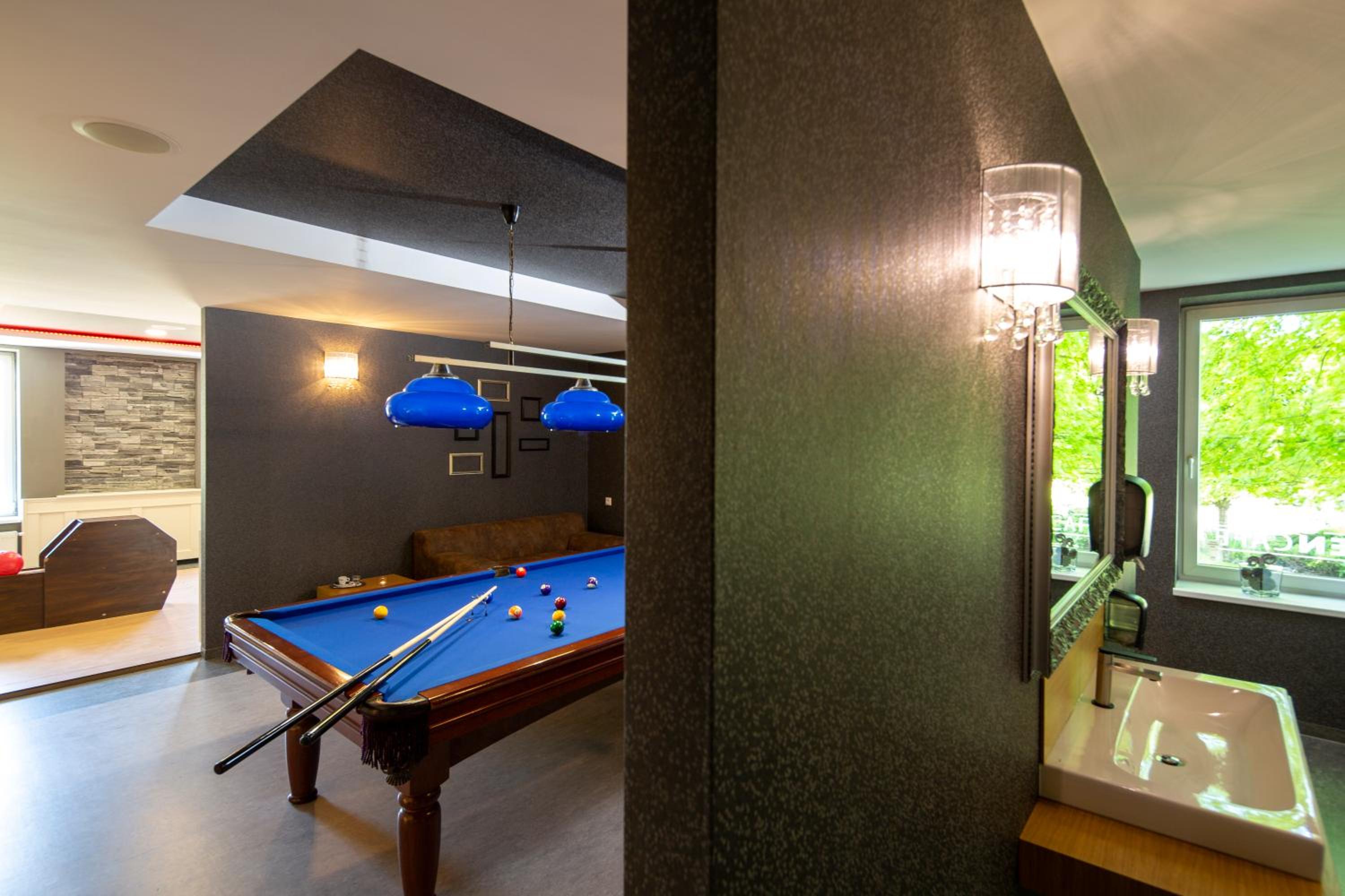 Guests can unwind at the bar with a bowling alley, enjoy a game of billiards, or relax at the sun terrace or garden during summertime. The hotel also features a children's playground and a barbecue area, providing entertainment options for guests of all ages.