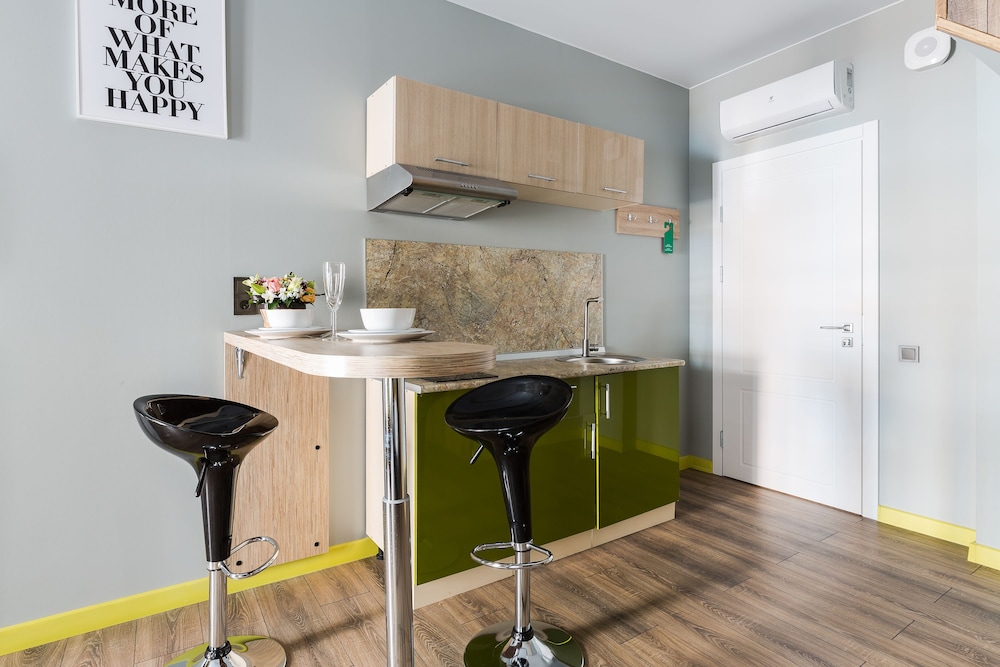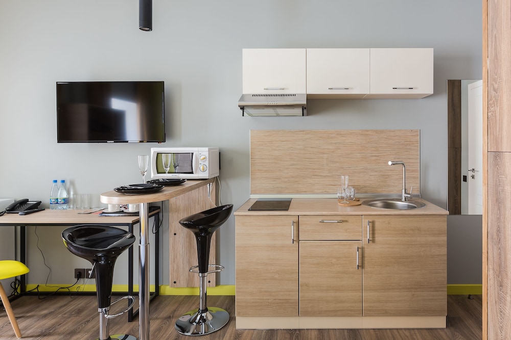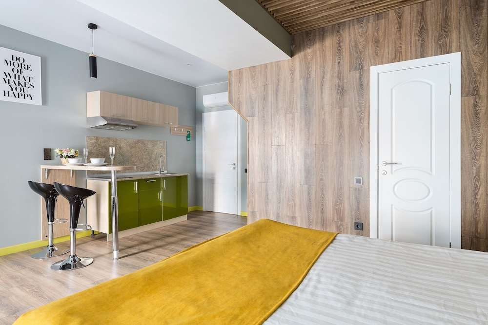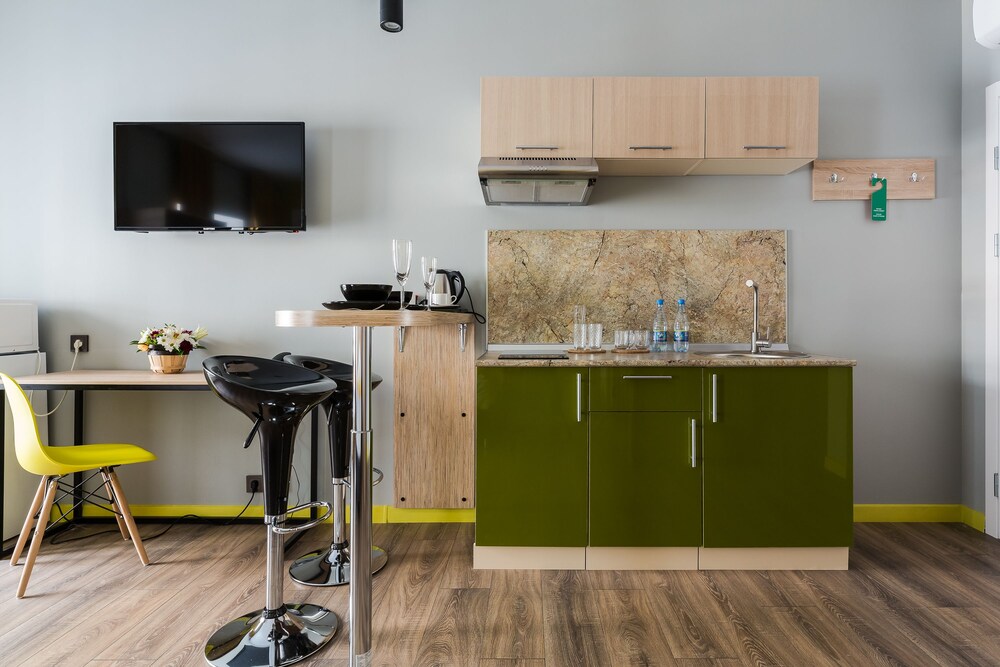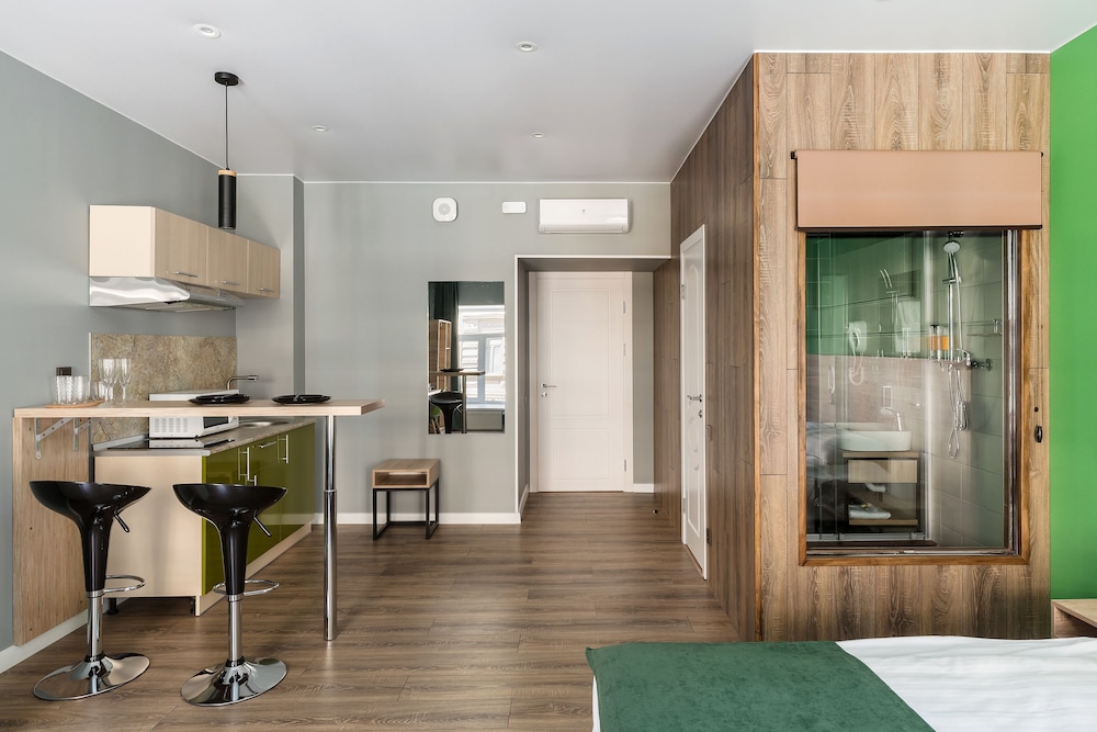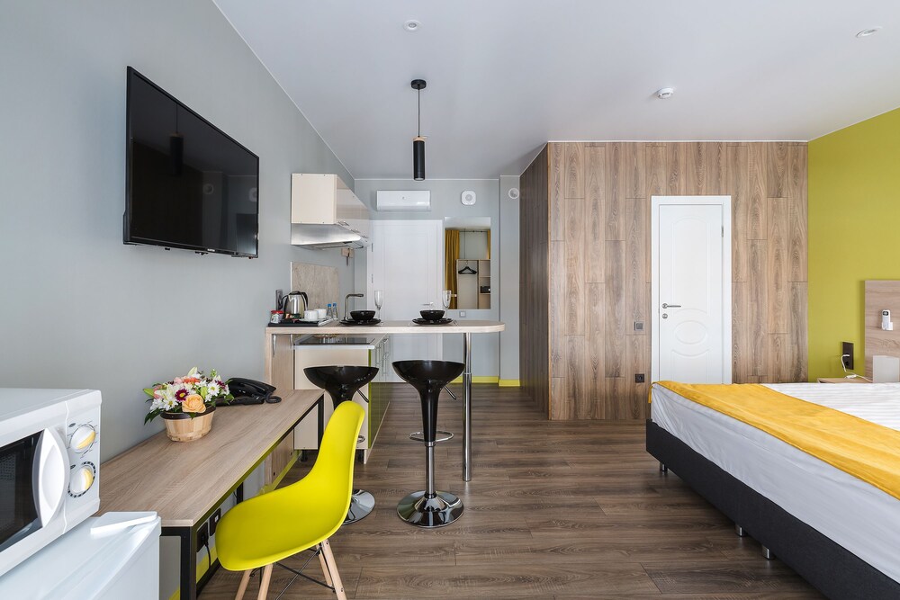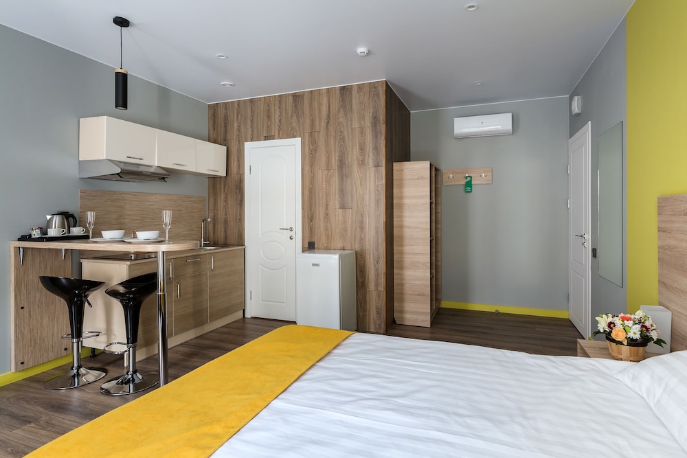 Могу сказать что бронировал я номер на двоих с кухней как на картинке а дали же номер в коморке 2на2. Персонал так вообще заселять не хотел.